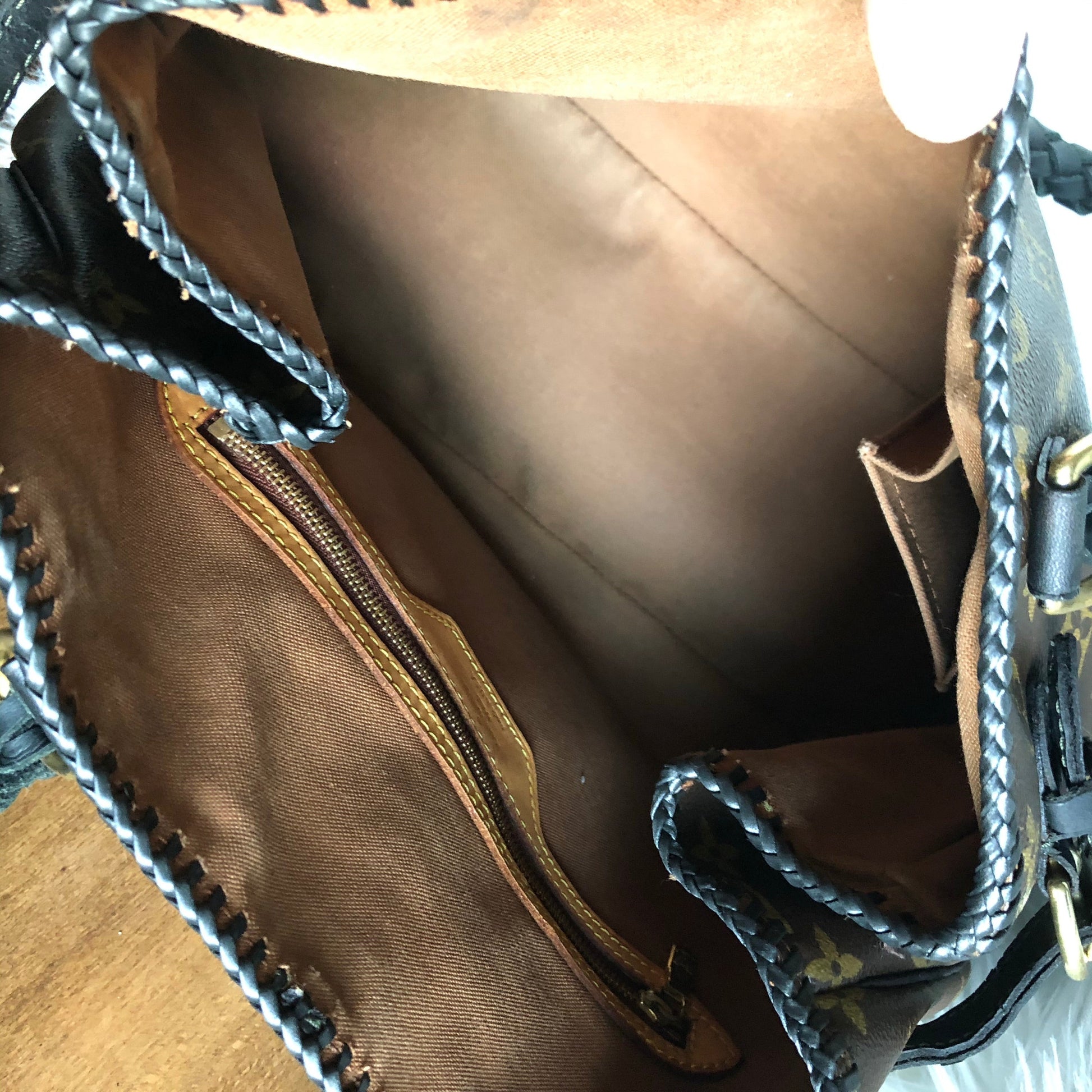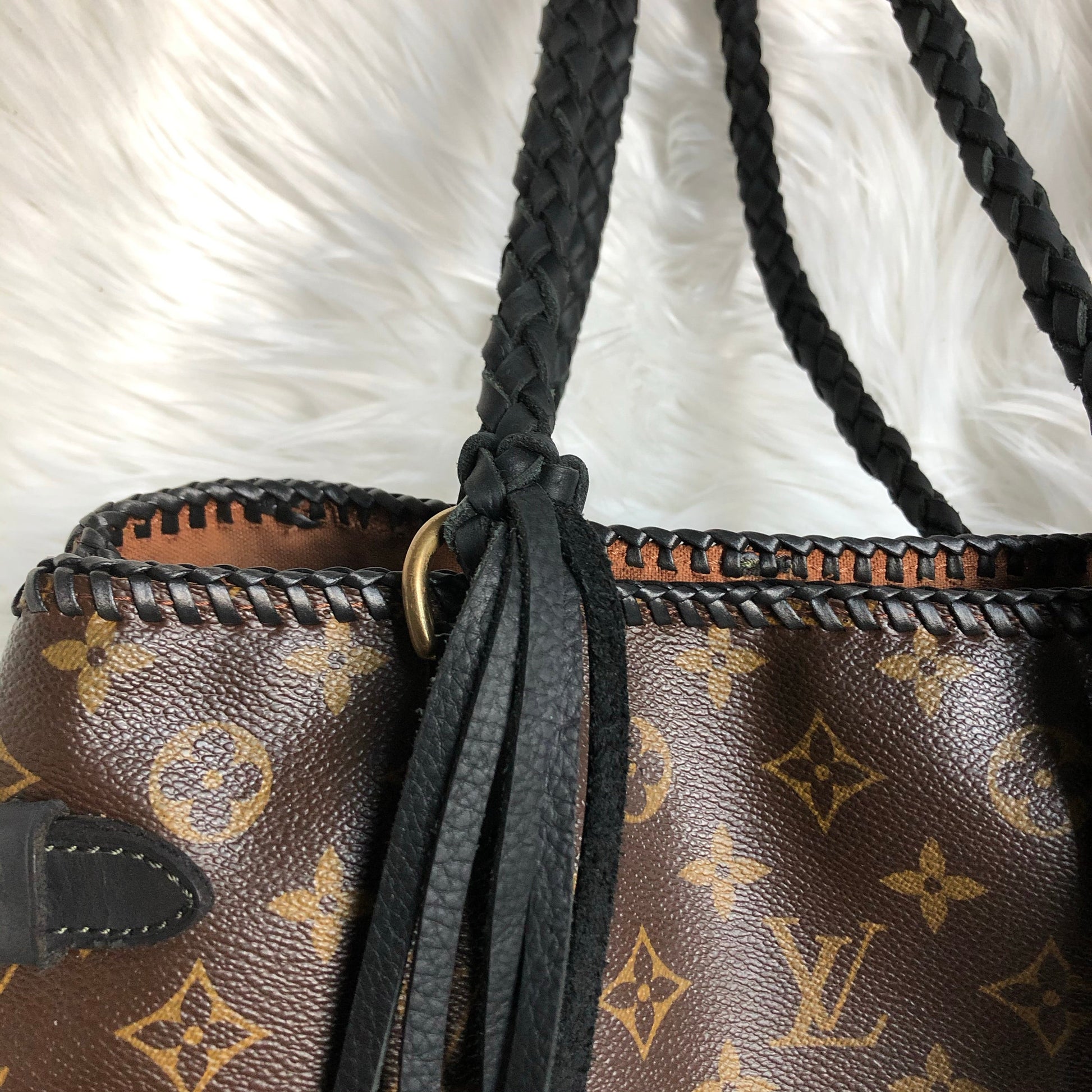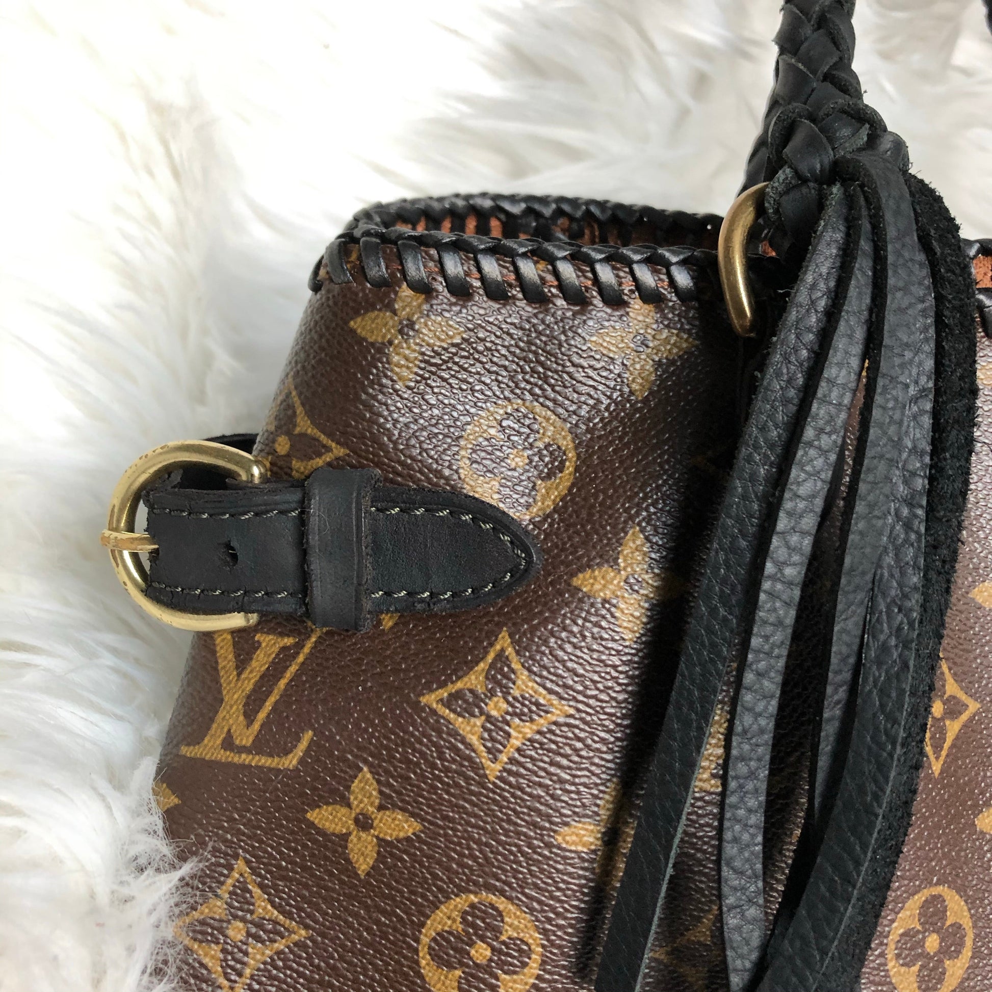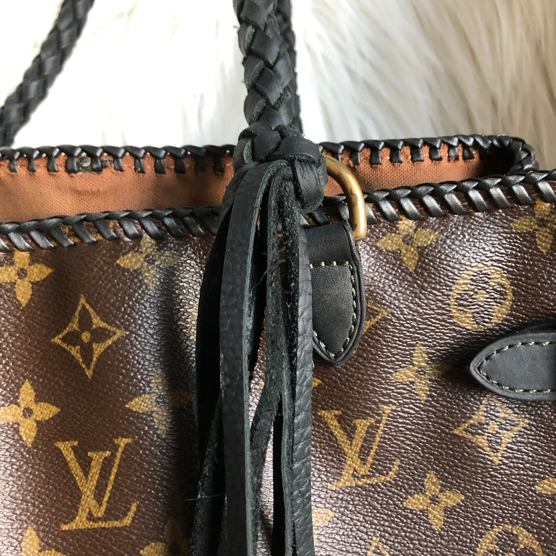 The top is stitched by hand with black leather lace. The handles were removed and replaced with black braided leather ones that have a 13" drop . The braiding is flat at the top, and then turns into a round braid with a small amount of fringe.