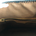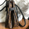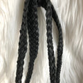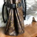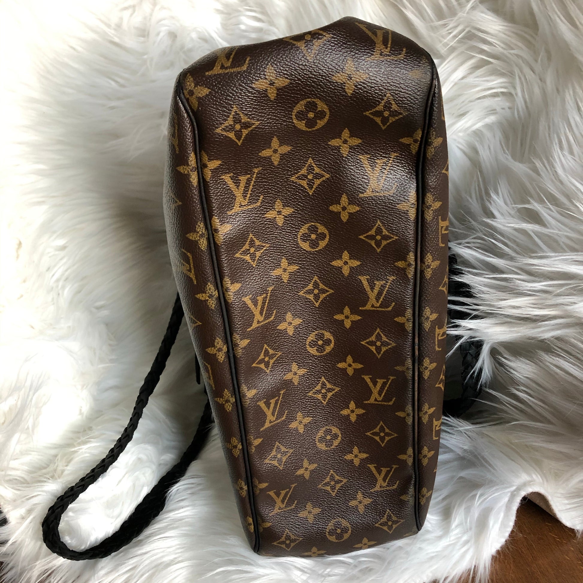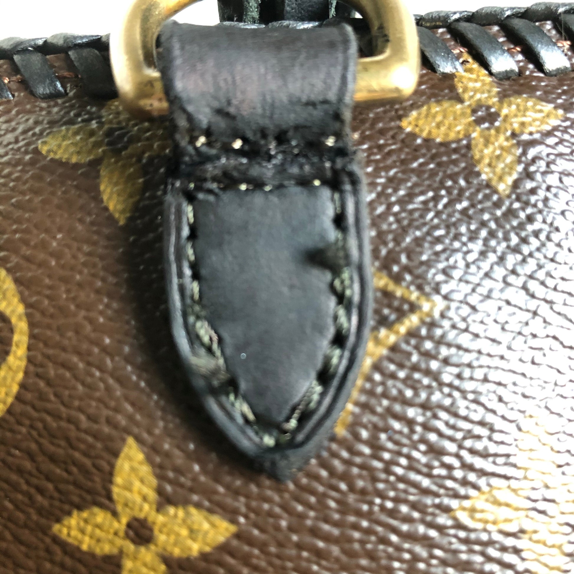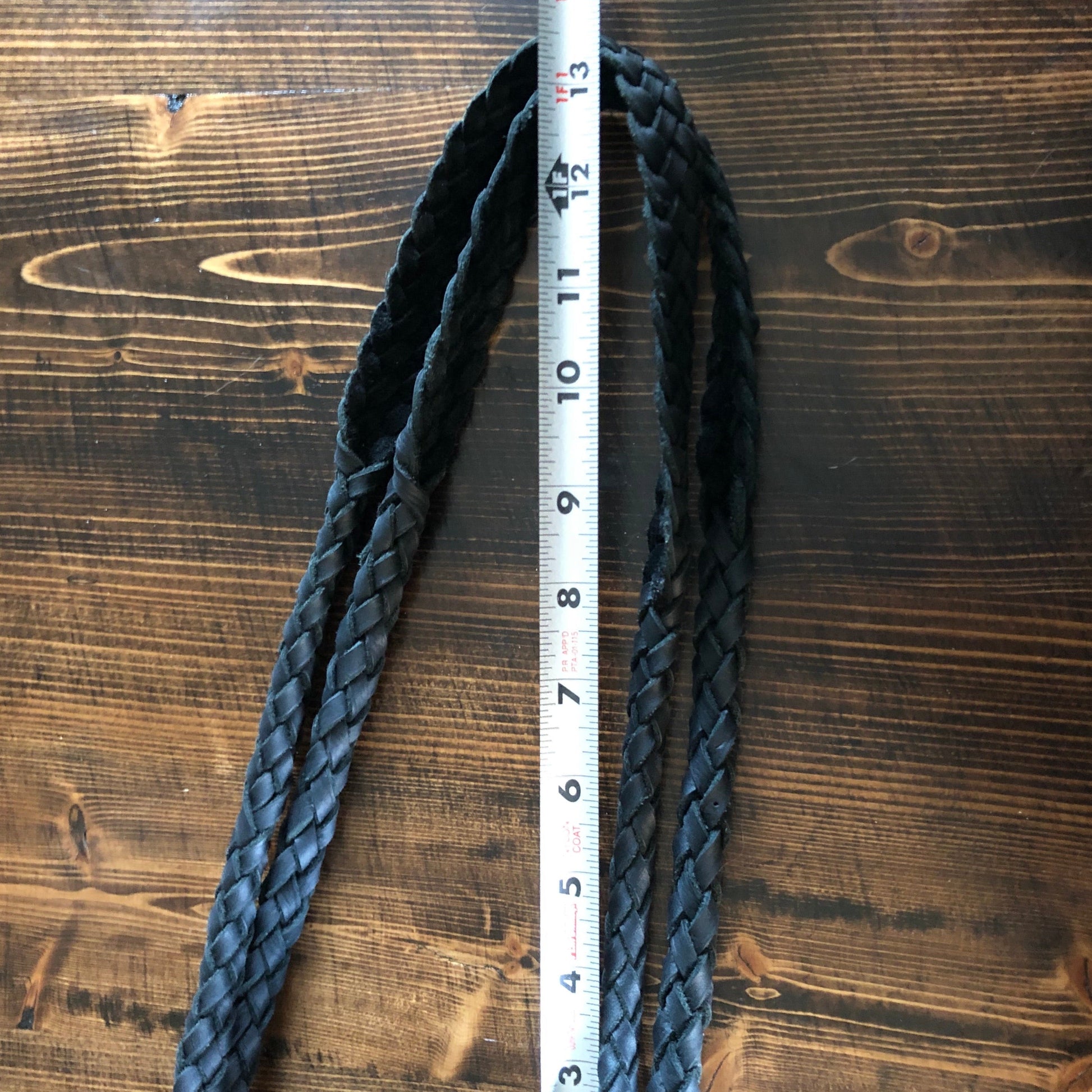The top is stitched by hand with black leather lace. The handles were removed and replaced with black braided leather ones that have a 13" drop . The braiding is flat at the top, and then turns into a round braid with a small amount of fringe.