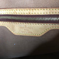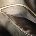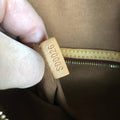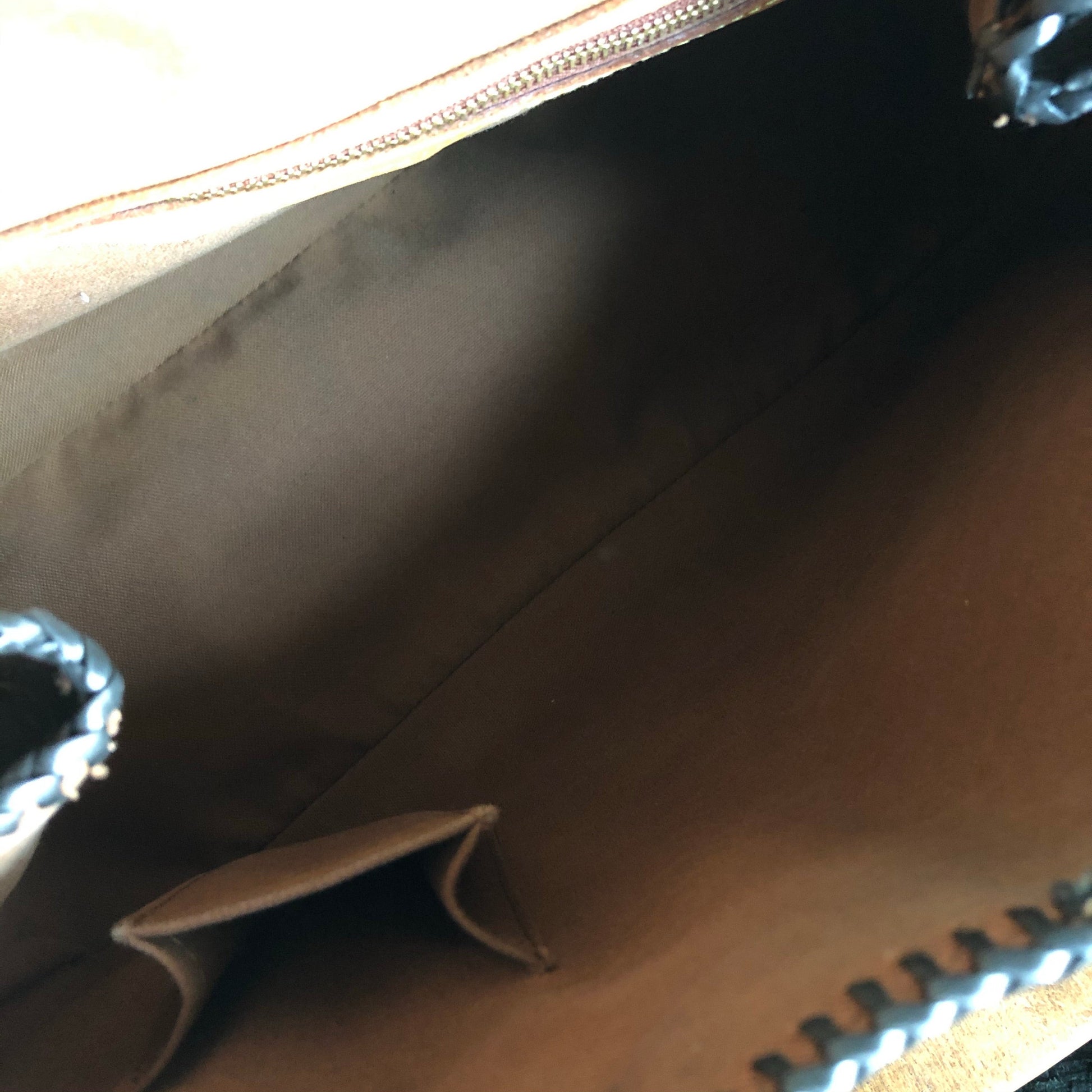 The vachetta leather on this bag was all dyed black, making this a STUNNING piece. The leather is in decent condition, but there was some cracking that is far less noticeable now that it's black. One of the front handle handles has been restiched (see pictures), but it is secure now. There was no interior clasp, but I can add a magnetic snap if you'd like. I don't feel it needs one as it fits securely under your arm! The inside canvas liner is in good condition, but there is a pen stain at the bottom (see picture). There is an interior zipper pocket and a small pocket for a phone/sunglasses. All of the work done to this purse was done by yours truly!!! Isn't she a Prestige Totes?