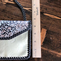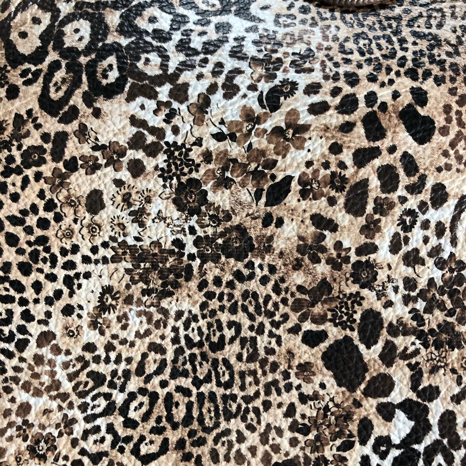 An Louis Vuitton Cream Vernis bag was used along with a gorgeous abstract print that contains leopard AND flowers! The entire bag is lined with brown leather. The outside edge is brown leather lace which has been stitched by hand. There are two black D-Rings that hold either a black crossbody chain or the click-n-go keychain. Remove them both and carry it as a clutch. A beautiful turquoisePrestige Totes concho snap completes this look.