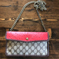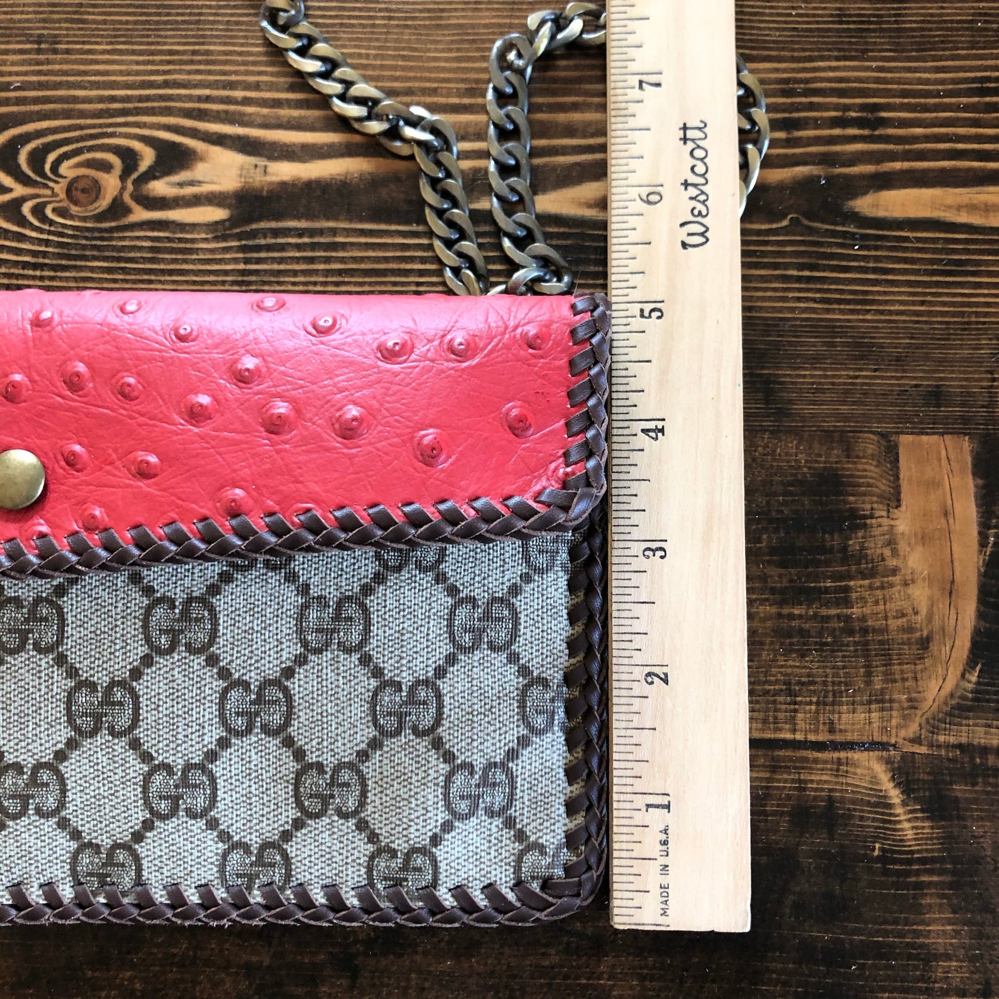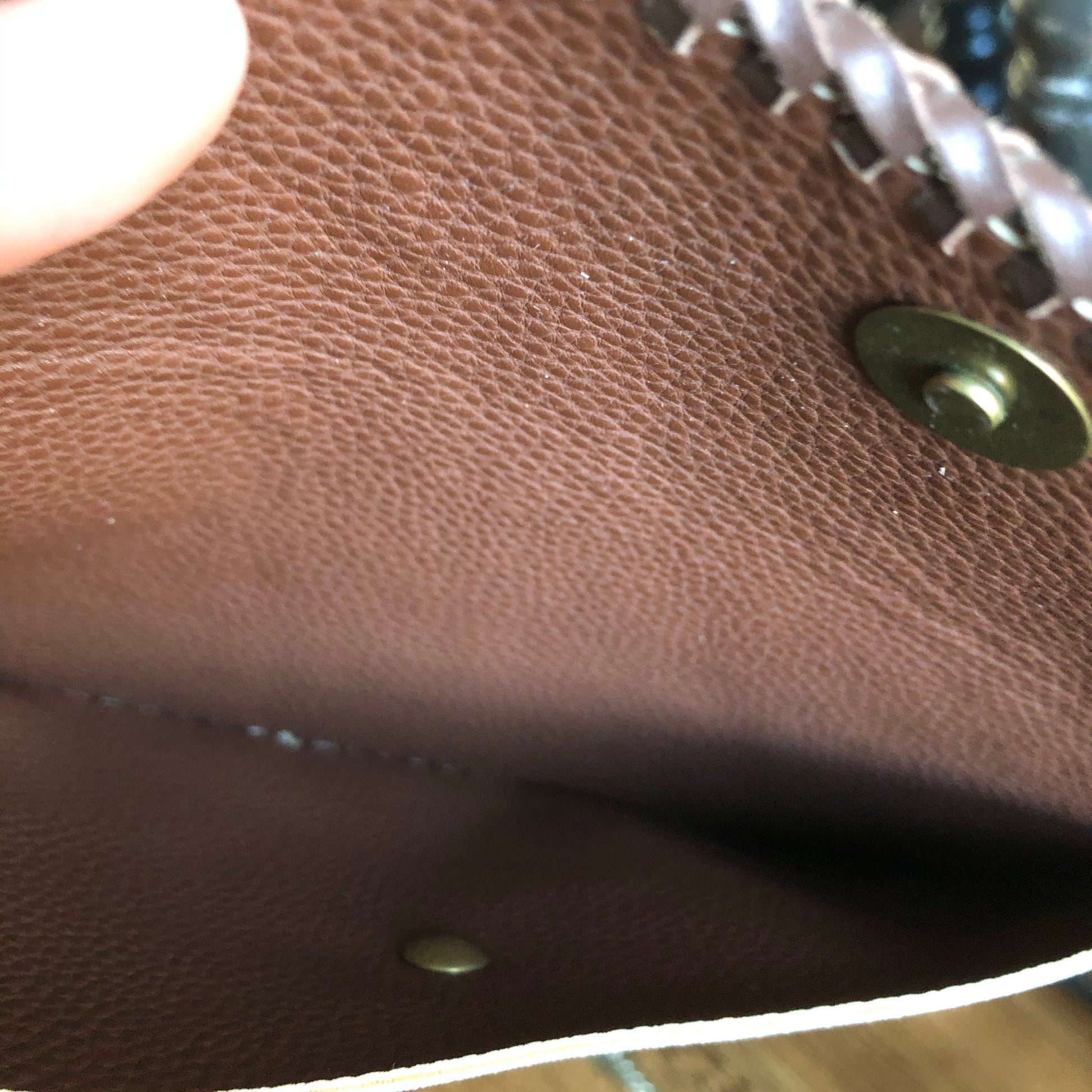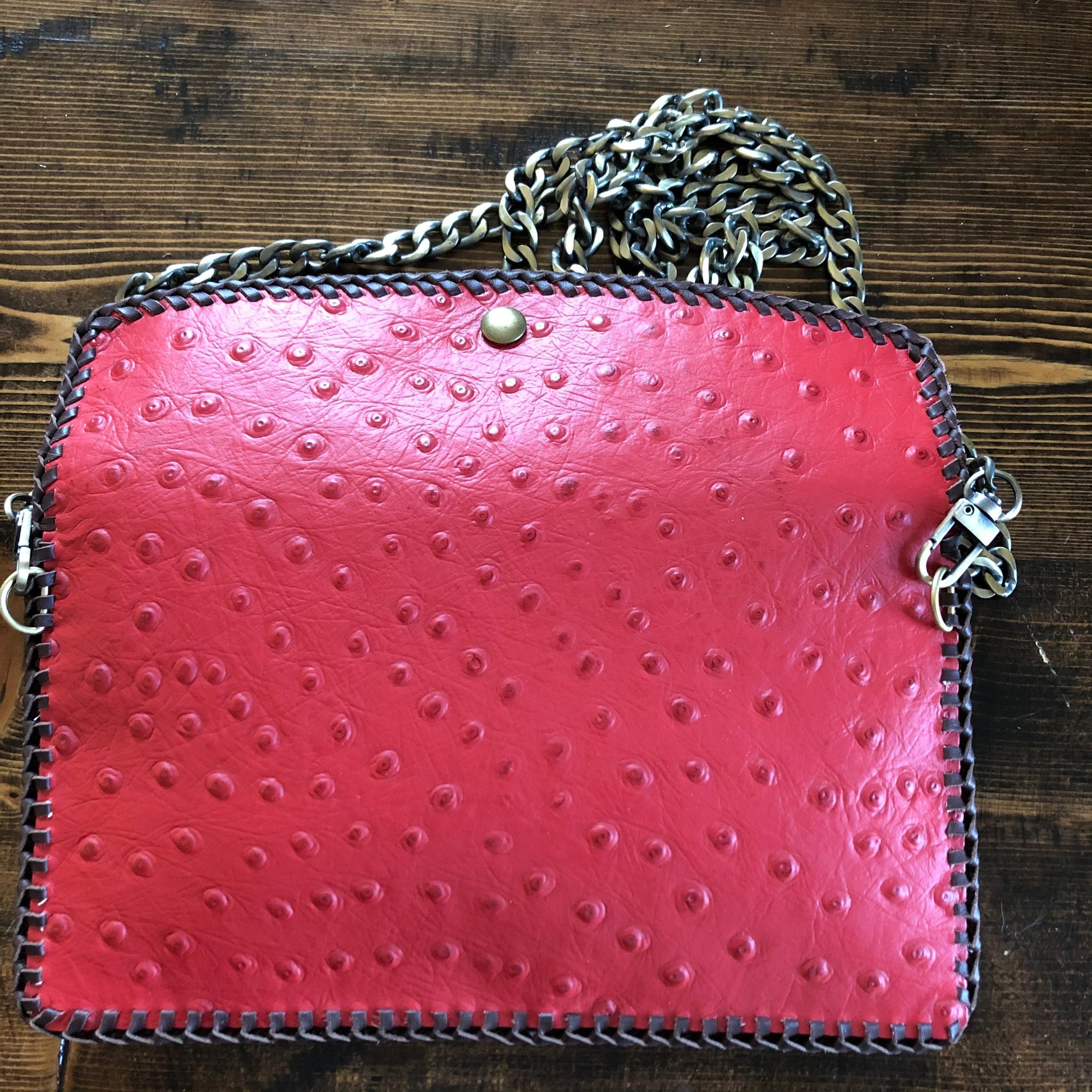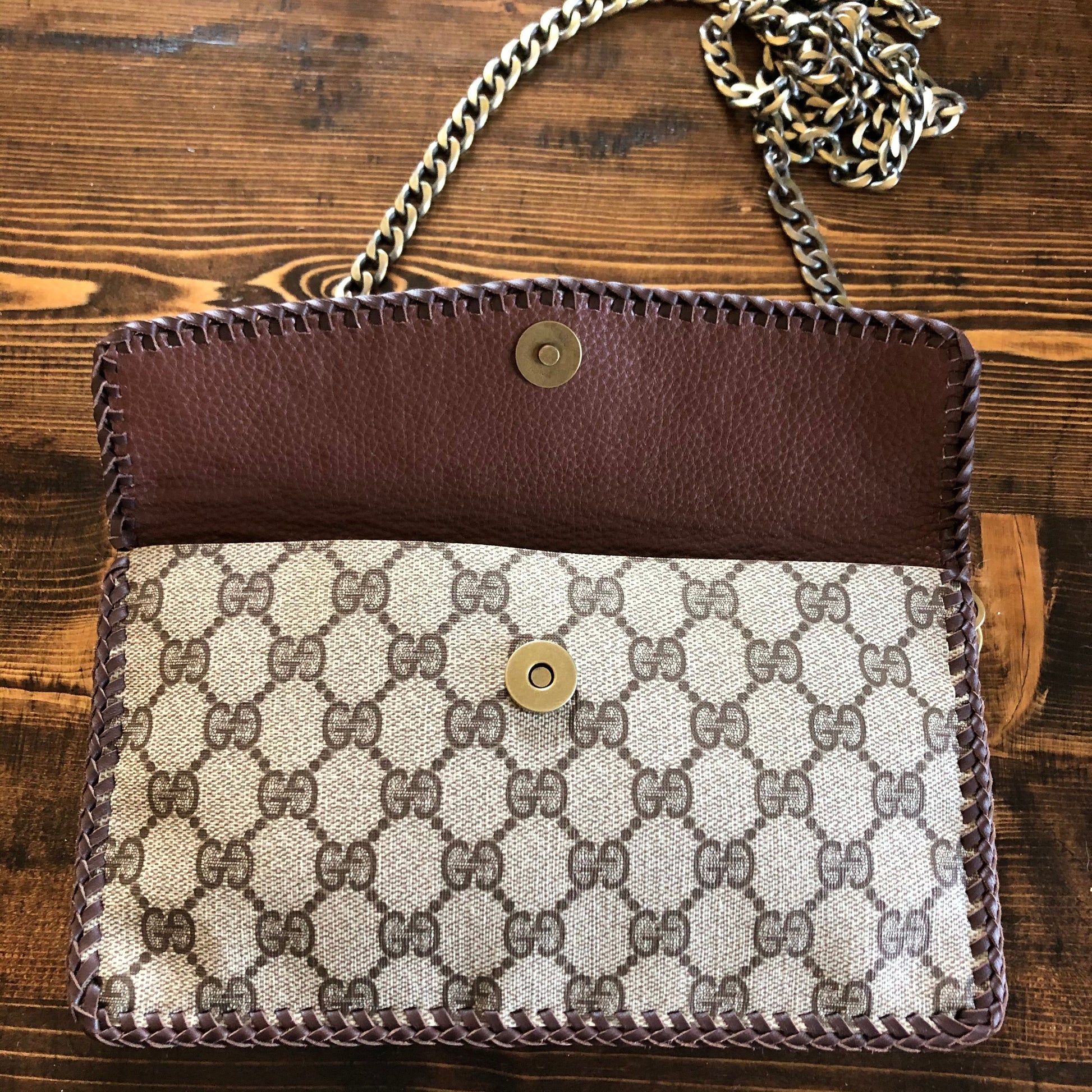 An Gucci bag was used along with a gorgeous embossed red leather! The entire bag is lined with brown leather. The outside edge is brown leather lace which has been stitched by hand. There are two antique brass D-Rings that hold the 47" antique brass crossbody chain. Remove it and carry as a clutch or use as a wallet. A simple antique brass magnetic snap completes this look.