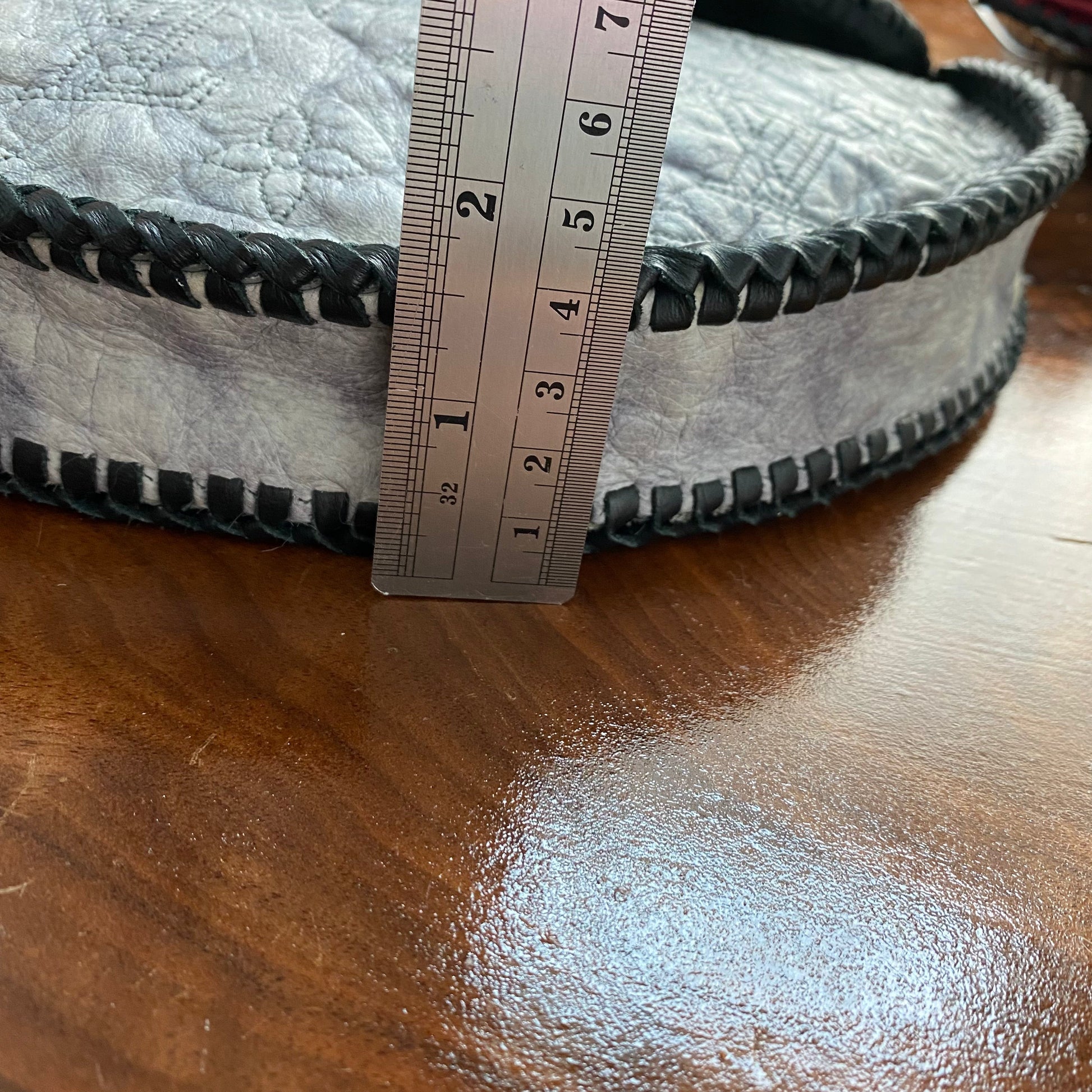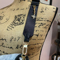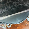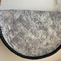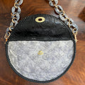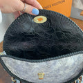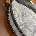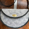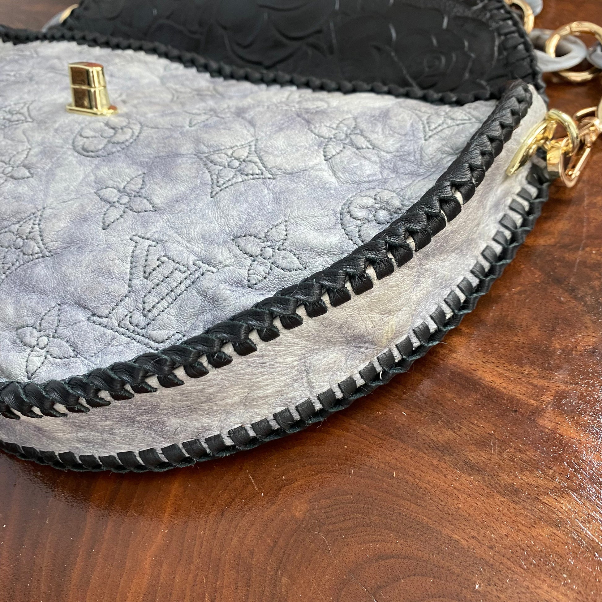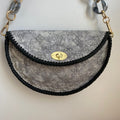 I cut the original bag apart and created this half round style that is so on-trend!!! I've hand stitched the black leather lace around the edges. The front flap interior is lined with a thicker black embossed leather to give it some substance. The front piece is lined with a silver leather. I've used a brass twist lock that gives the bag a fun twist. This bag has got enough room for just the right amount of things, coming in at W10.5 x H6.75 x D1.5".