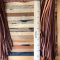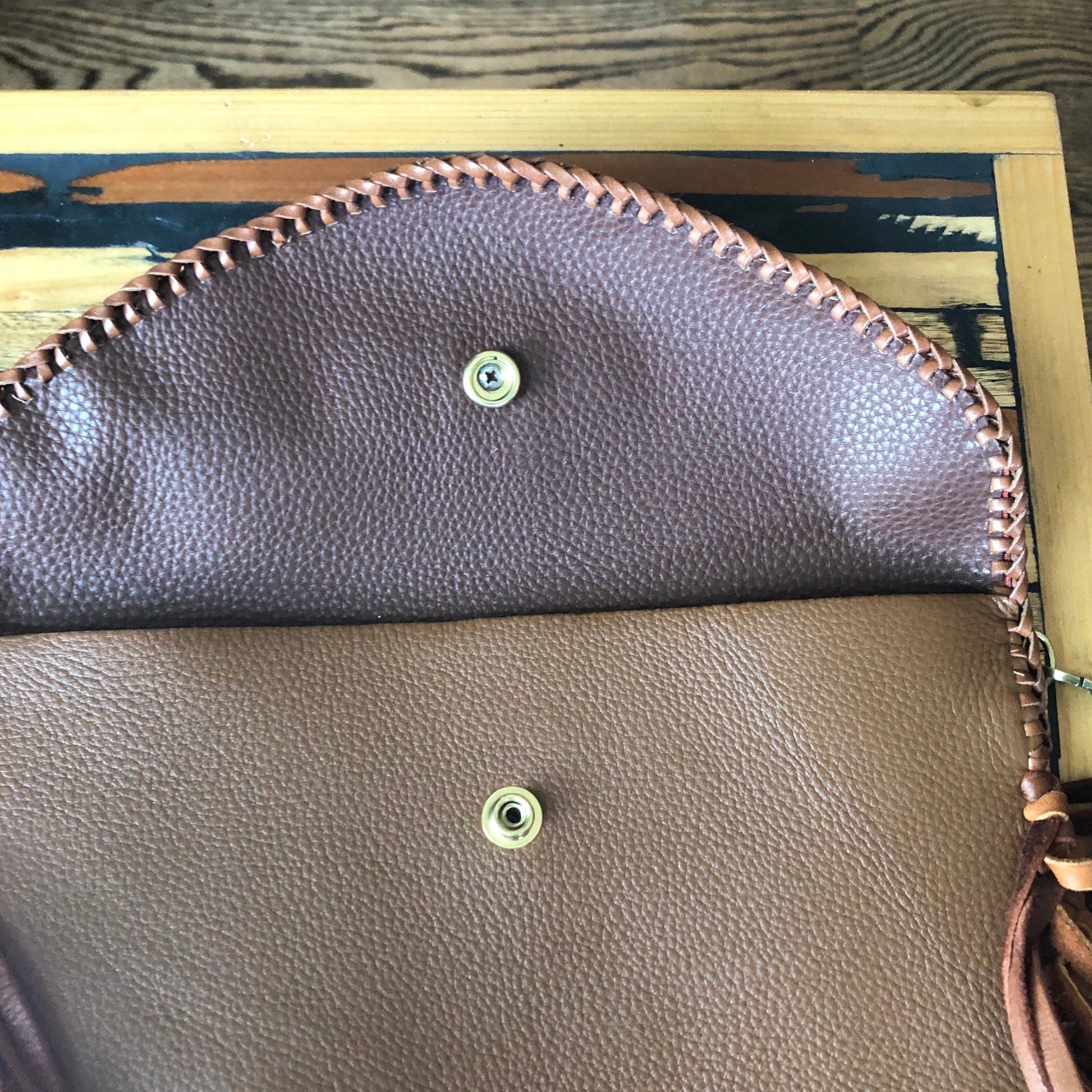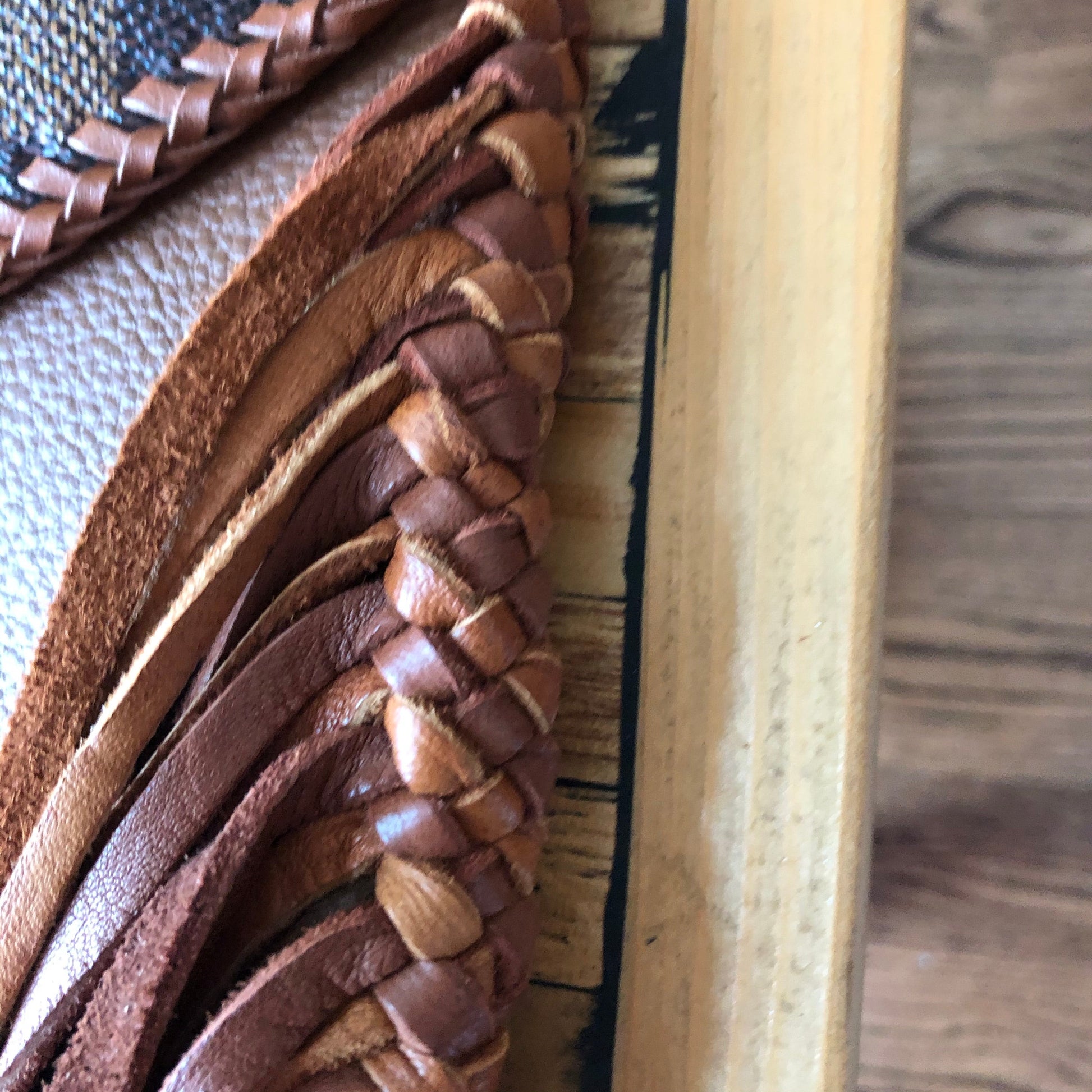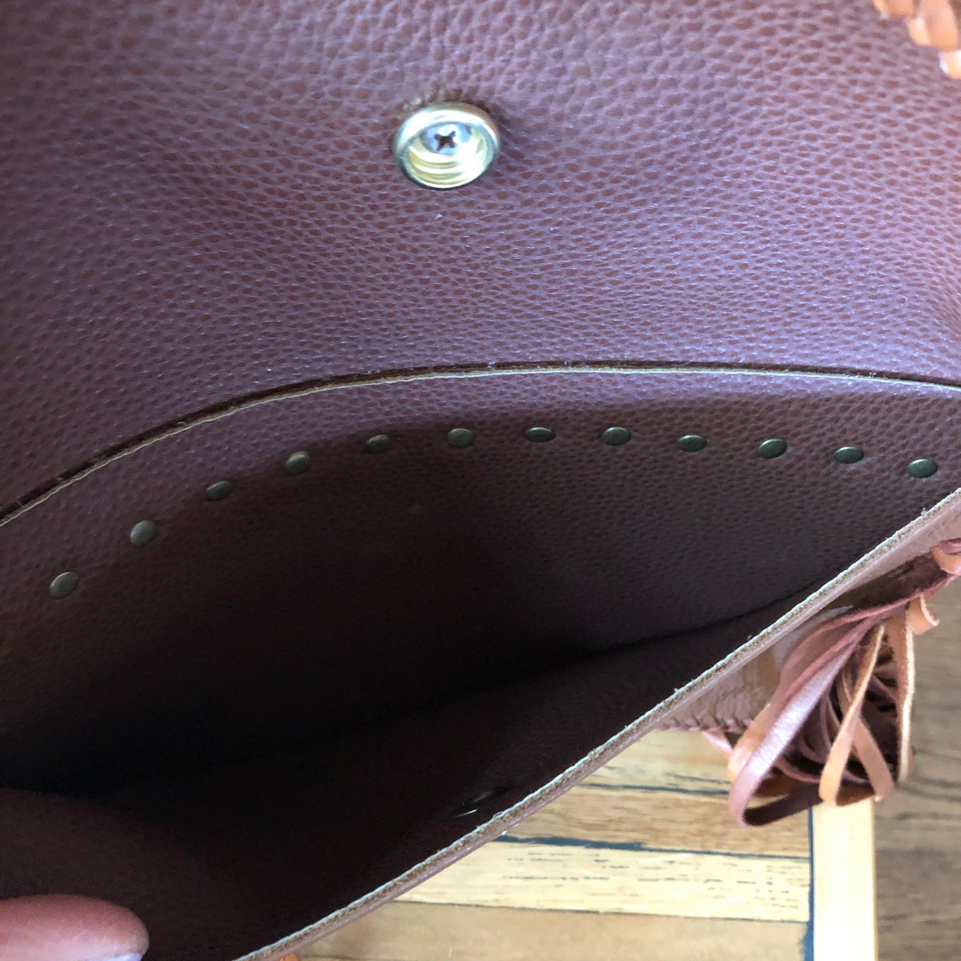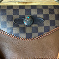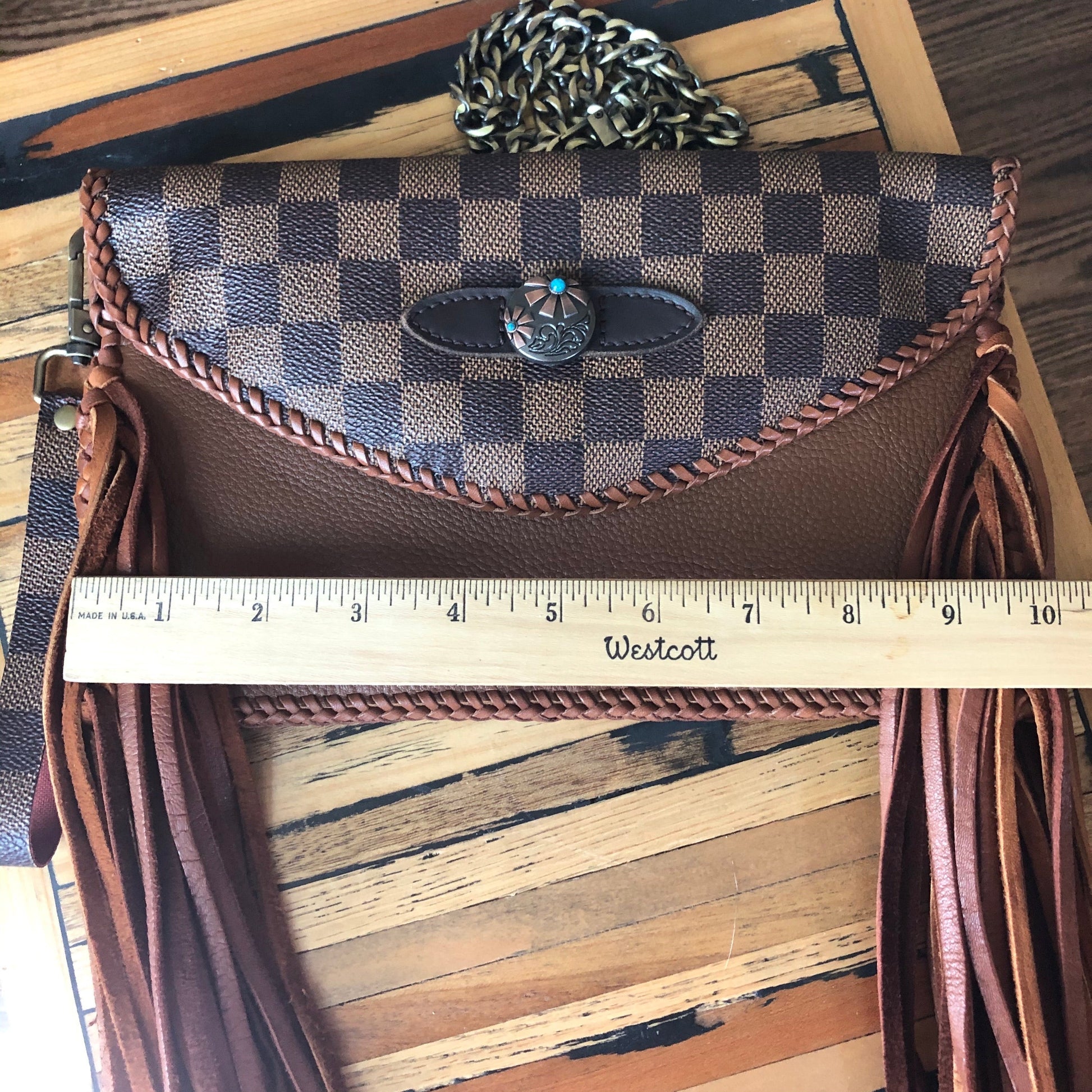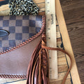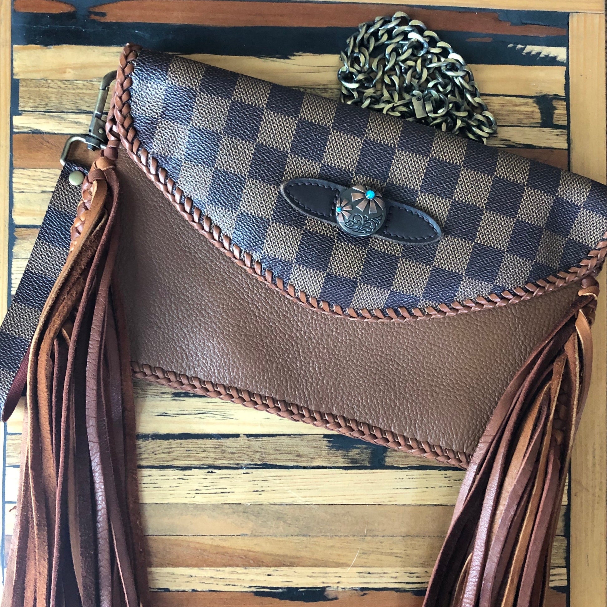 An LV Damier Ebene Saumur Shoulder bag was used to create this Prestige Totes. It is fully lined on the interior with brown leather. The cognac colored front and back is soft and supple leather. I enhanced the sides by adding braided fringe in two different colors to give it some dimension. The Damier is attached to the Cognac leather with fun pointed rivets. Isn't she STUNNING?! The outside edges have been stitched by hand with brown leather lace. There are two bronze colored D-rings stitched into the back that will hold the bronze colored crossbody chain (55"), or the click-n-go wristlet with the Damier Ebene LV print. The wristlet is perfect for your keys OR your wrist!! Or, take both off and turn this into a beautiful clutch! APrestige Totes looking concho snap completes this look.