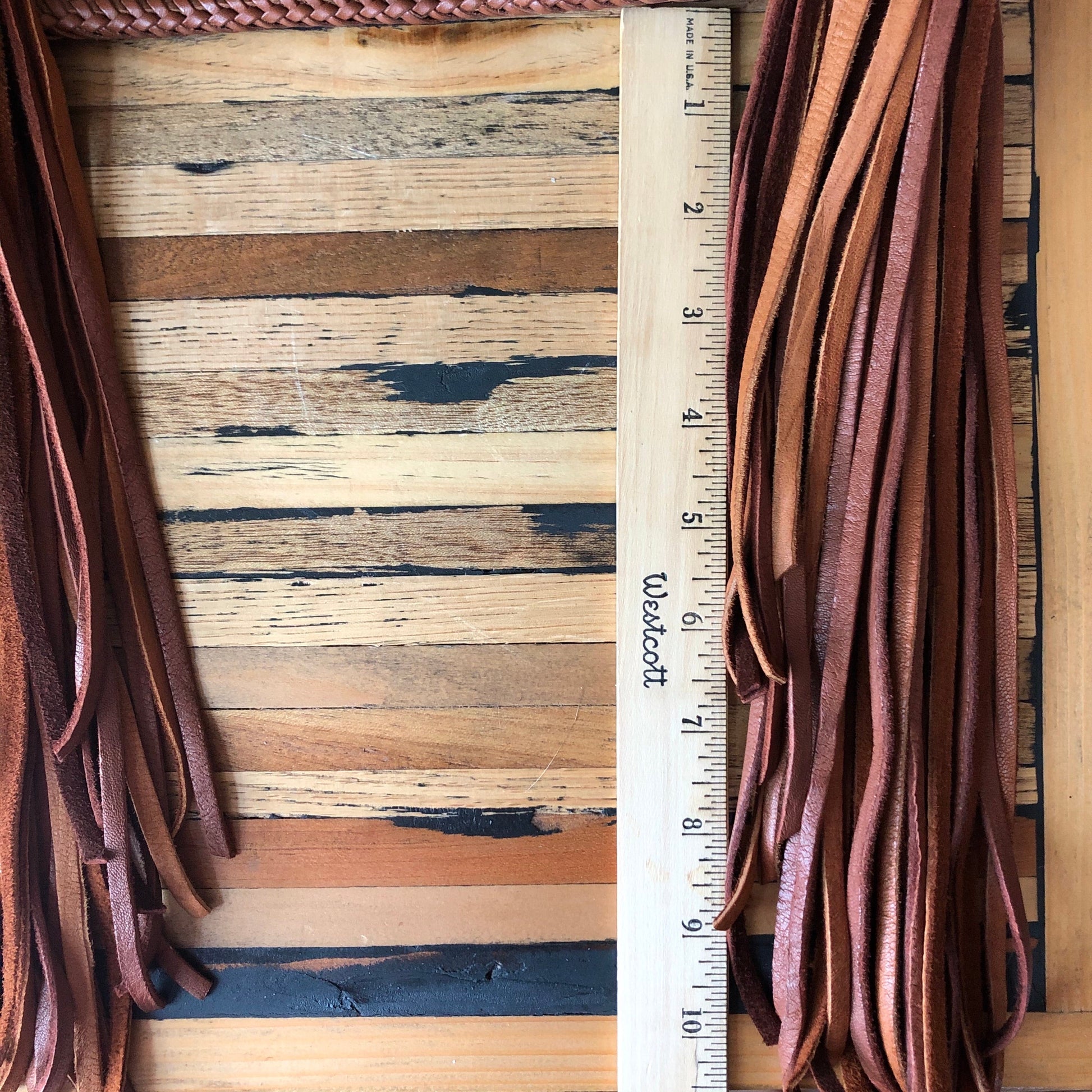 The fringe hangs about 11.5" from the bottom of the bag, but can be trimmed to your liking!