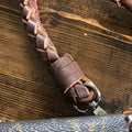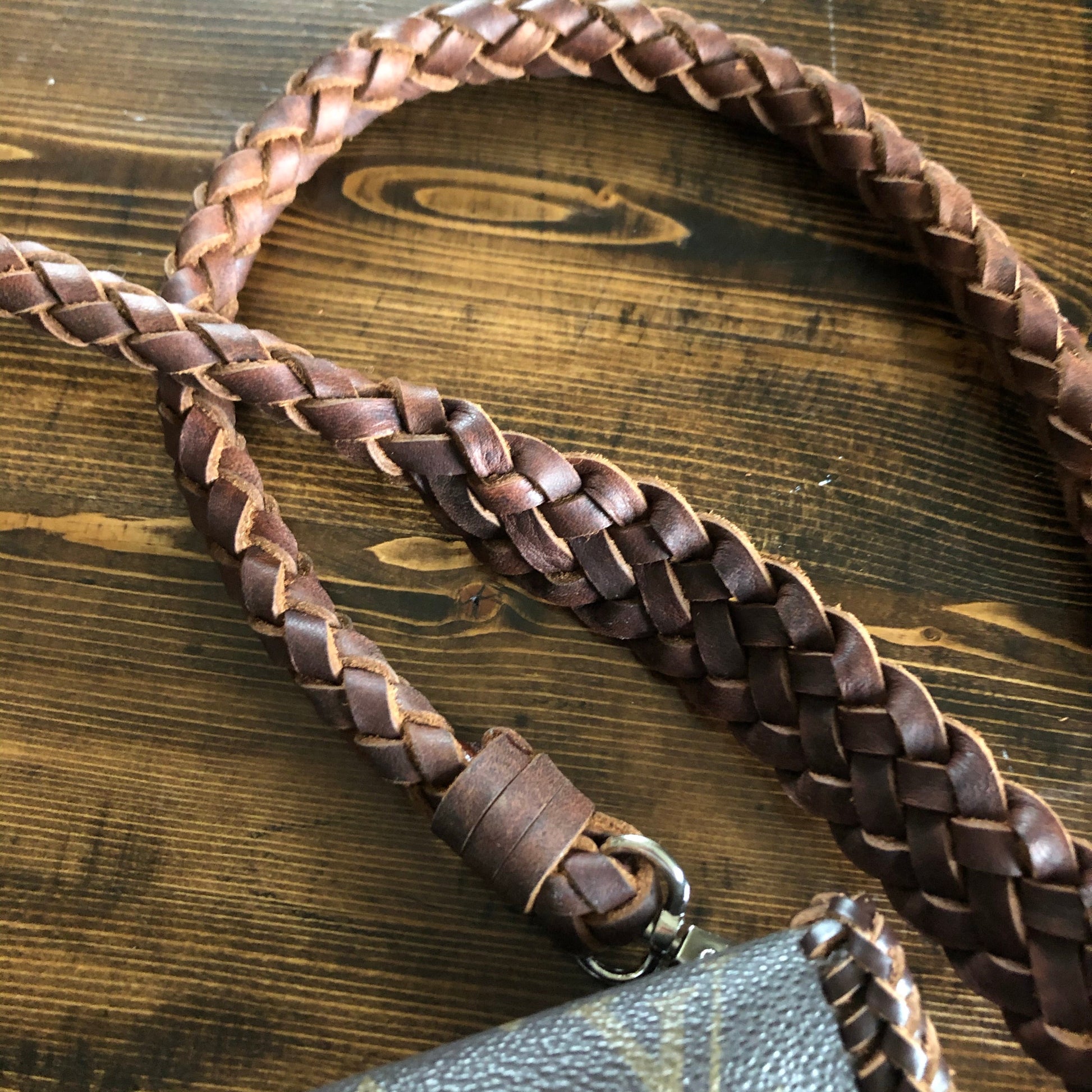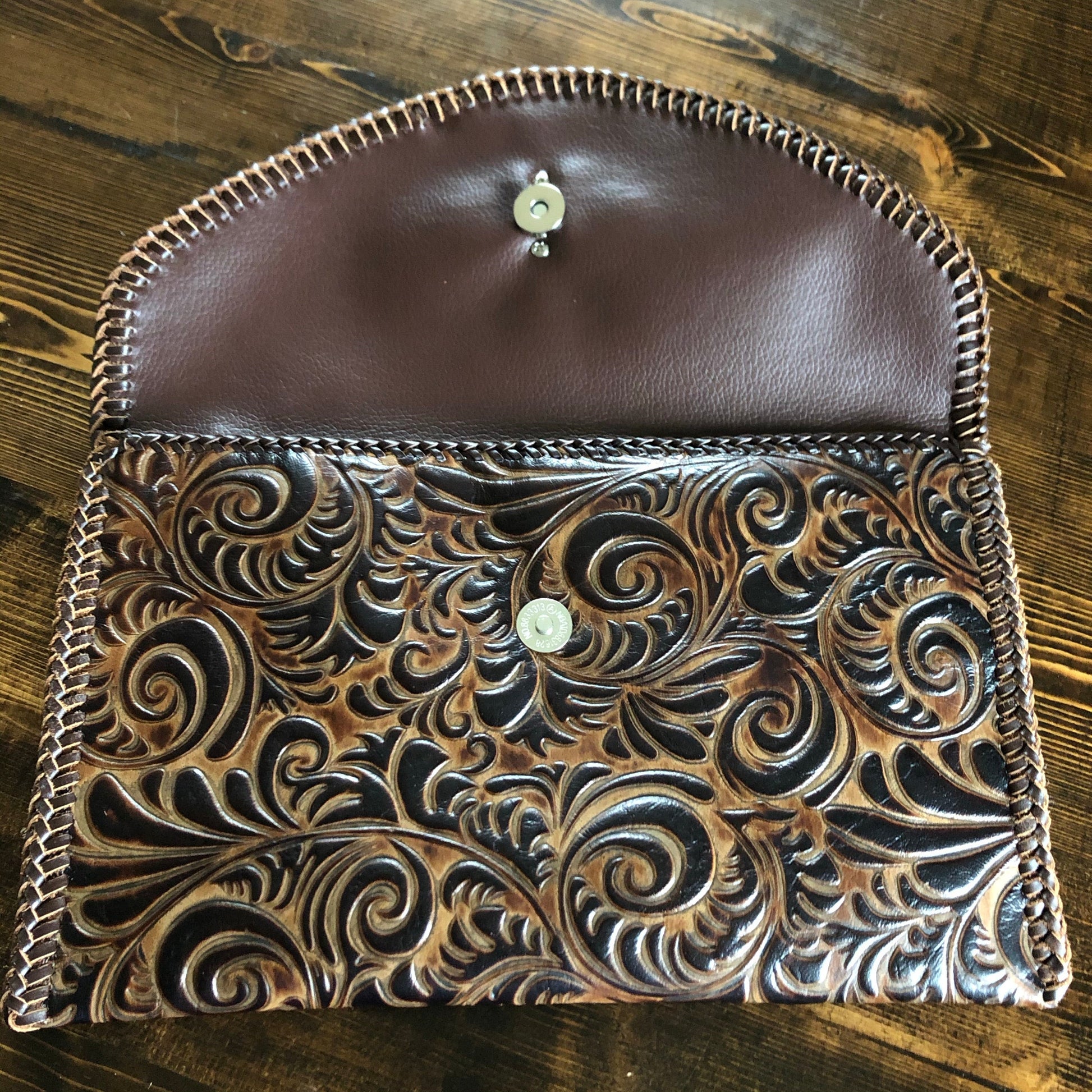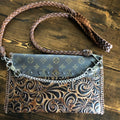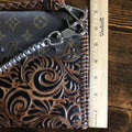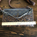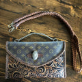 The entire bag is lined with brown leather. The outside edges are brown leather lace which has been stitched by hand. There are two silver D-Rings that hold either a beautiful leather braided strap (49") or a cute shorty silver chain. The leather strap is 6-strand braided brown leather that is flat where it goes across your body, but then transitions into round as it moves to the clasp. The shorty chain can also be clipped to the same ring to make this a wristlet!! Remove them both and carry it as a clutch! A beautiful silverPrestige Totes concho shows on the front, hiding a magnetic snap underneath.