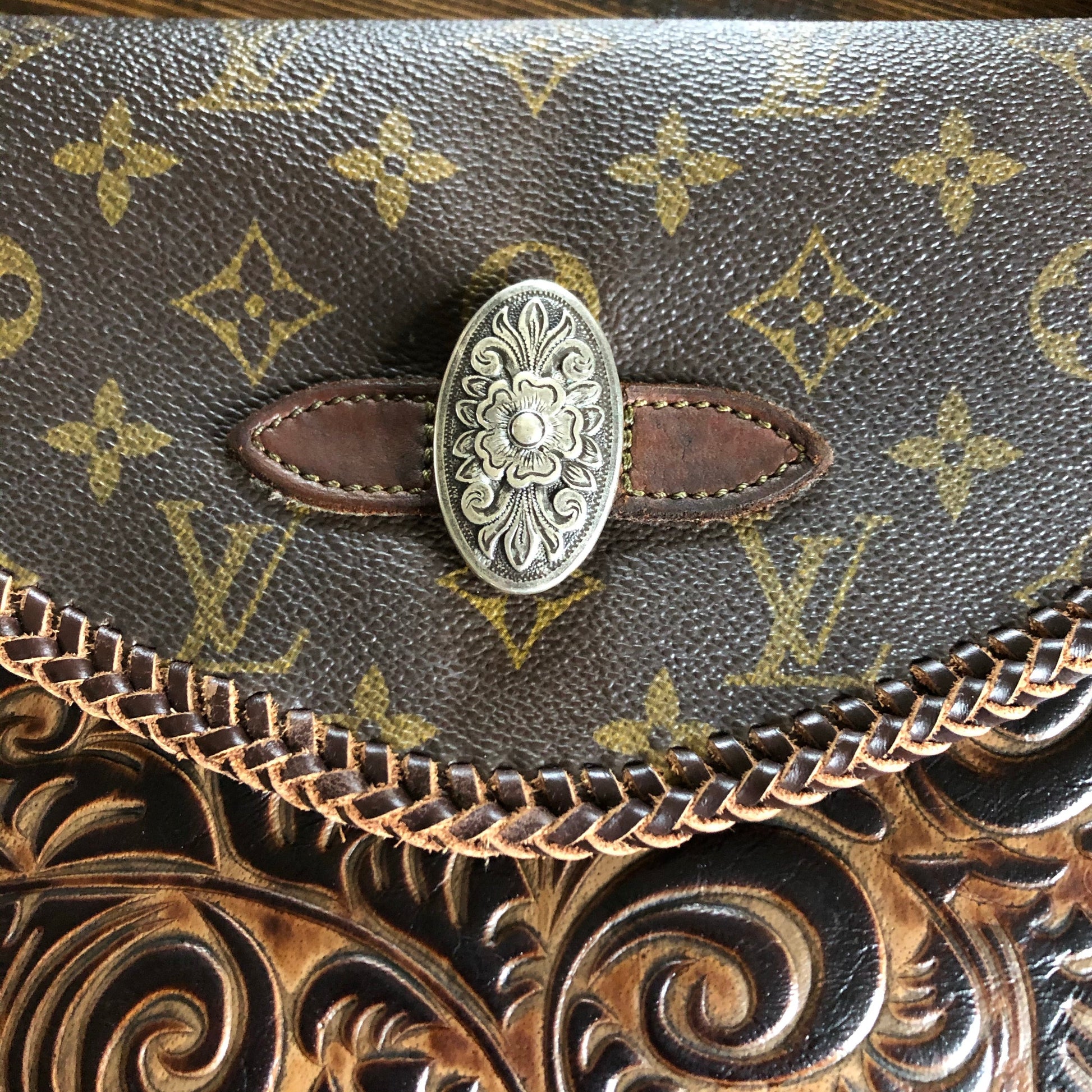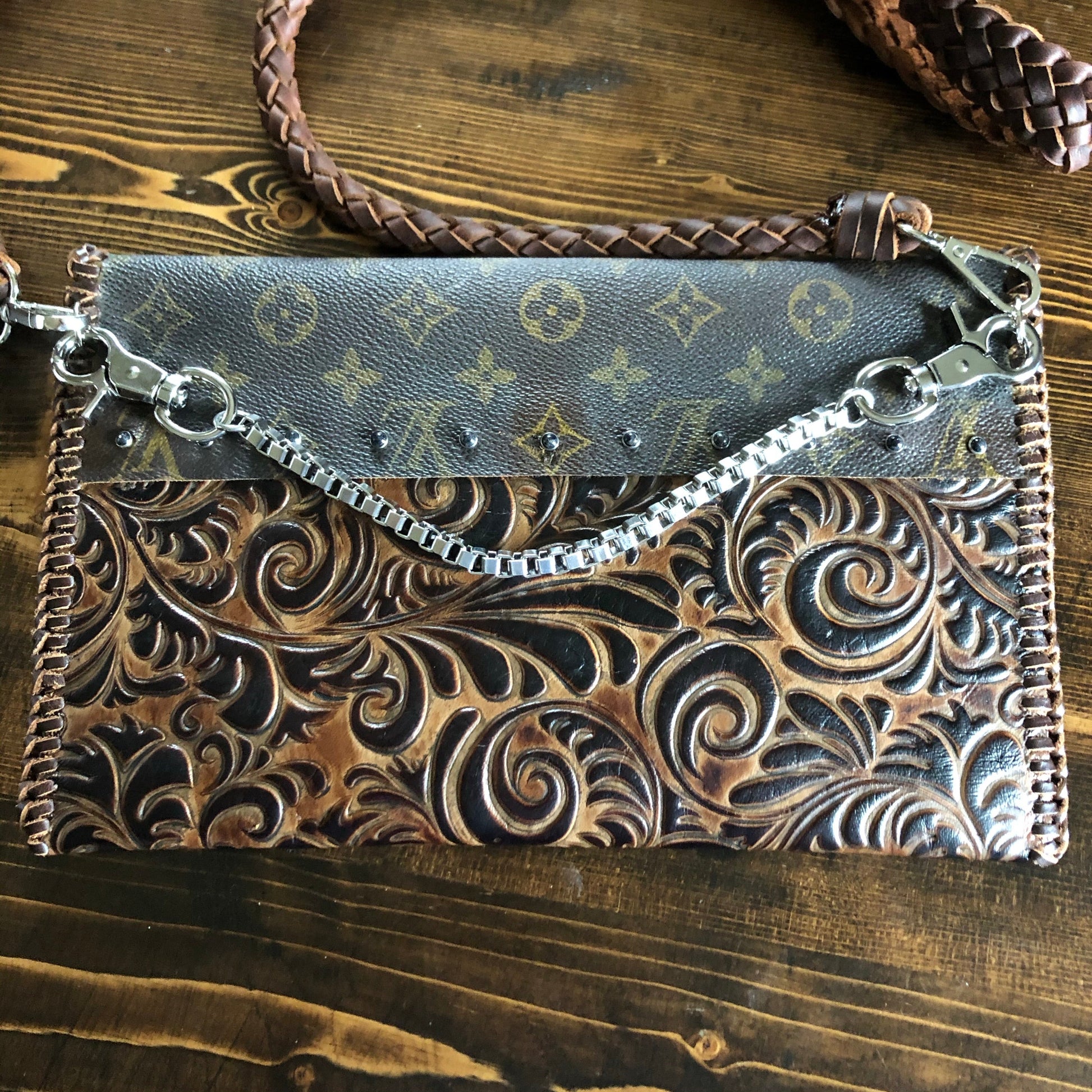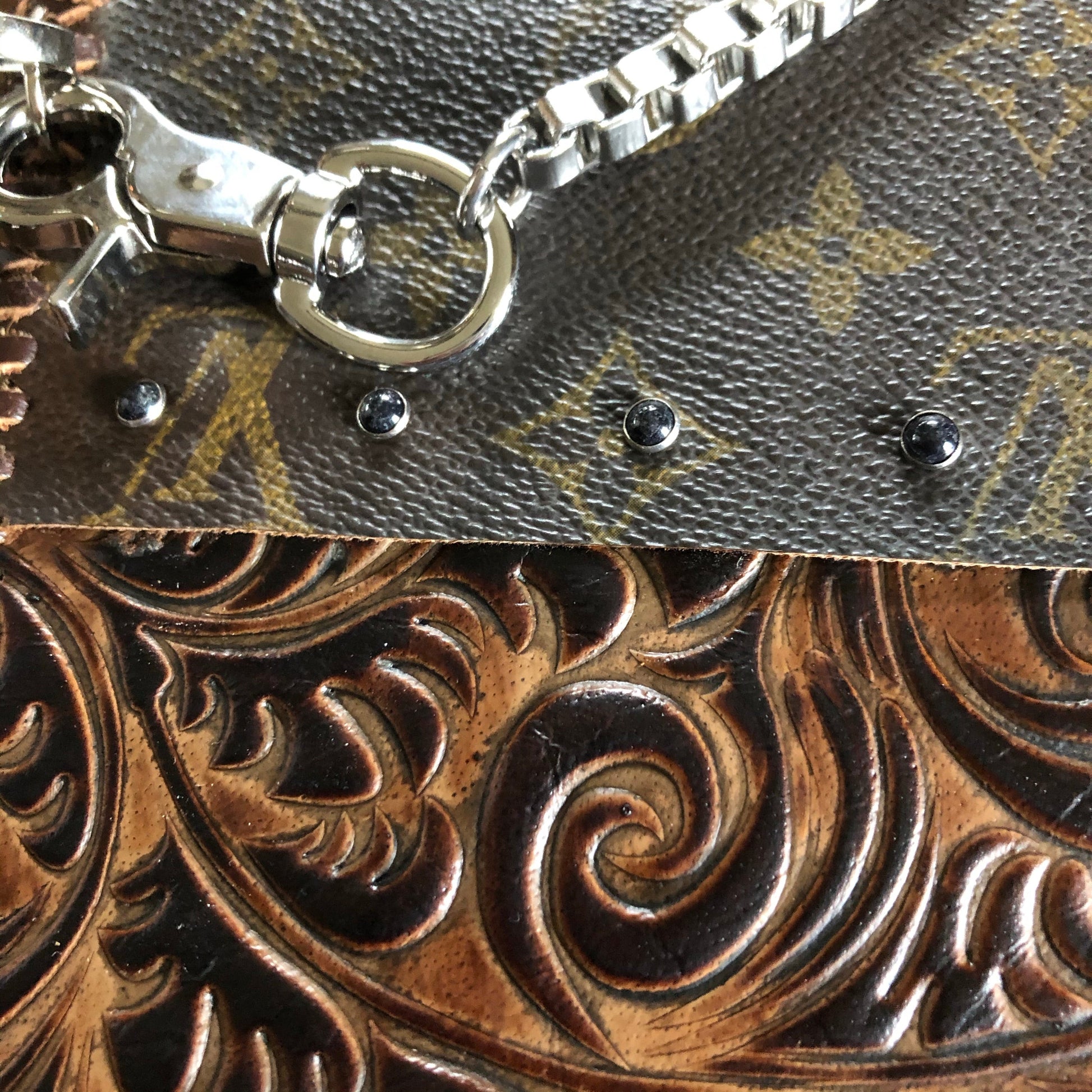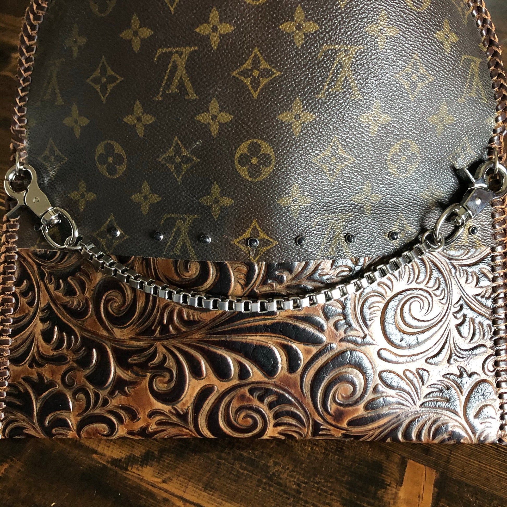 An Louis Vuitton Monogram bag was used along with a gorgeous brown/black embossed leather. The two join together in the back with beautiful black stone rivets!