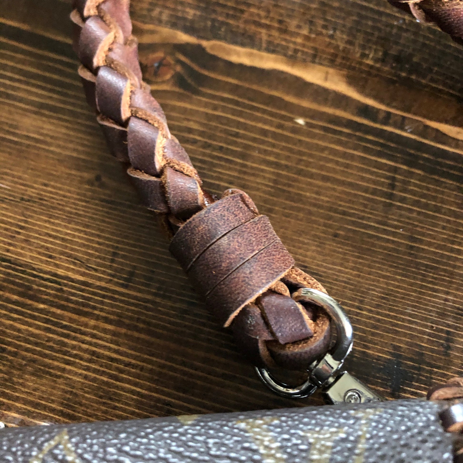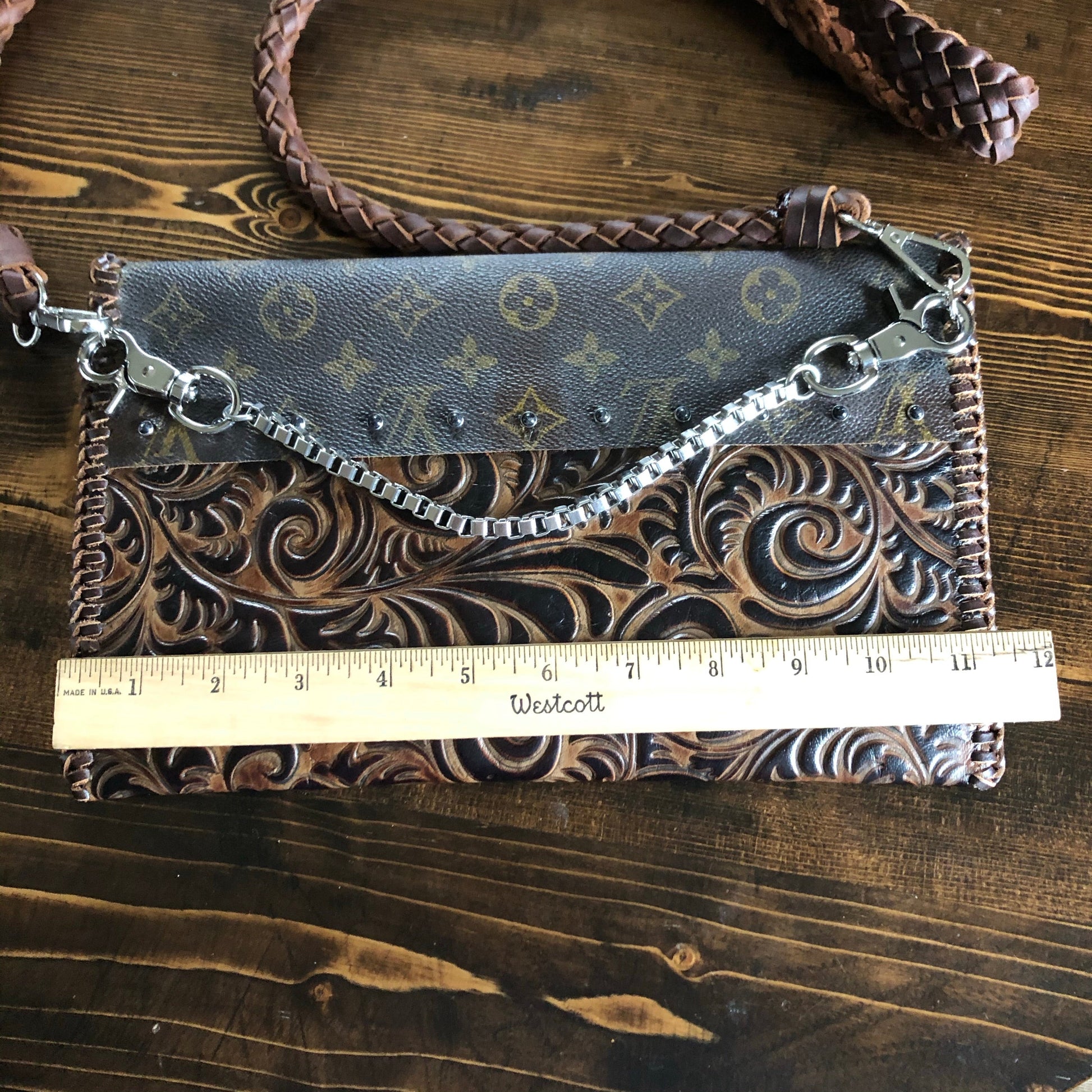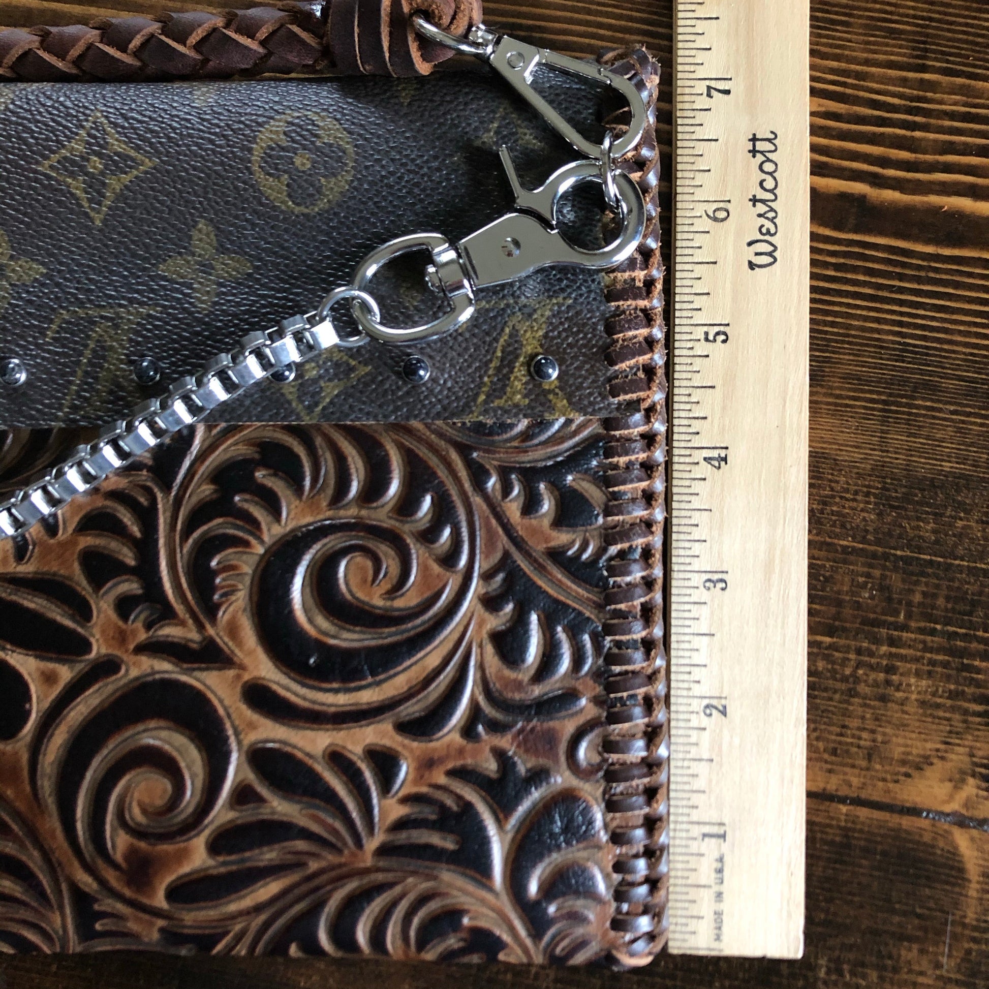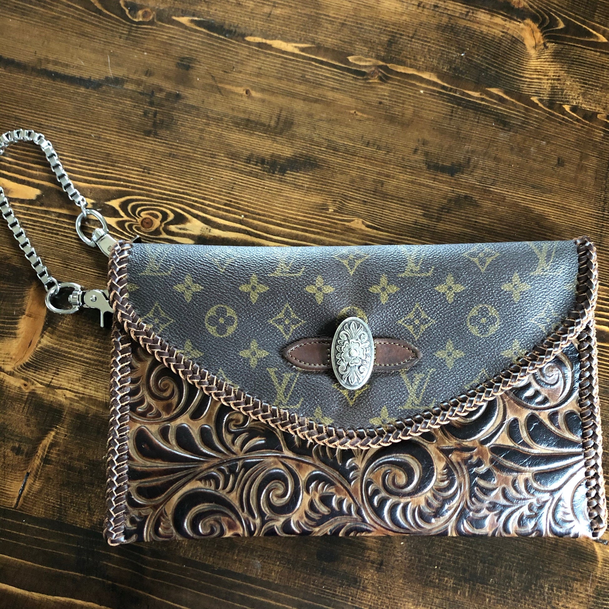 An Louis Vuitton Monogram bag was used along with a gorgeous brown/black embossed leather. The two join together in the back with beautiful black stone rivets!