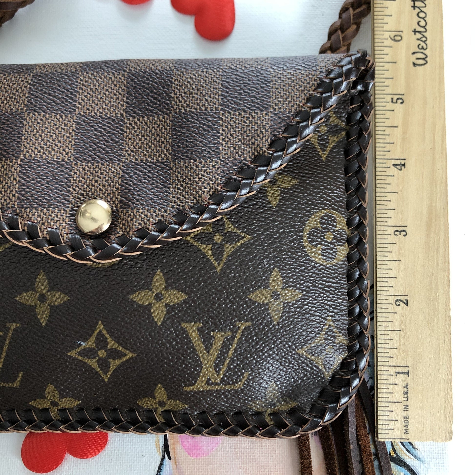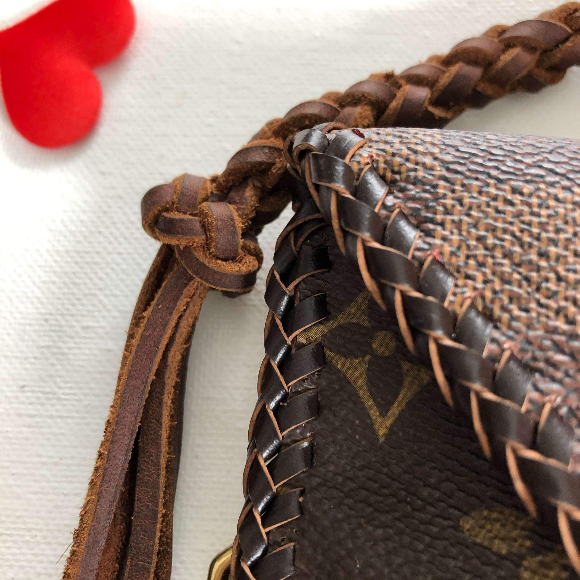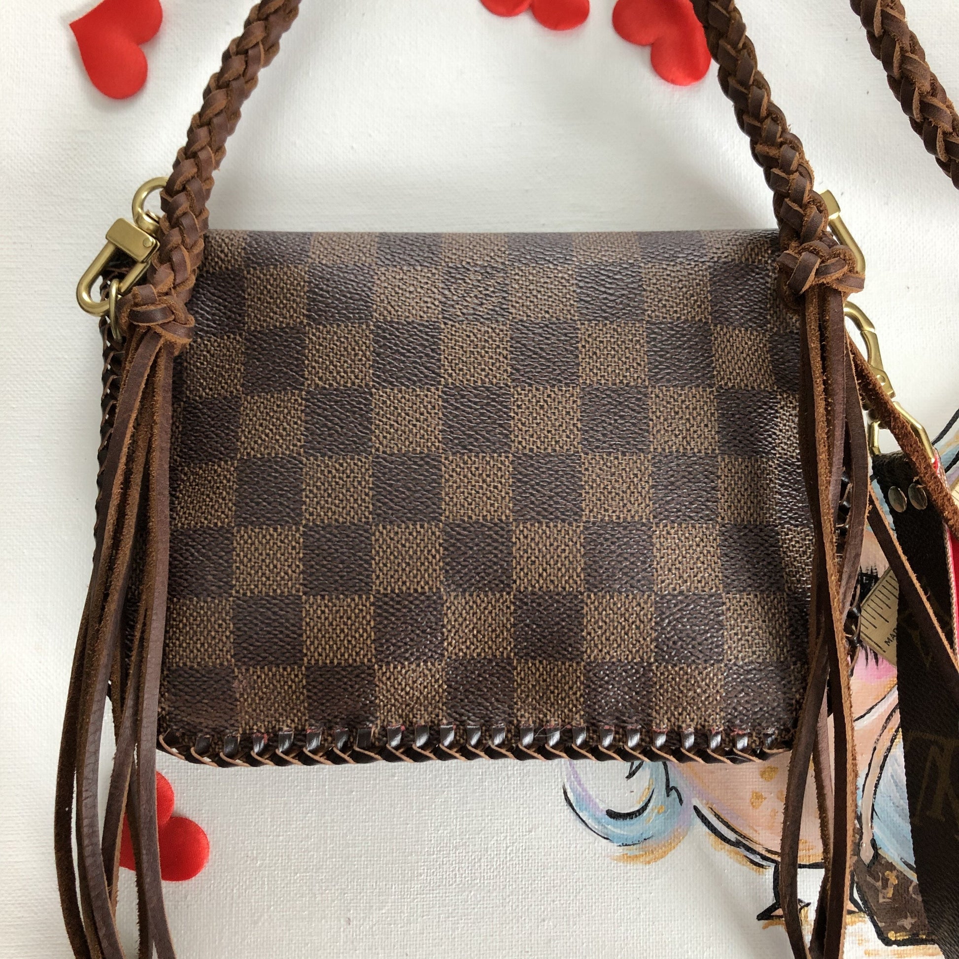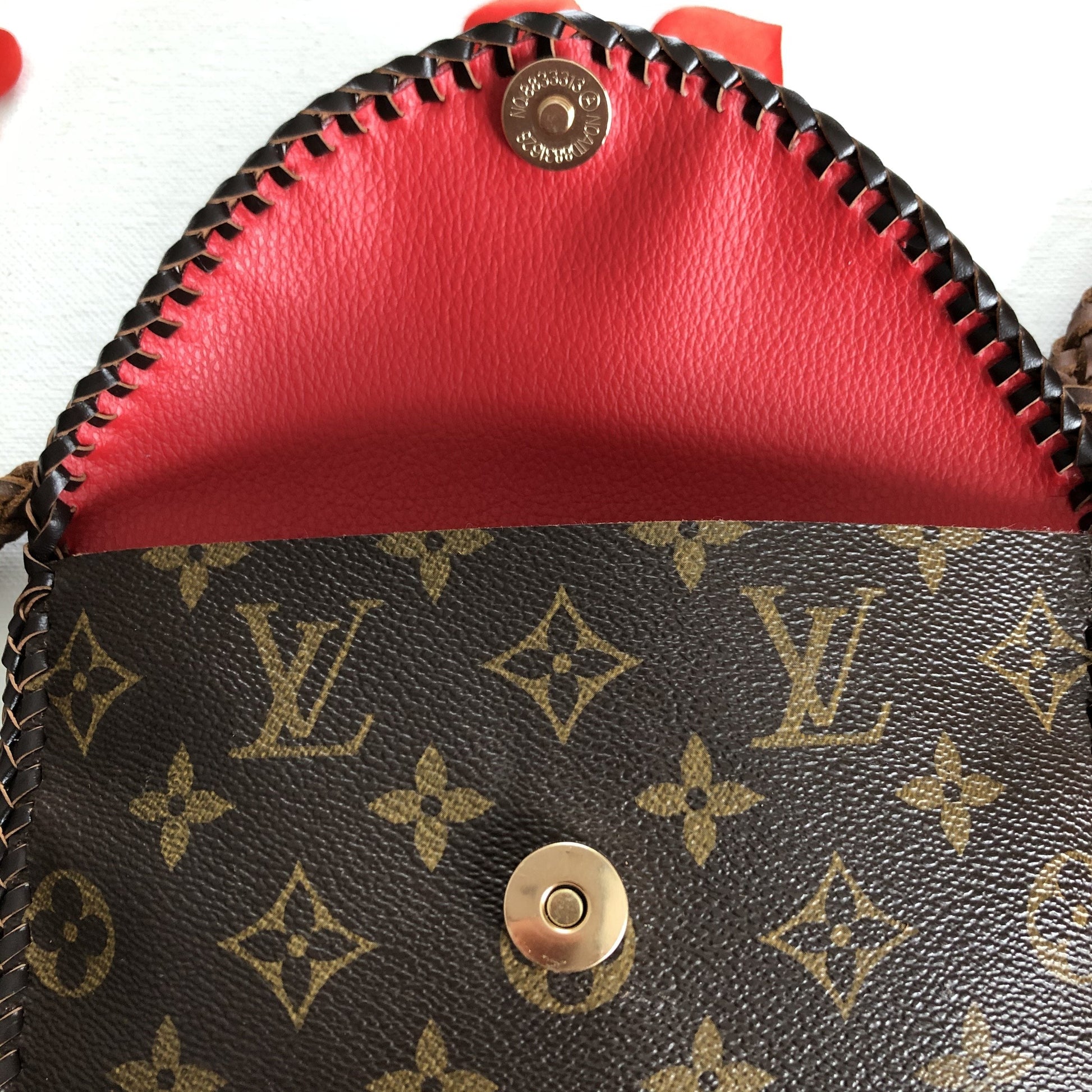 I just love how the Damier Ebene looks with the Monogram print!!! The entire bag has been lined in a bright red vegan leather to give the canvas more of a substantial feel. The outside edges are brown leather lace which have been stitched by hand. There are brass D-rings secured in the back so that you can go from crossbody to wristlet to clutch! The wristlet strap is Monogram print lined in red. The dark brown leather crossbody strap is 6 strands of braided leather that is flat where it sits across your body, and then moves to round towards the clasp. The clasps are brass, and a gold button magnetic snap keeps your items secure.