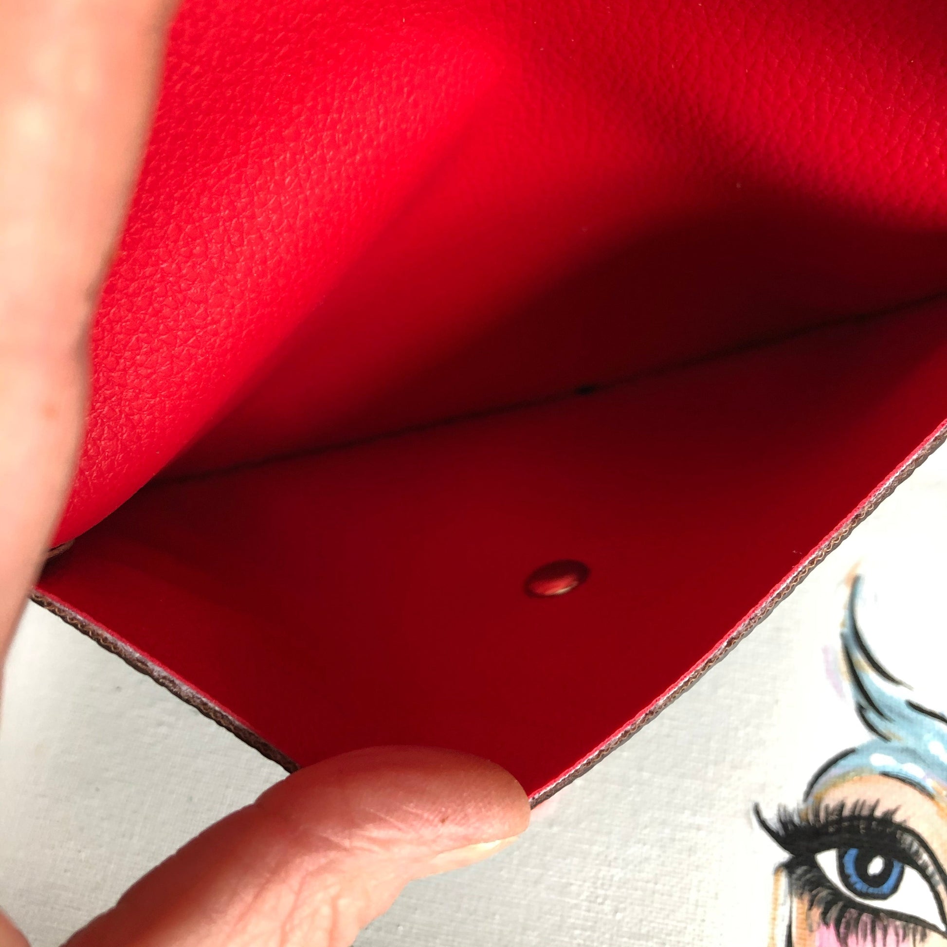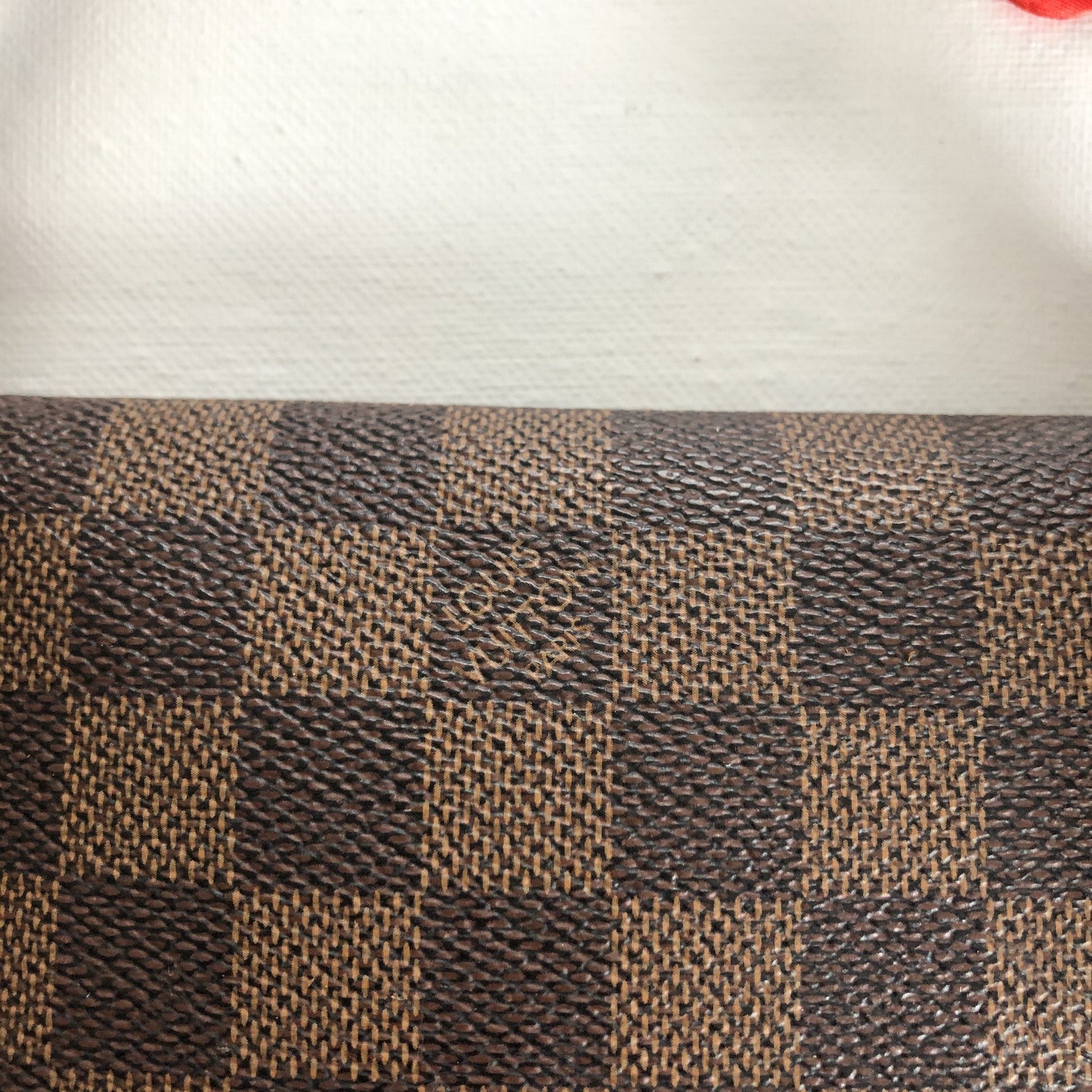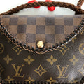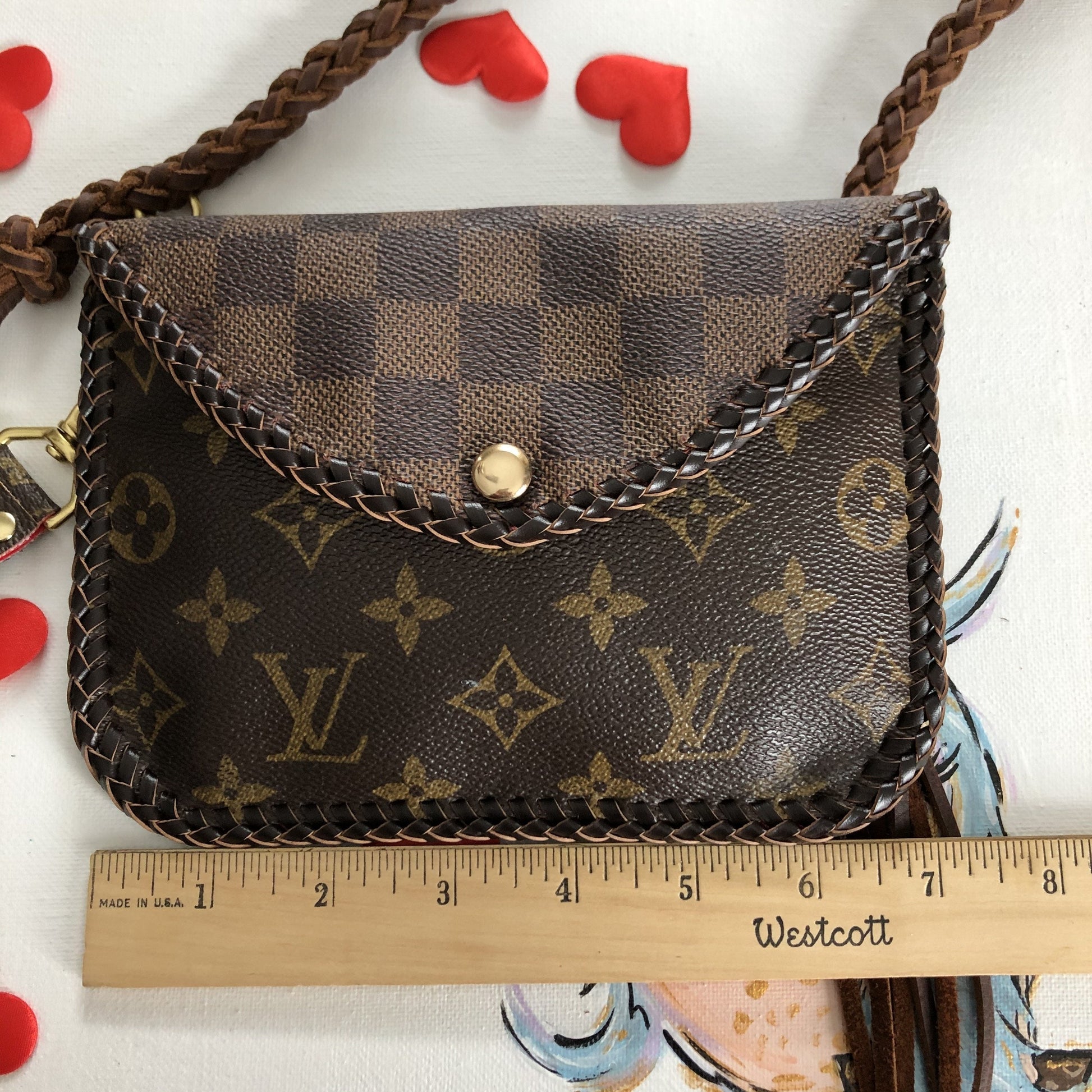 I just love how the Damier Ebene looks with the Monogram print!!! The entire bag has been lined in a bright red vegan leather to give the canvas more of a substantial feel. The outside edges are brown leather lace which have been stitched by hand. There are brass D-rings secured in the back so that you can go from crossbody to wristlet to clutch! The wristlet strap is Monogram print lined in red. The dark brown leather crossbody strap is 6 strands of braided leather that is flat where it sits across your body, and then moves to round towards the clasp. The clasps are brass, and a gold button magnetic snap keeps your items secure.