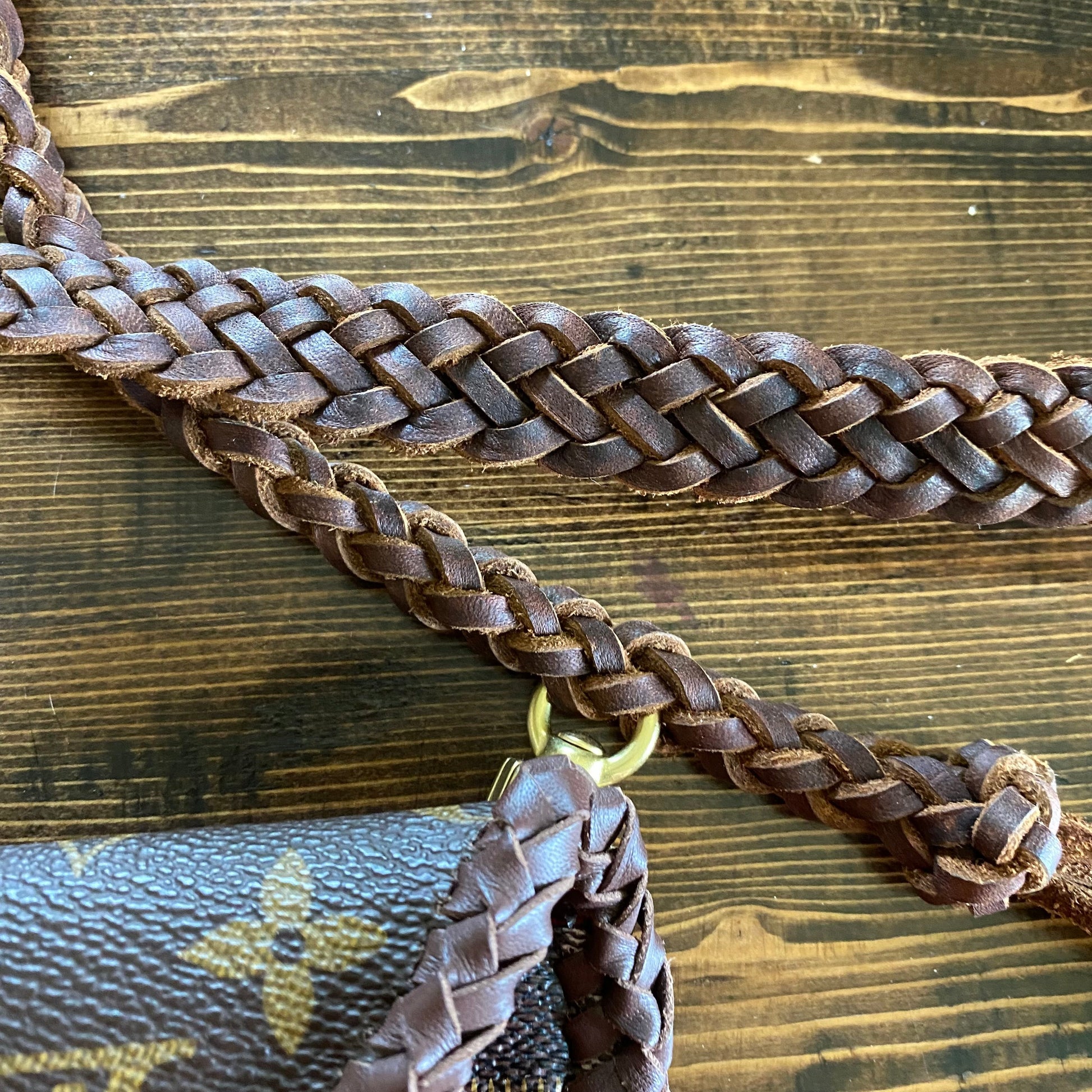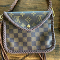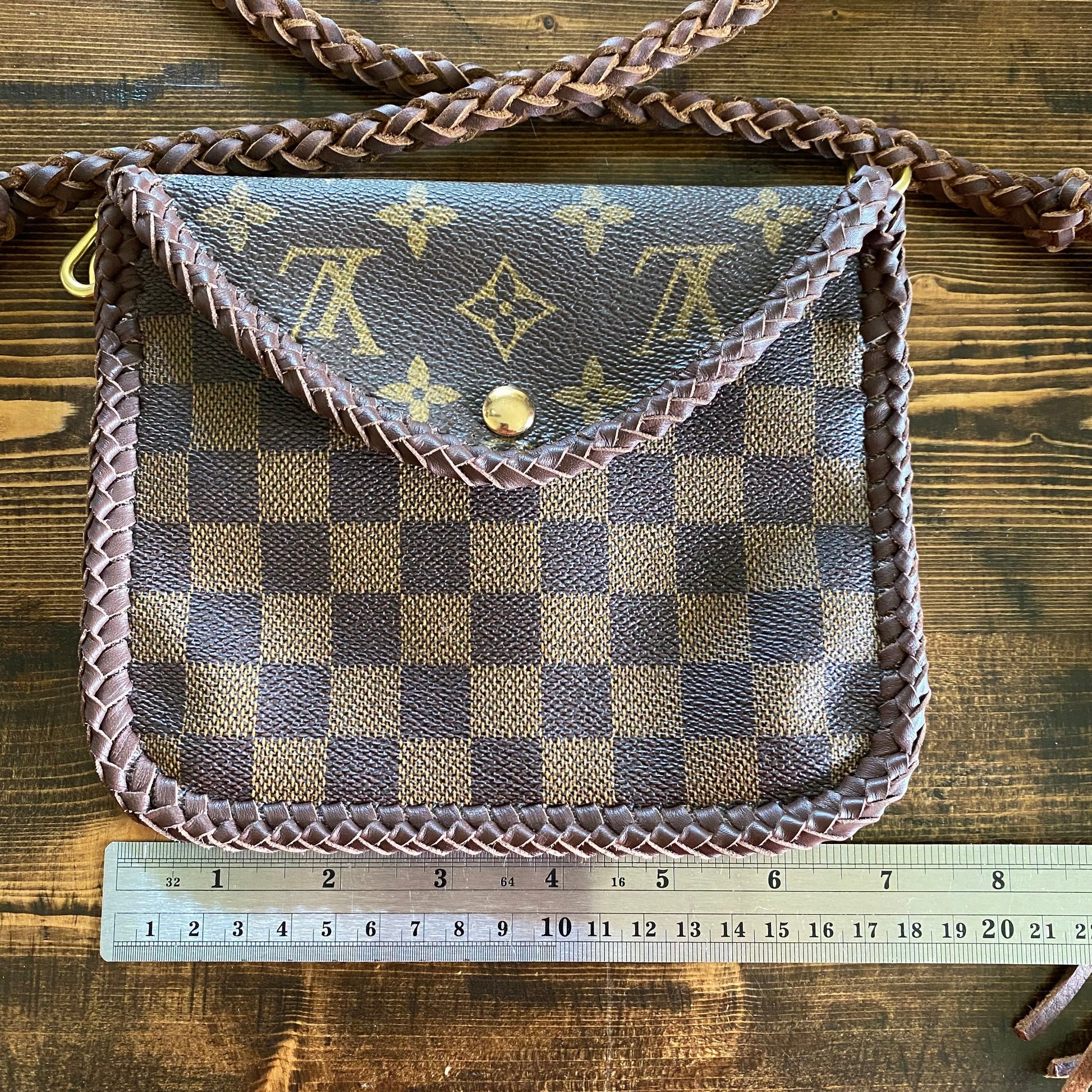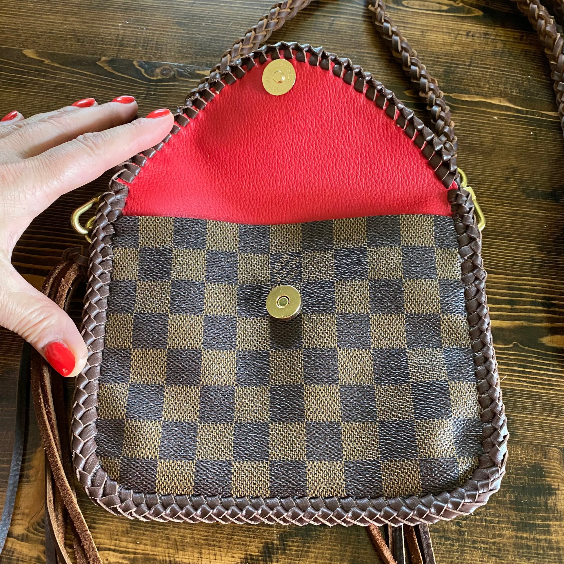 I just love how the Damier Ebene looks with the Monogram print!!! The Monogram pieces have been lined in a bright red vegan leather to match the Damier canvas. The red interior on the Damier is clean, however, there are a couple of pen marks that did not come out. This bag even has a 4" tall back pocket!!! The outside edges are brown leather lace which have been stitched by hand. There are brass D-rings secured in the back so that you can go from crossbody to wristlet to clutch! The wristlet strap is Monogram print (not shown, but will be included). The dark brown leather crossbody strap is 6 strands of braided leather that is flat where it sits across your body, and then moves to round towards the clasp. There is a small amount of fringe hanging down after the clasp that can be trimmed to your liking. The clasps are brass, and a gold button magnetic snap keeps your items secure.