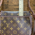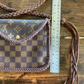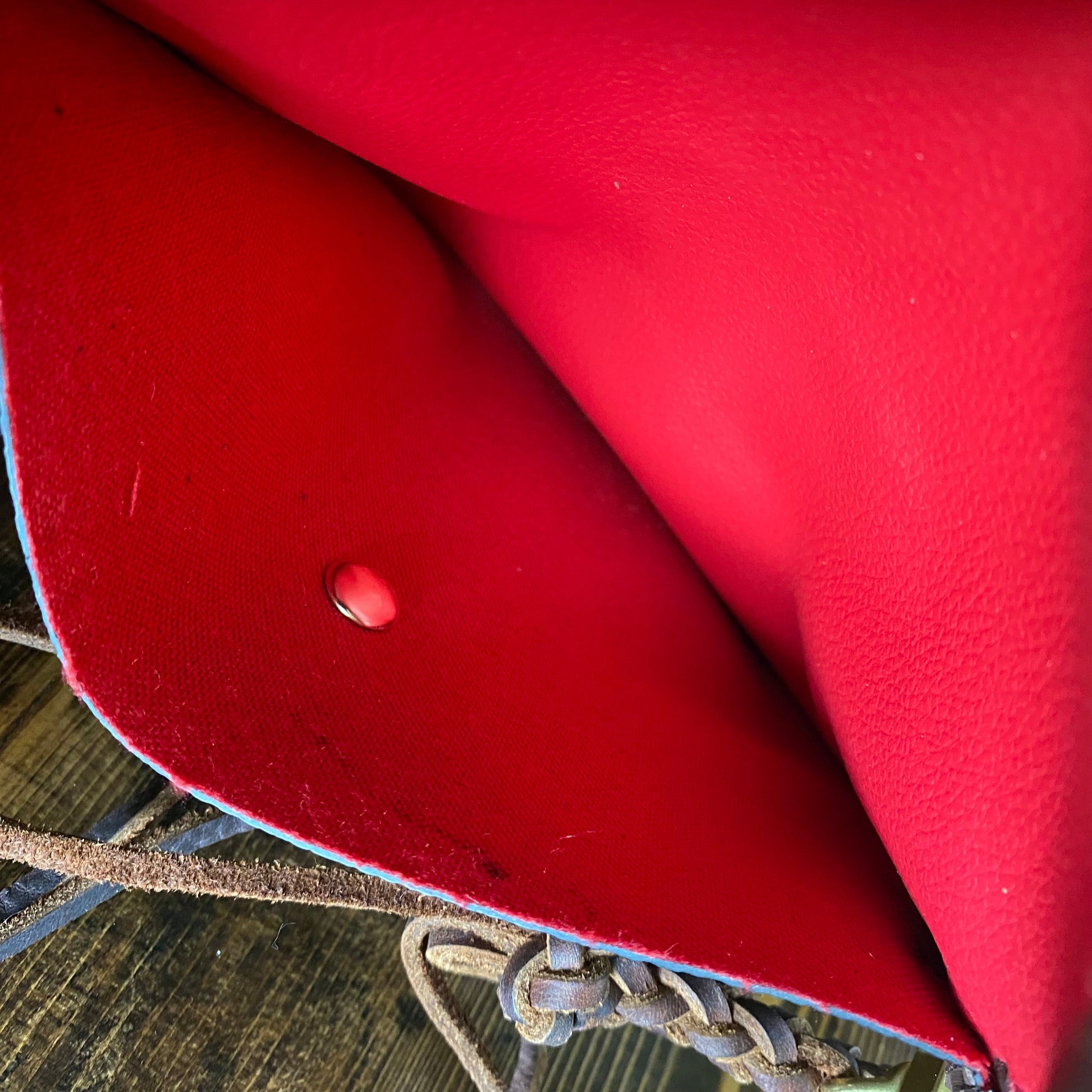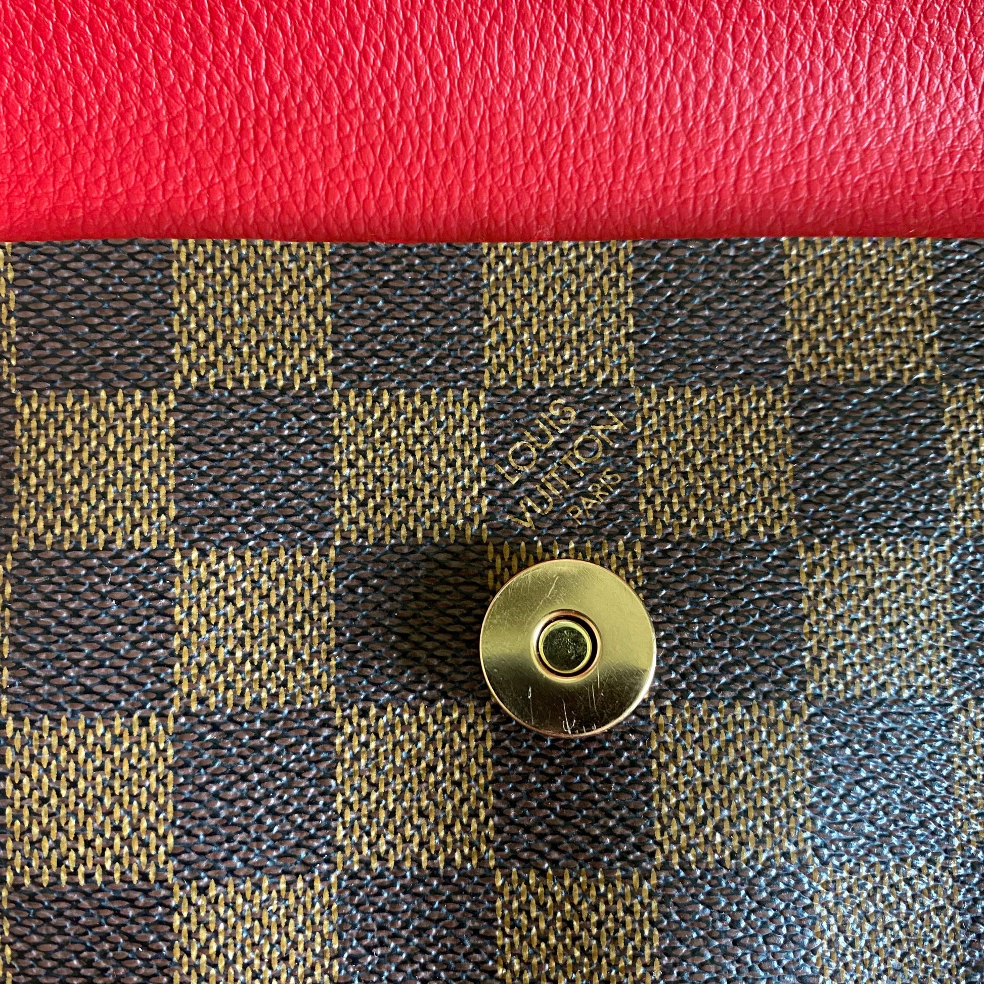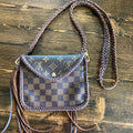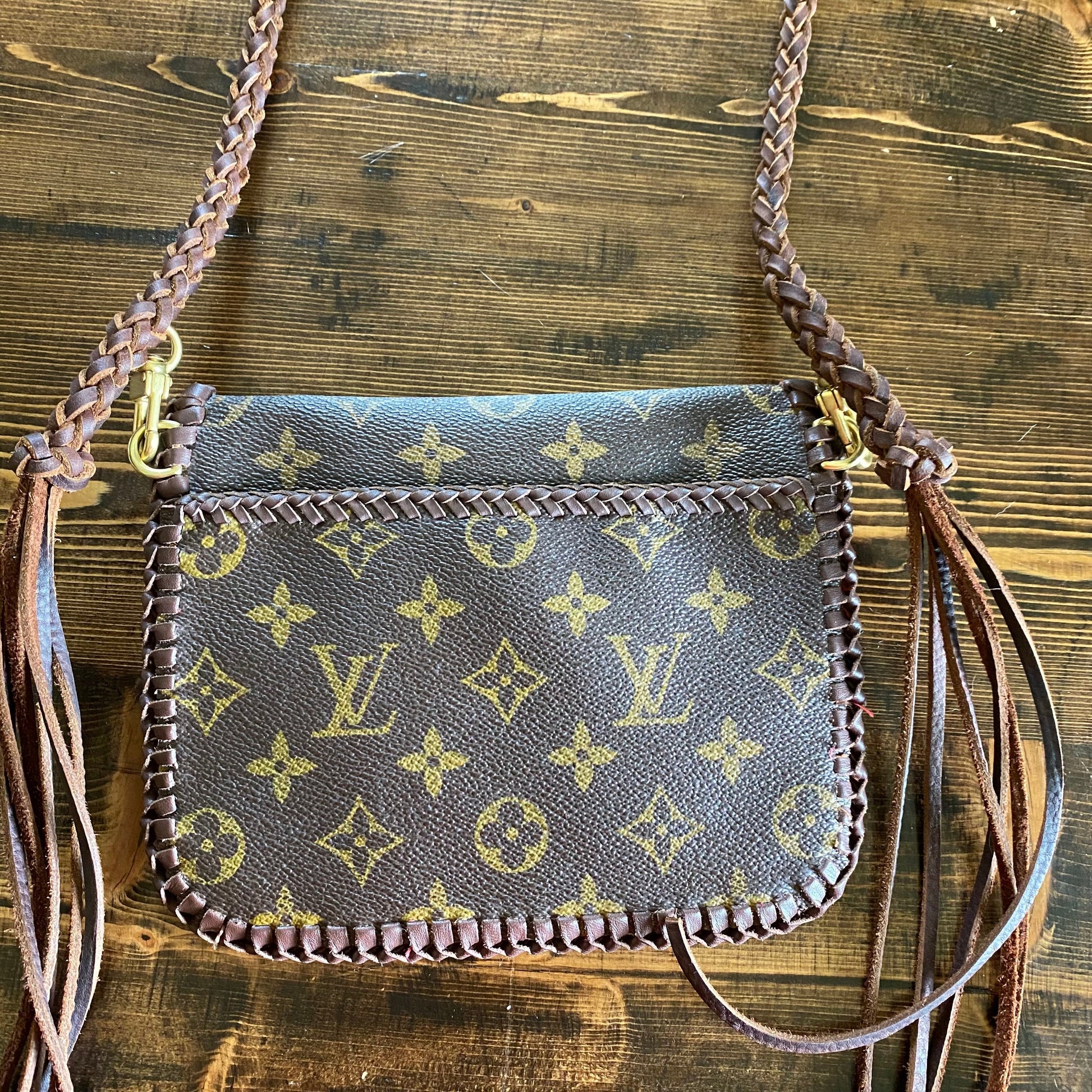 I just love how the Damier Ebene looks with the Monogram print!!! The Monogram pieces have been lined in a bright red vegan leather to match the Damier canvas. The red interior on the Damier is clean, however, there are a couple of pen marks that did not come out. This bag even has a 4" tall back pocket!!! The outside edges are brown leather lace which have been stitched by hand. There are brass D-rings secured in the back so that you can go from crossbody to wristlet to clutch! The wristlet strap is Monogram print (not shown, but will be included). The dark brown leather crossbody strap is 6 strands of braided leather that is flat where it sits across your body, and then moves to round towards the clasp. There is a small amount of fringe hanging down after the clasp that can be trimmed to your liking. The clasps are brass, and a gold button magnetic snap keeps your items secure.