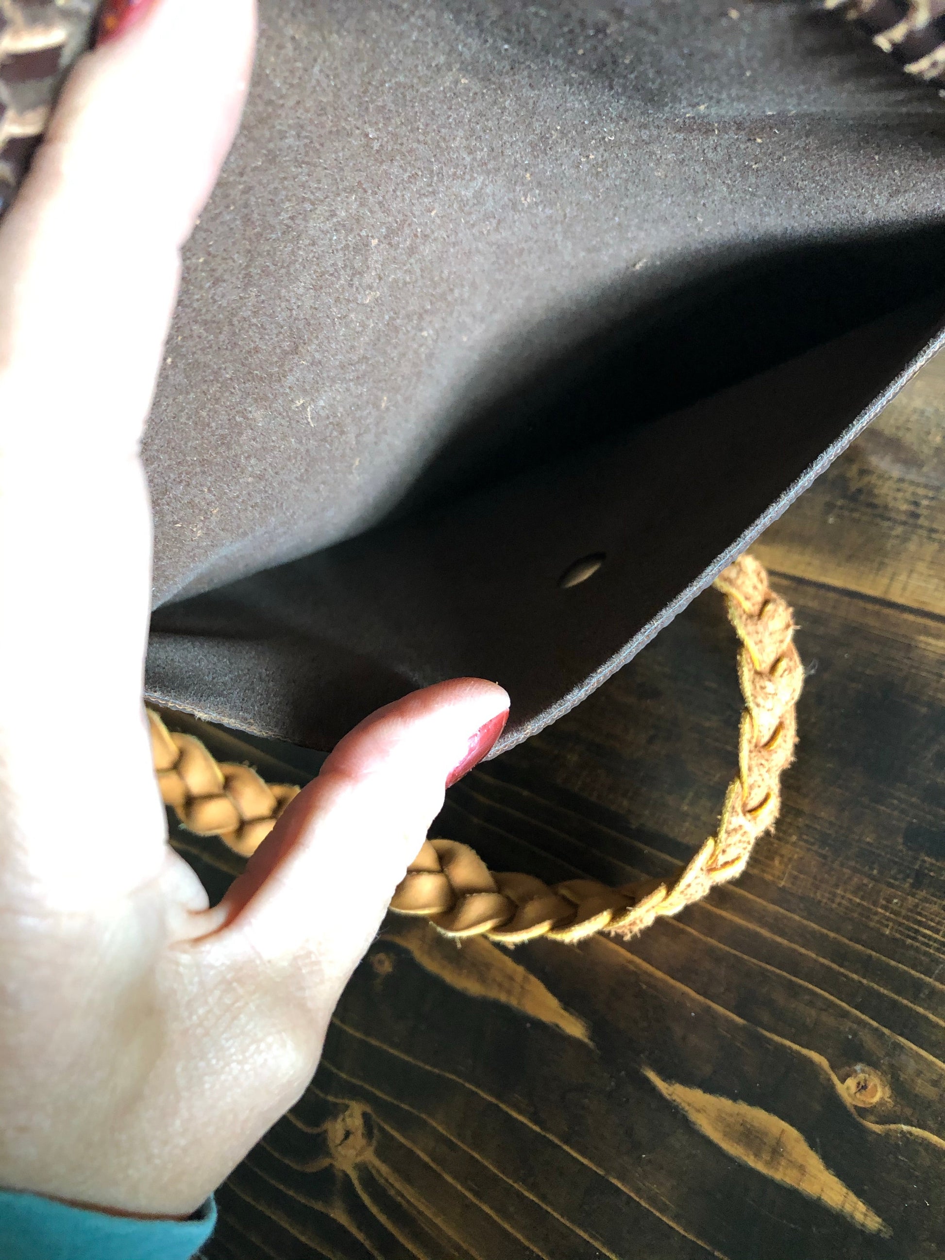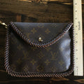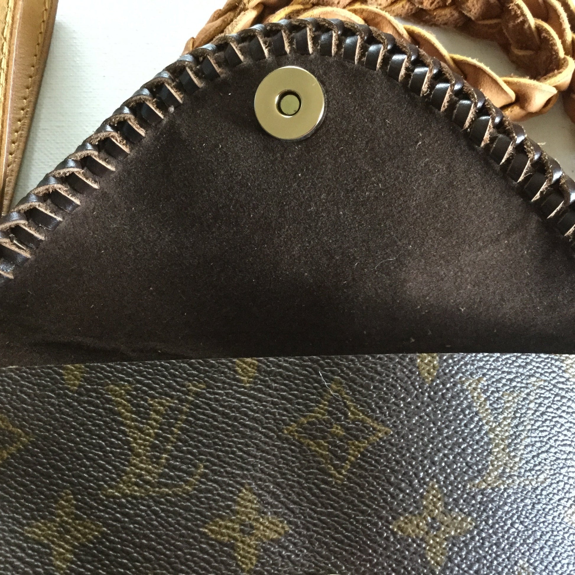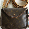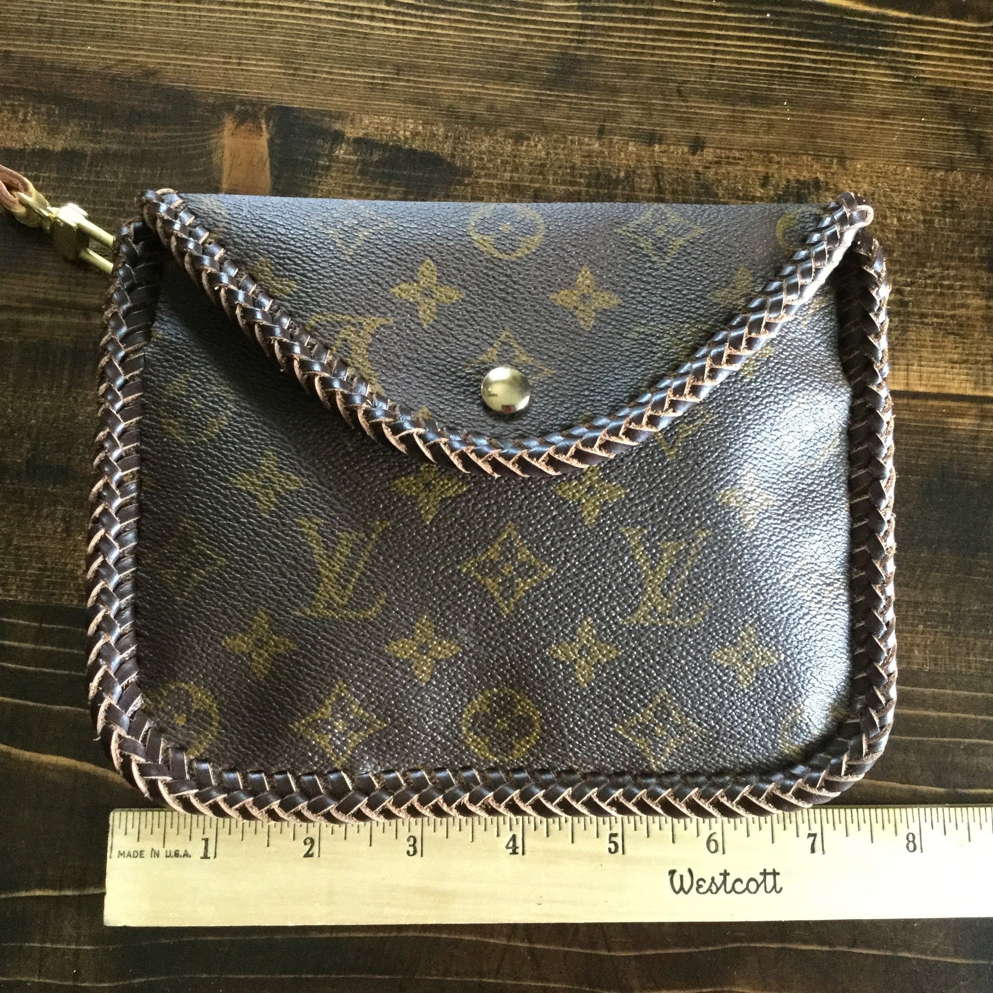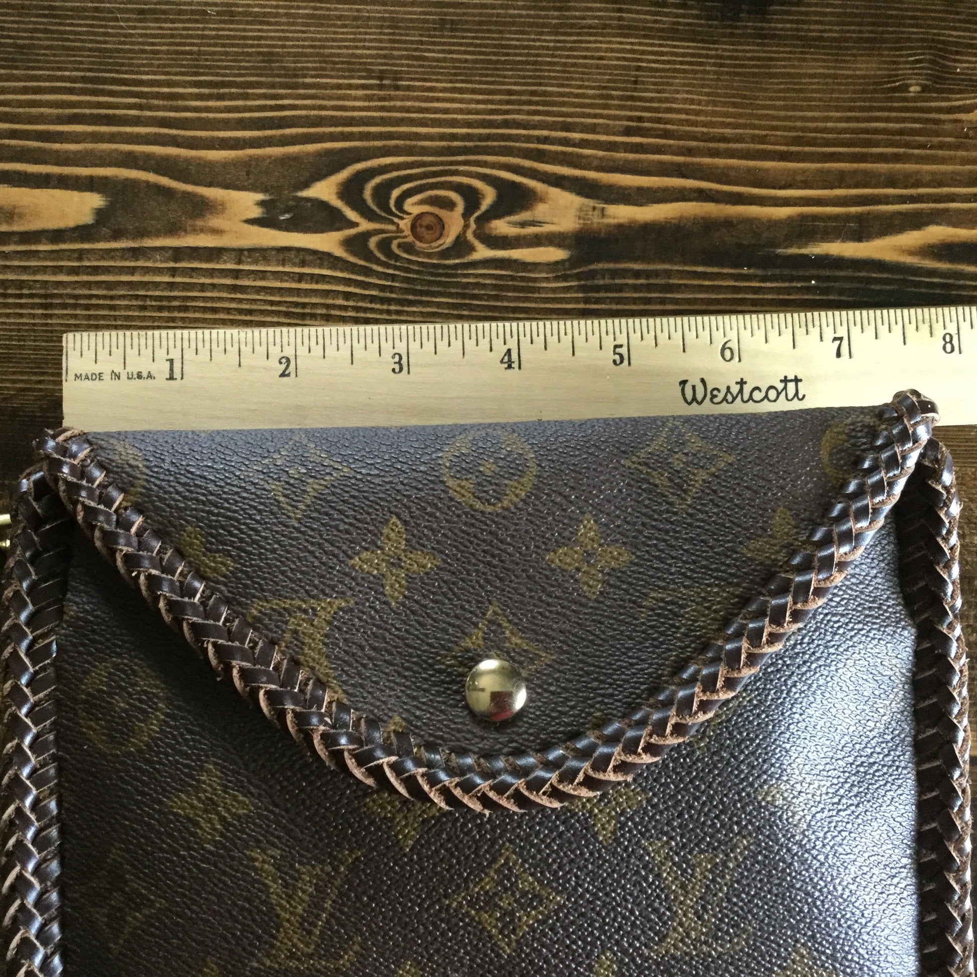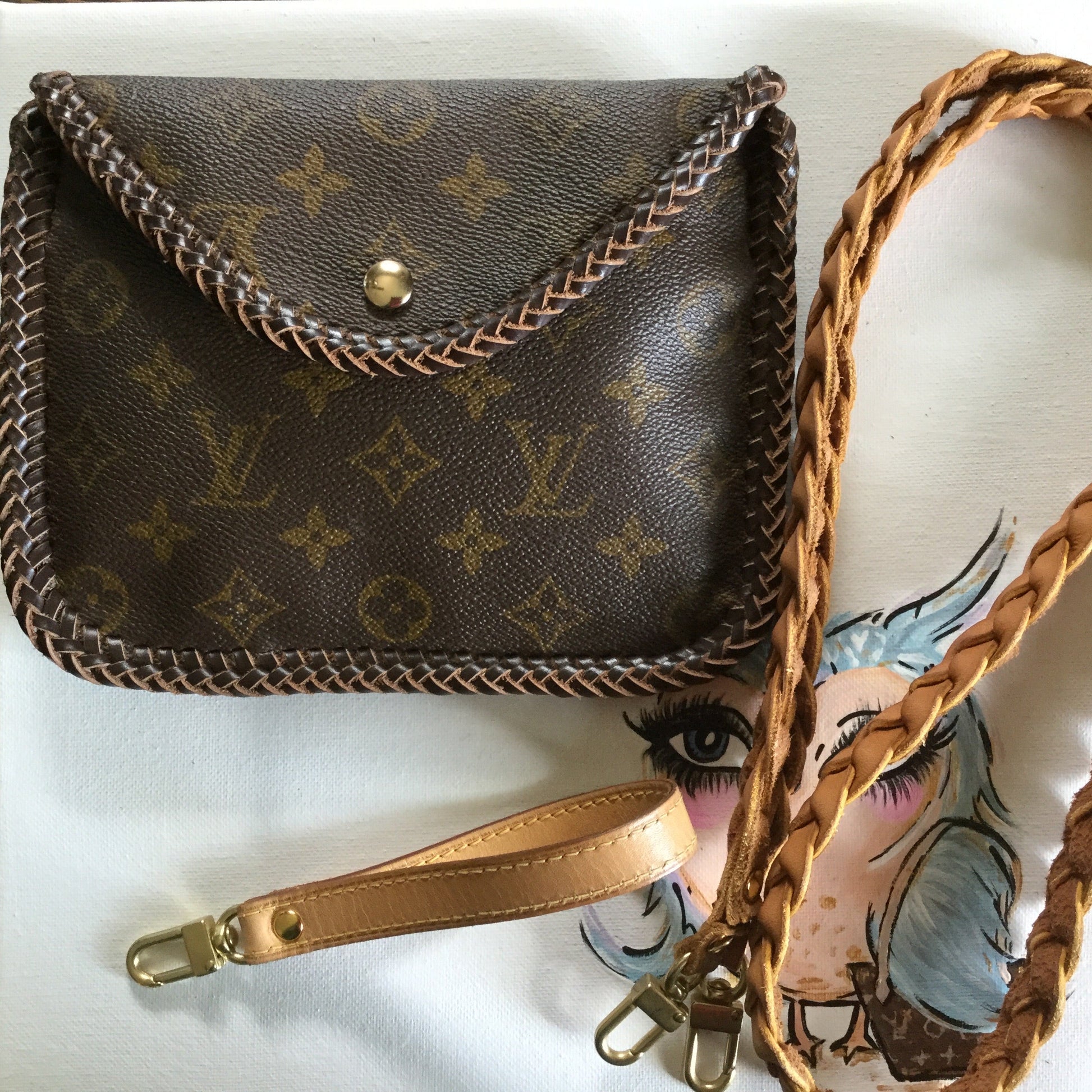 All of the monogram is lined with a brown felt in order to give the bag some substance, and make the inside uber soft! The outside edges are stitched with a little thicker brown leather lace that has been laced by hand. There are gold D-rings stitched into the back so that you can go from crossbody to wristlet to clutch! The wristlet strap is Vachetta leather from another LV bag. The tan-colored leather crossbody strap is braided together and contains LV-like brass connectors. I love the contrast of the two straps!! And remember, both straps can be removed to turn this into a beautiful clutch. The bag closes with a simple gold magnetic snap.