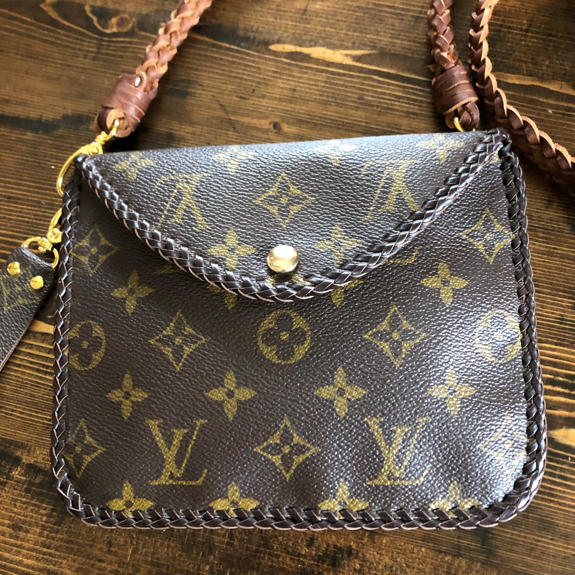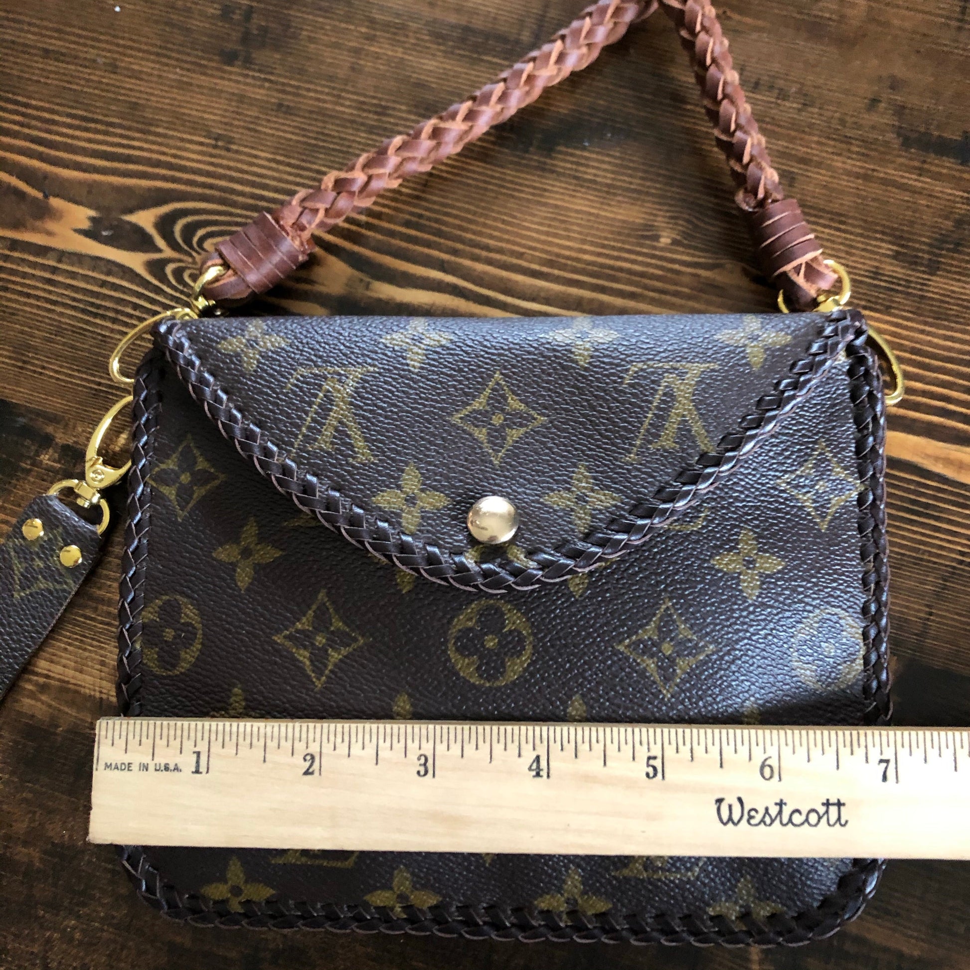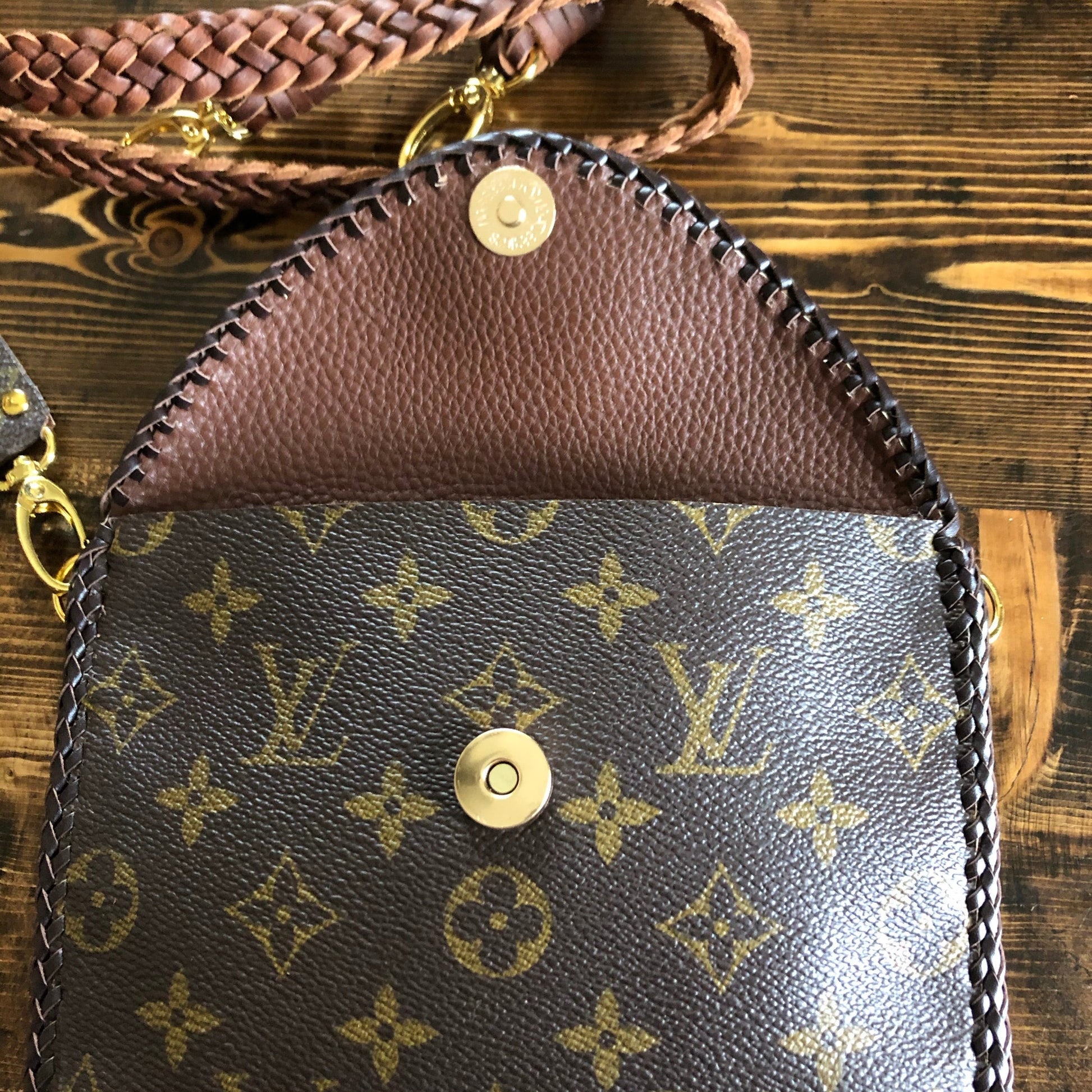 All of the monogram is lined with brown leather in order to give the bag some substance The outside edges are stitched with a brown leather lace that has been stitched by hand. There are gold D-rings stitched into the back so that you can go from crossbody to wristlet to clutch! The wristlet strap is the LV quatrefoil pattern. The brown leather crossbody strap is made of 6-strands, braided flat at the top, turning into round towards the clasps. And remember, both straps can be removed to turn this into a beautiful clutch. The bag closes with a simple gold button magnetic snap.
