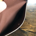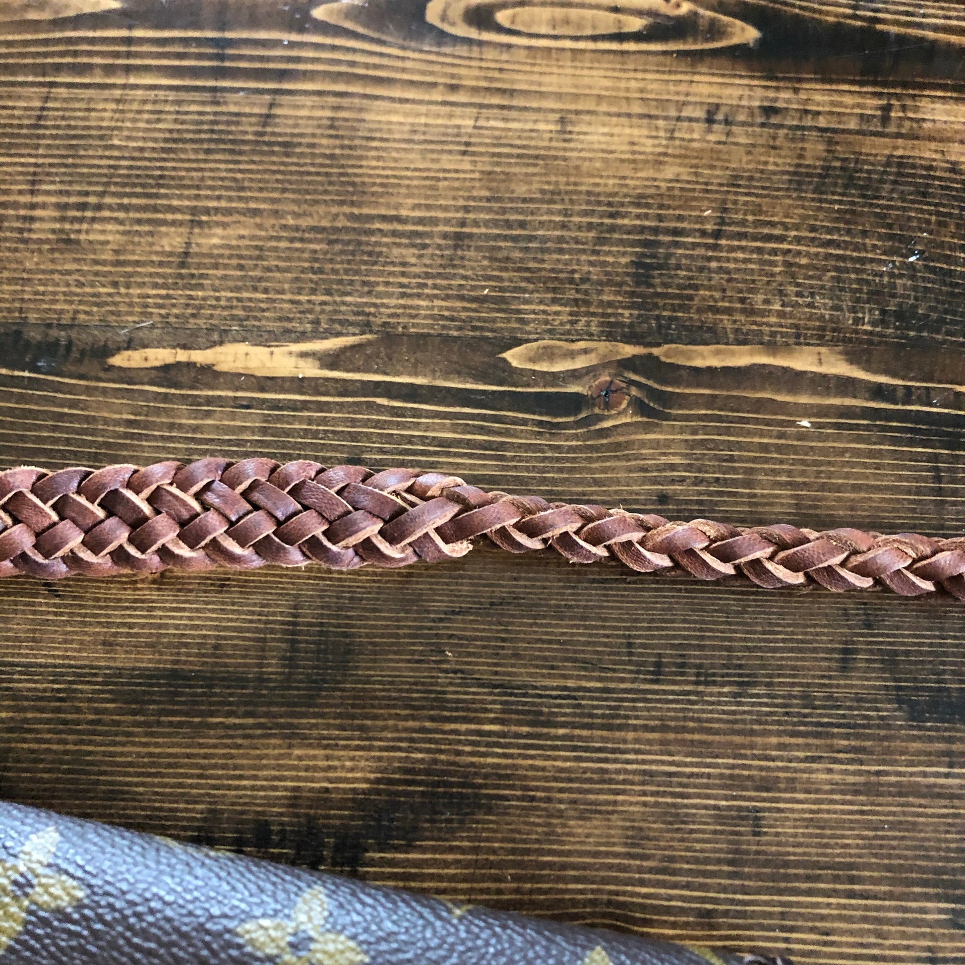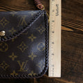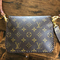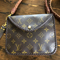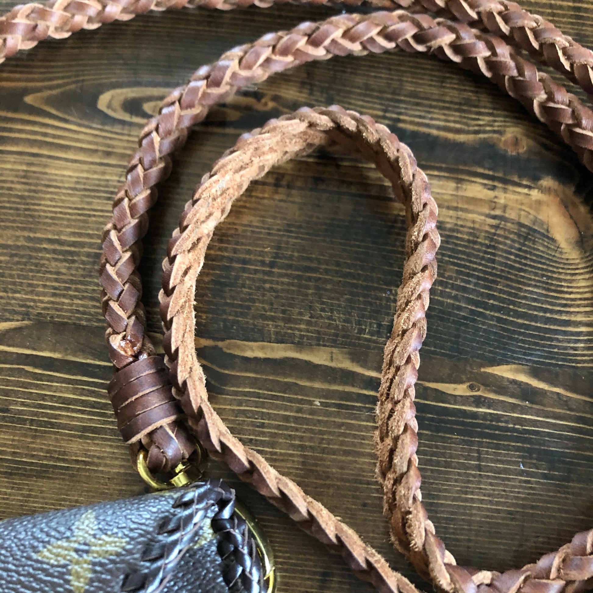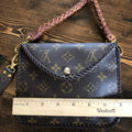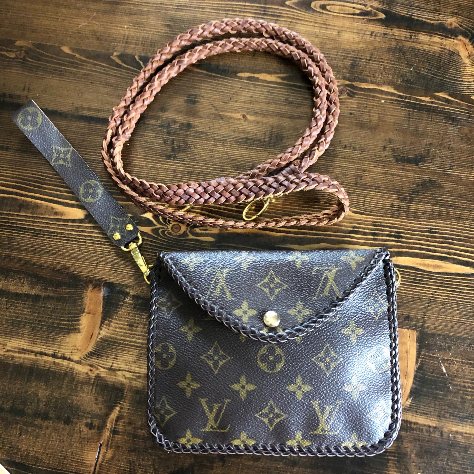 All of the monogram is lined with brown leather in order to give the bag some substance The outside edges are stitched with a brown leather lace that has been stitched by hand. There are gold D-rings stitched into the back so that you can go from crossbody to wristlet to clutch! The wristlet strap is the LV quatrefoil pattern. The brown leather crossbody strap is made of 6-strands, braided flat at the top, turning into round towards the clasps. And remember, both straps can be removed to turn this into a beautiful clutch. The bag closes with a simple gold button magnetic snap.