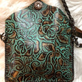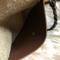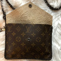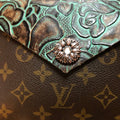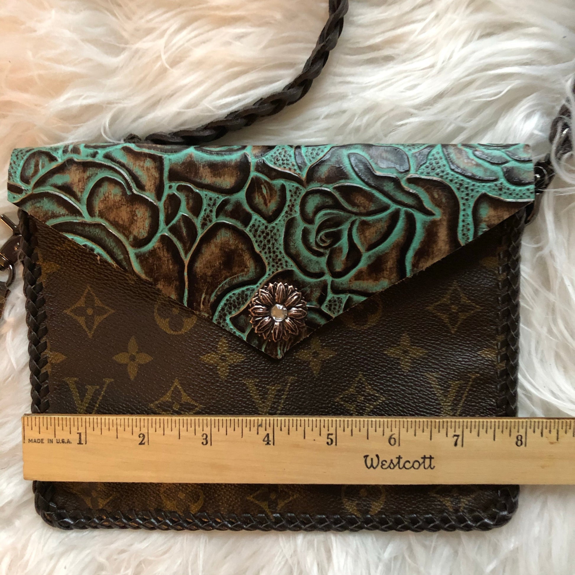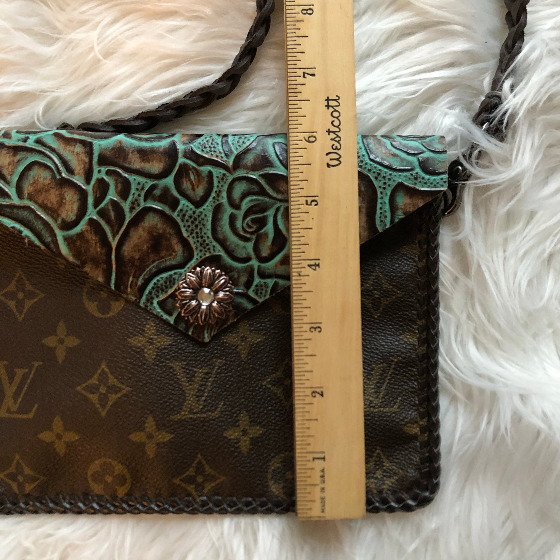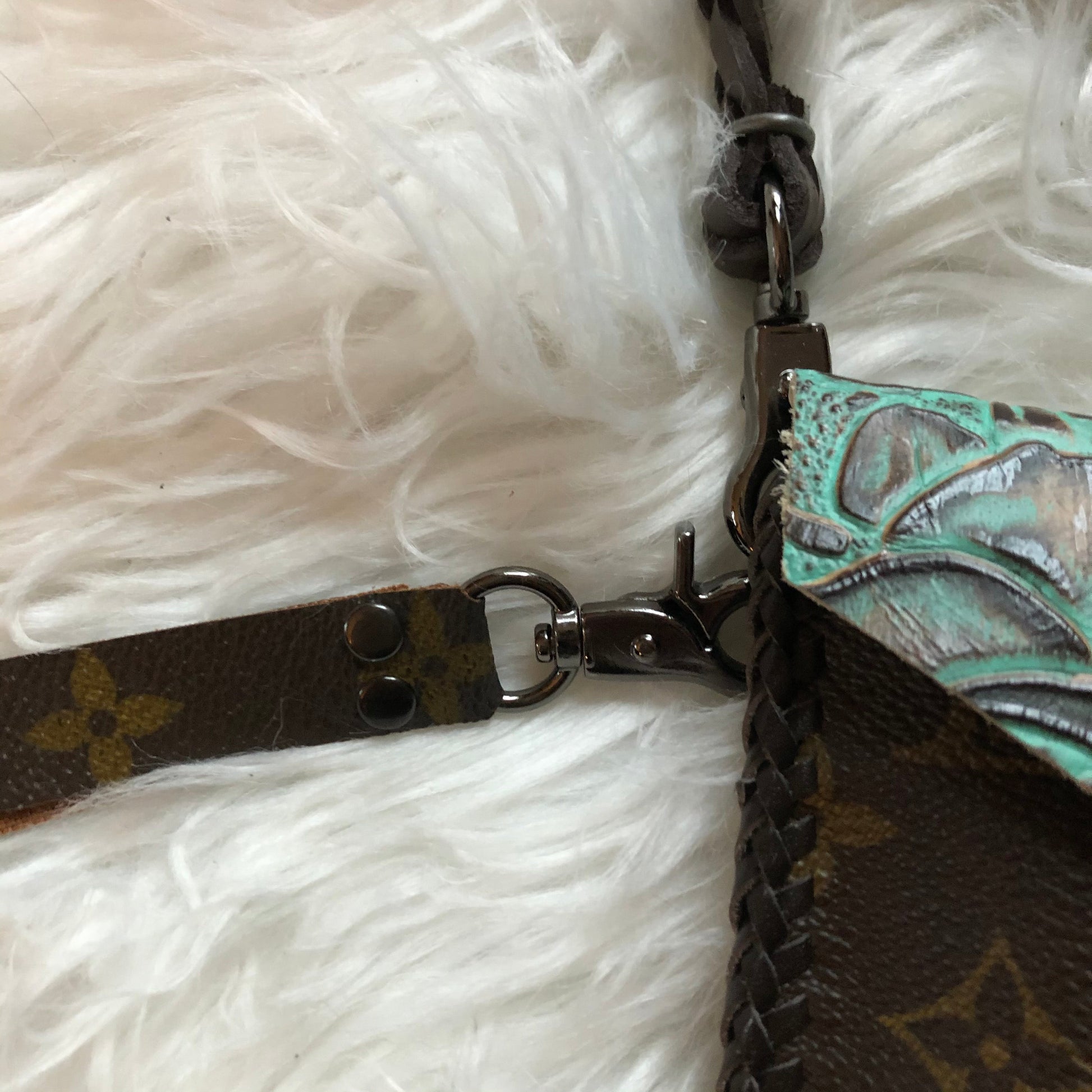 As always, an Louis Vuitton bag was used to make this one-of-a-kind piece. The monogram print is lined in brown leather, which makes the LV canvas more substantial. The back/front flap is a gorgeous tooled leather featuring chocolate brown and turquoise. It's stunning!!! The outside edges are brown leather lace which has been stitched by hand. It comes with an LV wristlet and a 4-strand brown leather strap (48"). Take both off and carry it as a clutch! There isPrestige Totes floral snap that completes the look and keeps your items secure.