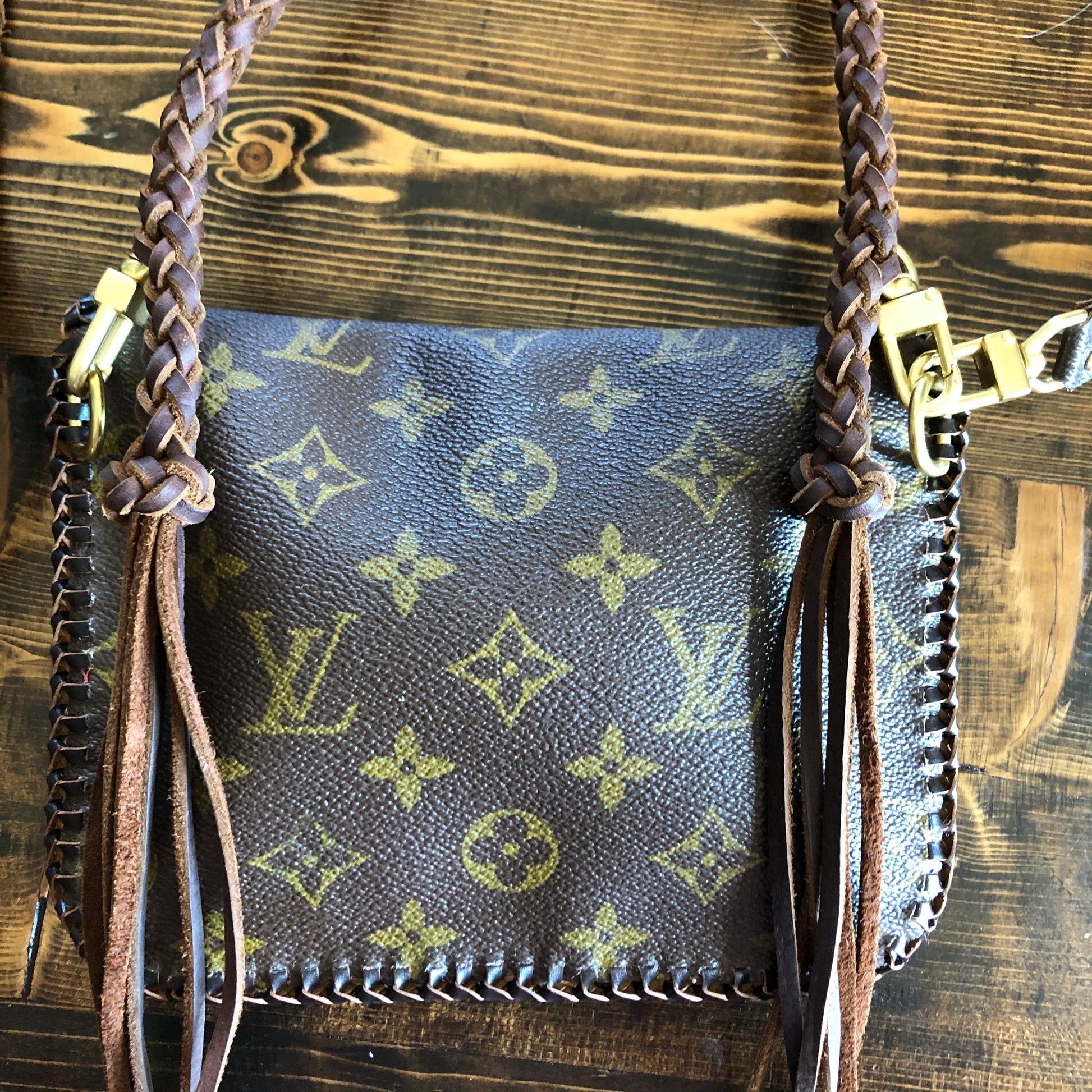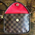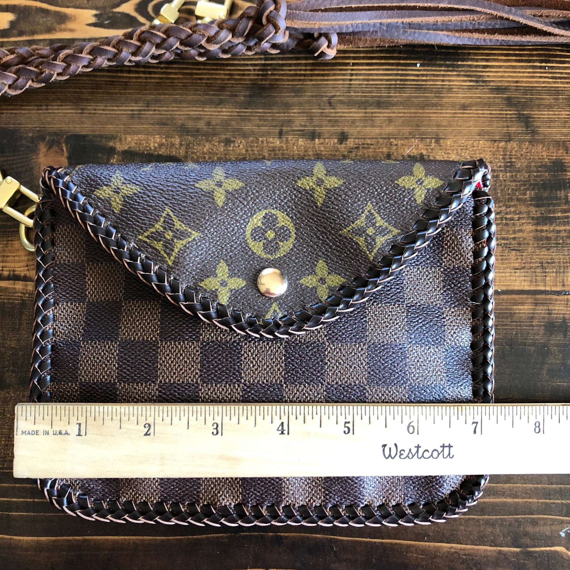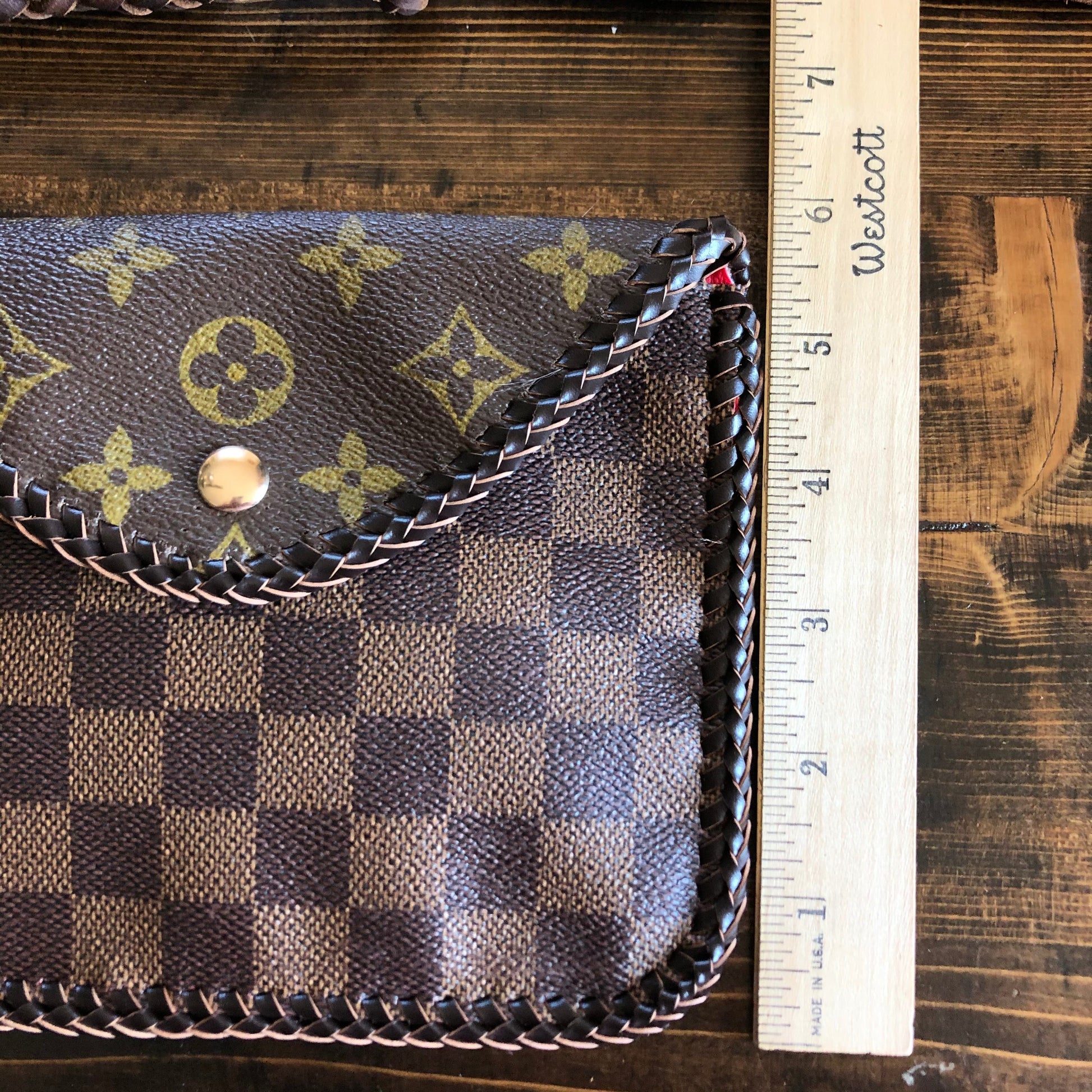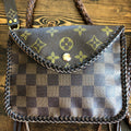 As always, Louis Vuitton bags were used to make this one-of-a-kind piece. I just love how the Damier Ebene looks with the Monogram print!!! The entire bag has been lined in a bright red vegan leather to give the canvas more of a substantial feel. The outside edge is brown leather lace which has been stitched by hand. There are brass D-rings secured in the back so that you can go from crossbody to wristlet to clutch! The wristlet strap is in Monogram. The dark brown leather crossbody strap is 6 strands braided together, with a flat section to go across your body, but then round as it moves towards the clasp. And remember, both straps can be removed to turn this into a beautiful clutch. A simple gold button magnetic snap completes this look.