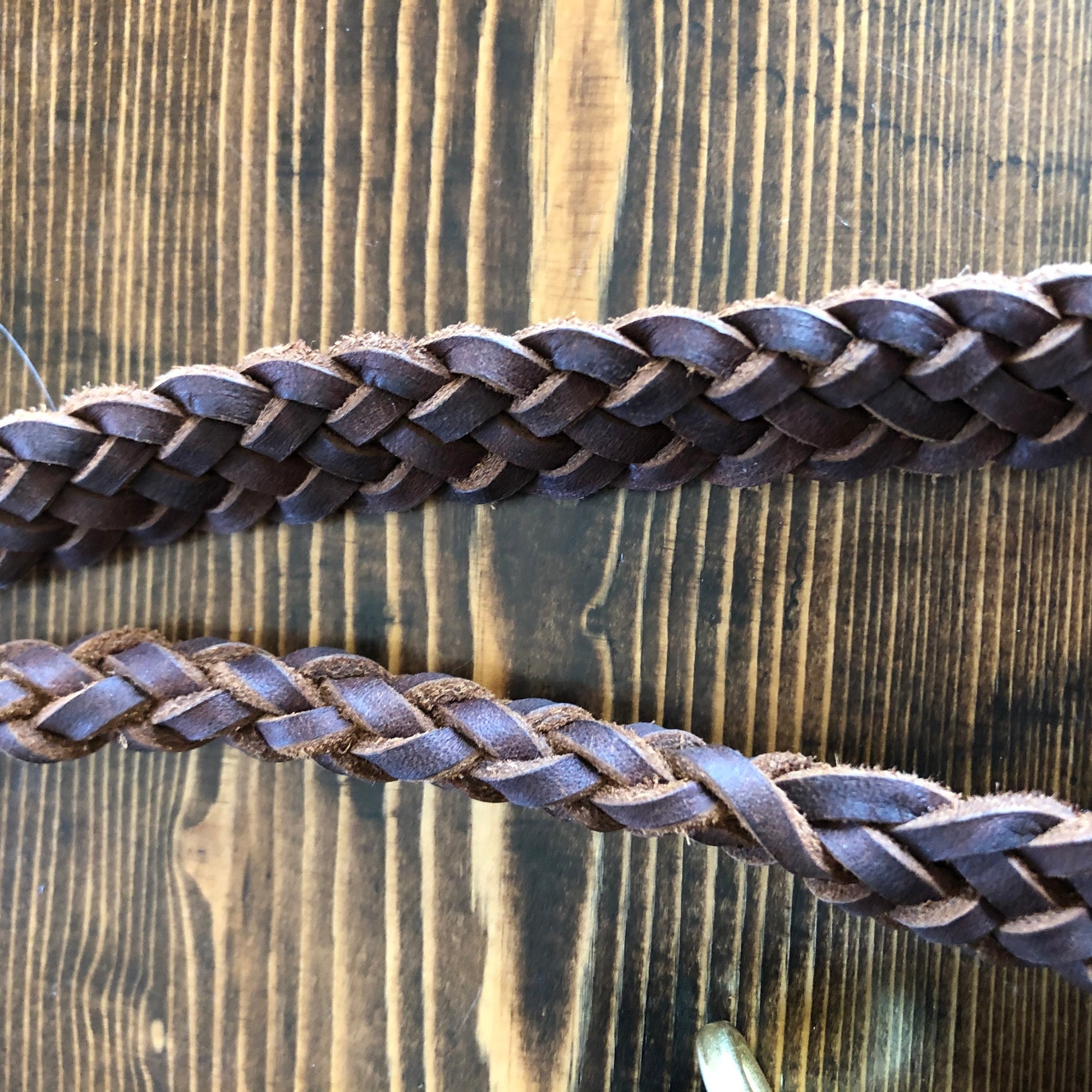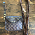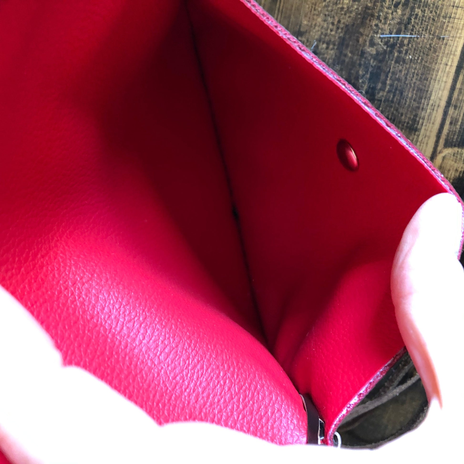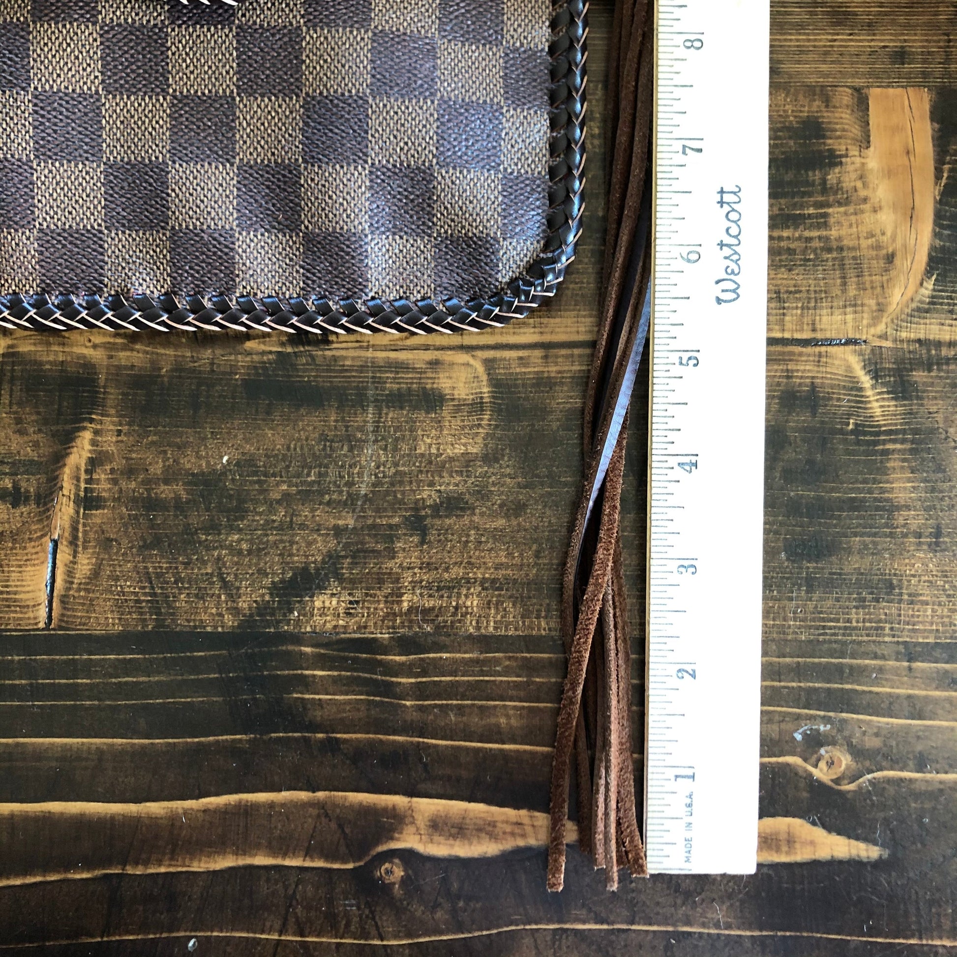 As always, Louis Vuitton bags were used to make this one-of-a-kind piece. I just love how the Damier Ebene looks with the Monogram print!!! The entire bag has been lined in a bright red vegan leather to give the canvas more of a substantial feel. The outside edge is brown leather lace which has been stitched by hand. There are brass D-rings secured in the back so that you can go from crossbody to wristlet to clutch! The wristlet strap is in Monogram. The dark brown leather crossbody strap is 6 strands braided together, with a flat section to go across your body, but then round as it moves towards the clasp. And remember, both straps can be removed to turn this into a beautiful clutch. A simple gold button magnetic snap completes this look.