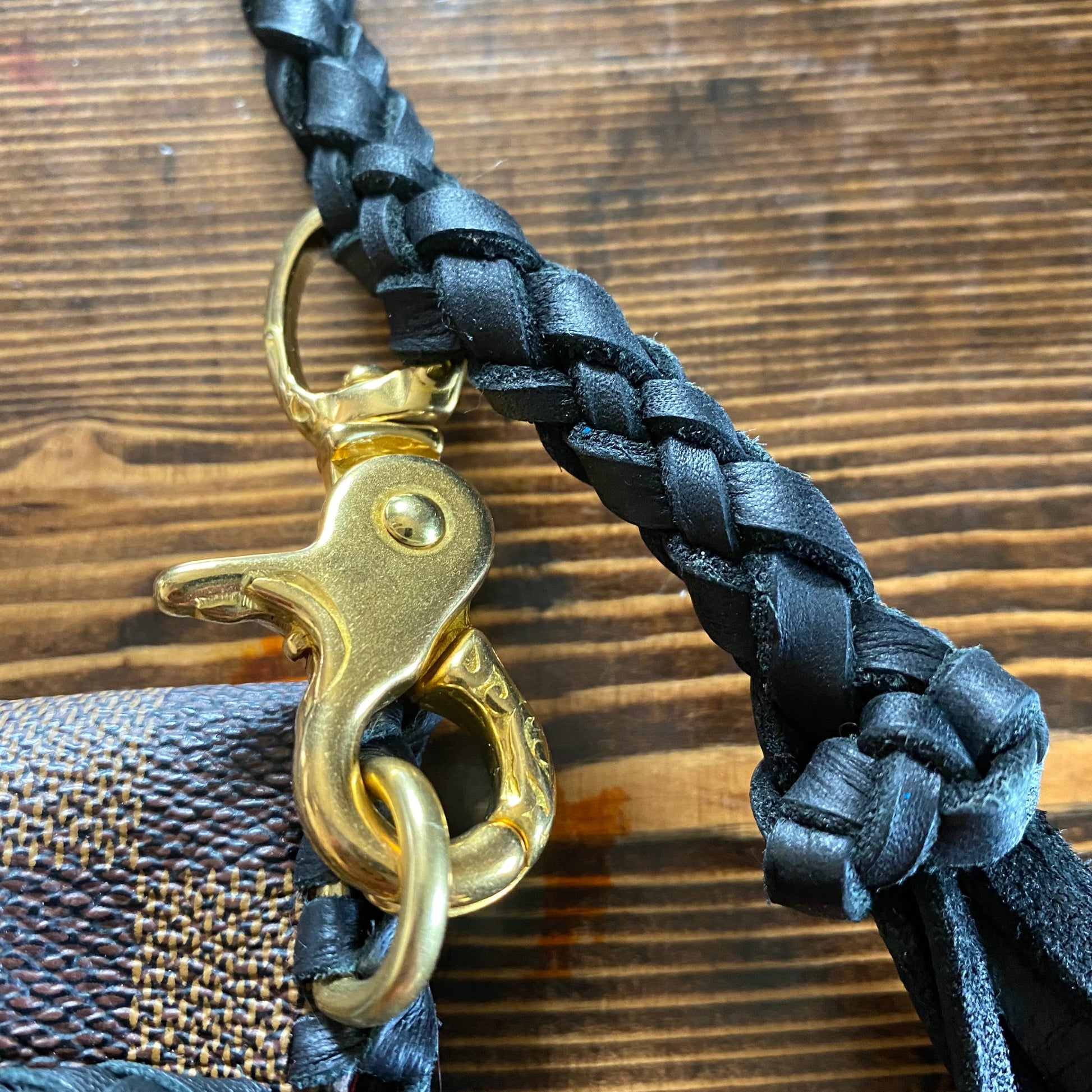 There are brass D-rings secured in the back so that you can go from crossbody to wristlet to clutch! The black leather crossbody strap is 6-strands braided together, flat where it sits across your body, tapering into round towards the very unique and pretty brass clasps. And remember, both straps can be removed to turn this into a beautiful clutch. APrestige Totes brass snap completes this look.