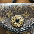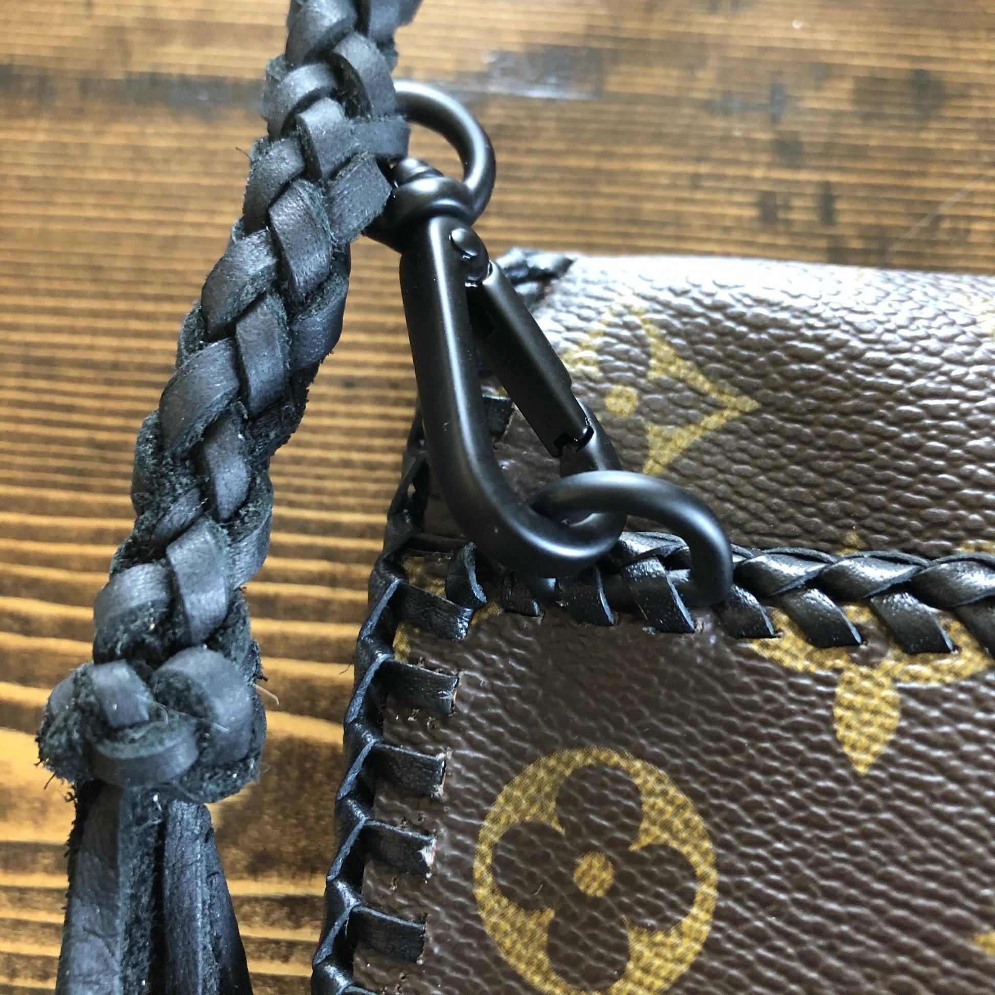 All of the monogram is lined with a black vegan leather in order to give the bag some substance. The outside edges are black leather lace which have been stitched by hand. There are black PVD D-rings stitched into the back so that you can go from crossbody to wristlet to clutch! There is a monogram wristlet strap and a black leather crossbody strap that is 48" long. It is 6-strands of braided leather that is flat where it lays across your body, and then moves to round towards the clasp. There is a small amount of fringe that hangs down after the clasp (this can be trimmed to your liking). The clasps are black PVD, and a beautifulPrestige Totes flower snap with a black stone center keeps your items secure. And remember, both straps can be removed to turn this into a beautiful clutch.