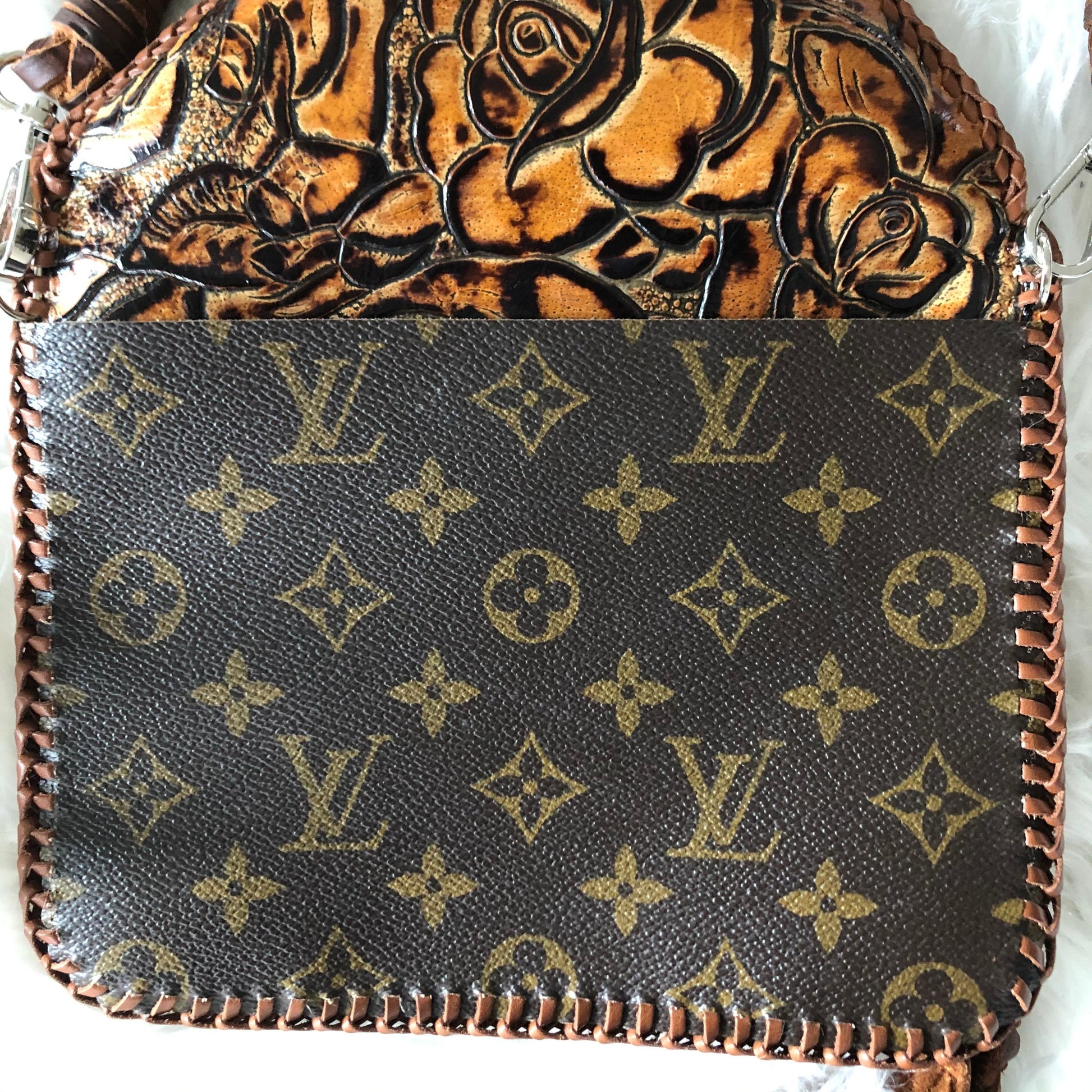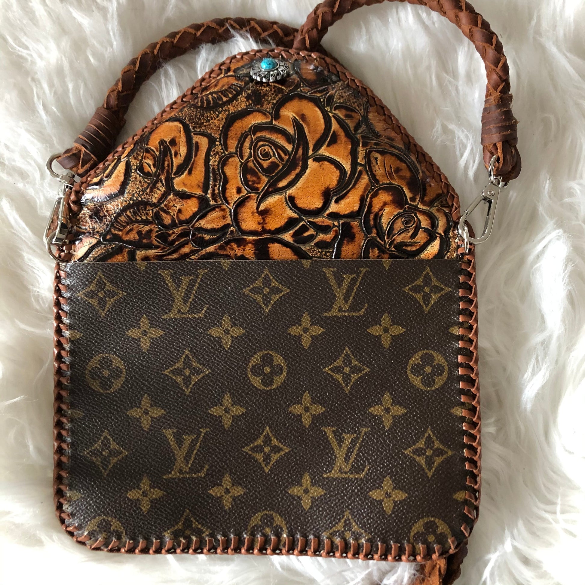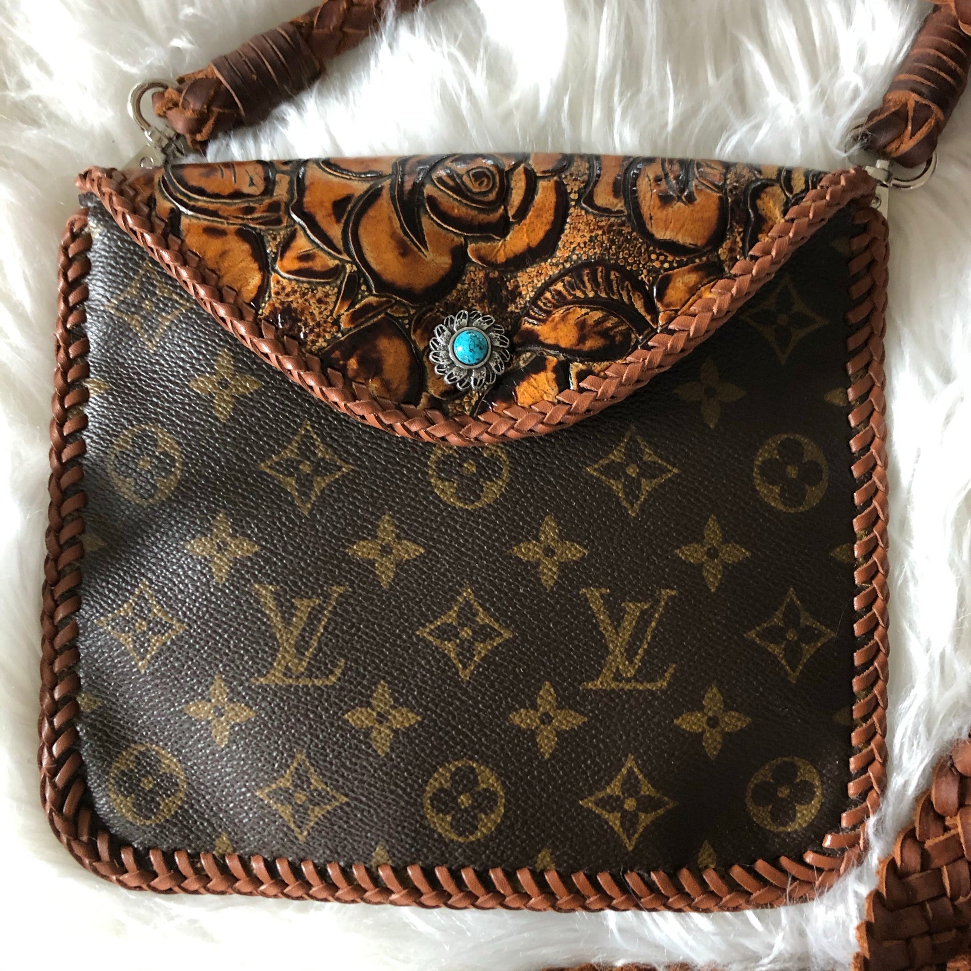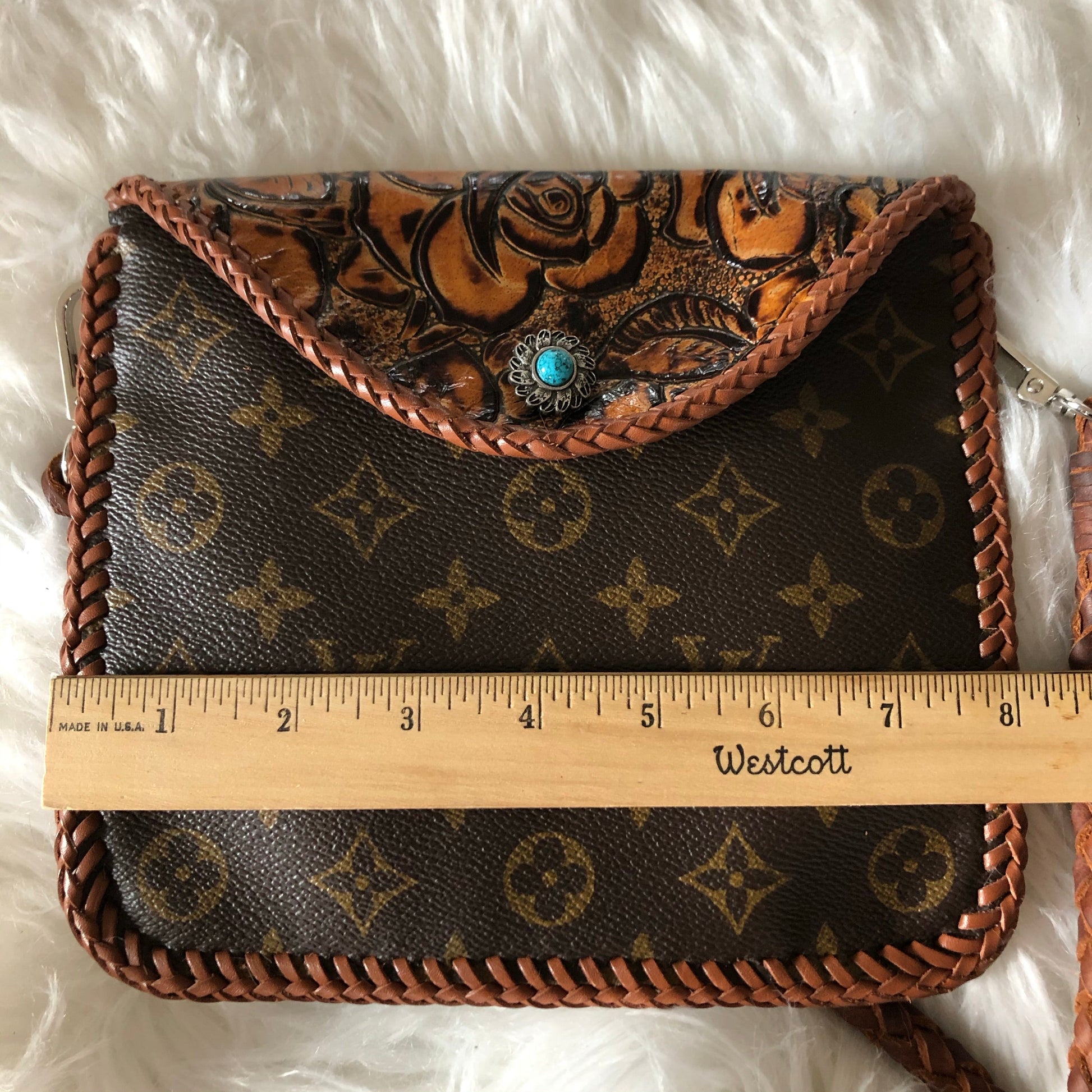 As always, an Louis Vuitton bag was used to make this one-of-a-kind piece. The monogram print is up front and on the back pocket. The front flap is gorgeous caramel colored tooled leather, it's super pretty! The outside edges are stitched by hand with brown leather lace. It comes with an LV wristlet and a brown leather crossbody stra[ that is flat where it sits across your body, but then tapers into a round section towards the clasp. (47"). Take both off and carry it as a clutch! There is small silver/turquoise concho snap that completes the look.