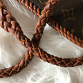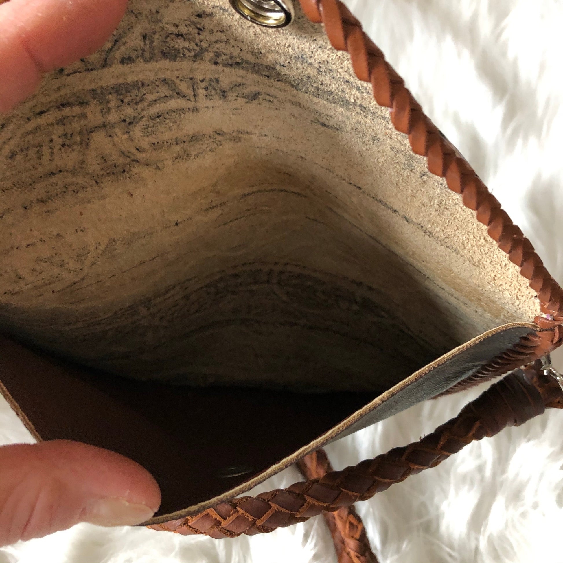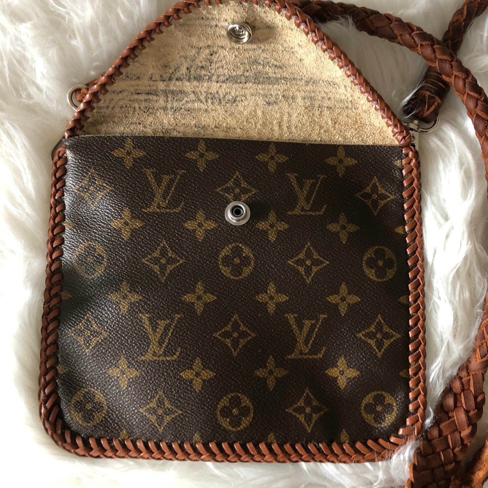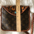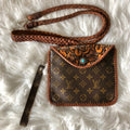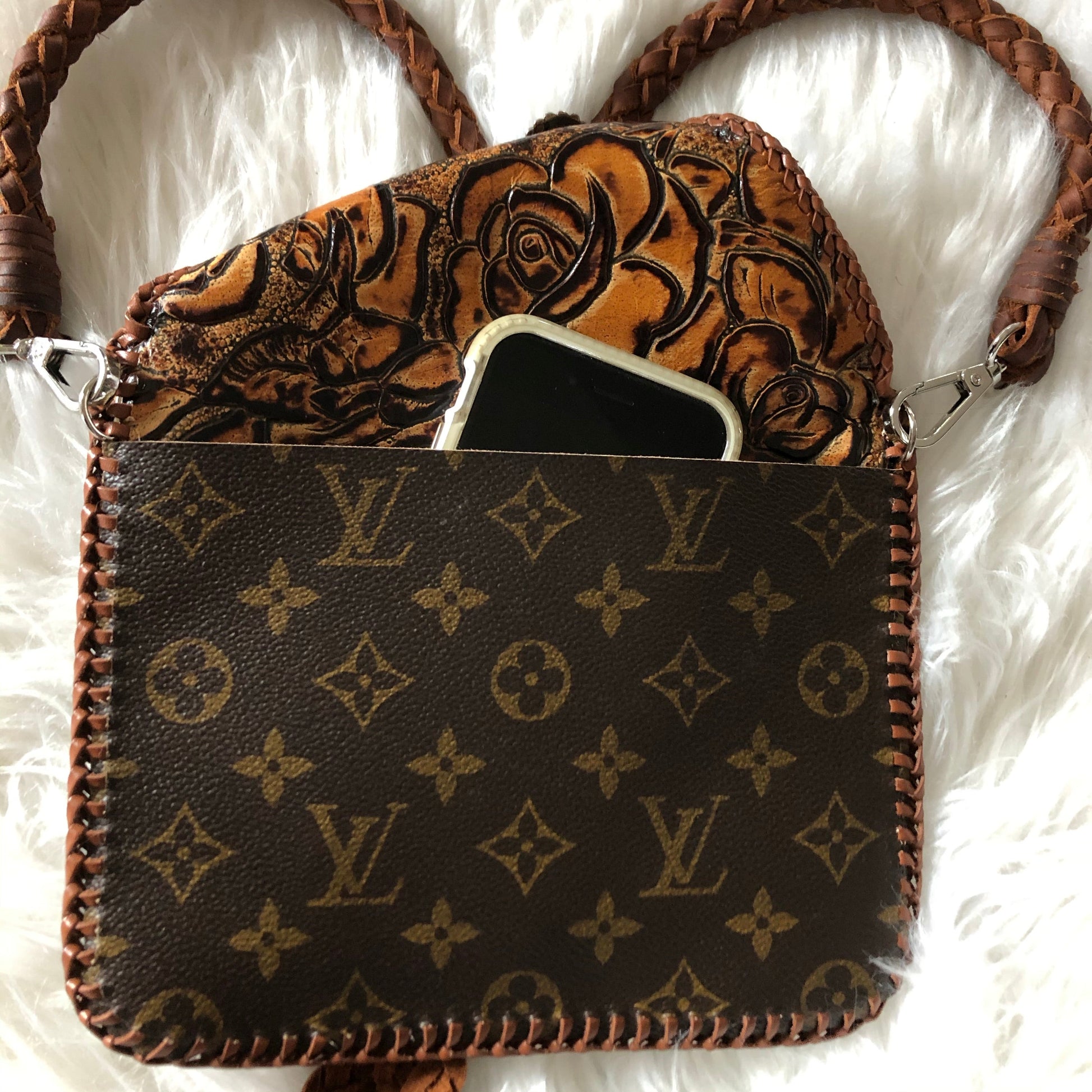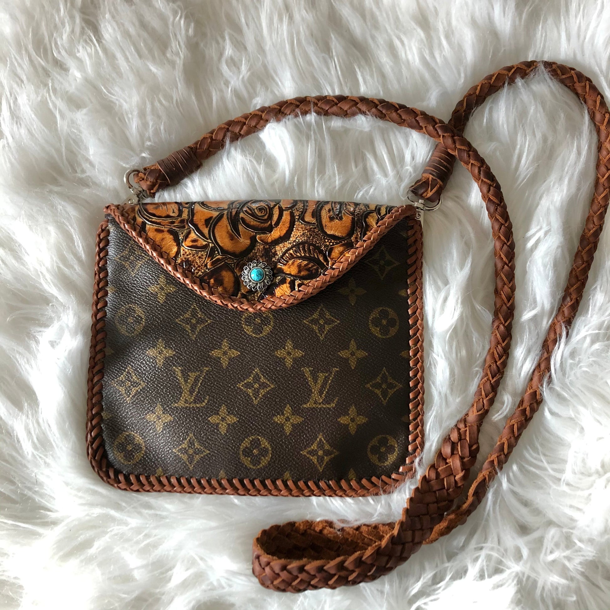 As always, an Louis Vuitton bag was used to make this one-of-a-kind piece. The monogram print is up front and on the back pocket. The front flap is gorgeous caramel colored tooled leather, it's super pretty! The outside edges are stitched by hand with brown leather lace. It comes with an LV wristlet and a brown leather crossbody stra[ that is flat where it sits across your body, but then tapers into a round section towards the clasp. (47"). Take both off and carry it as a clutch! There is small silver/turquoise concho snap that completes the look.