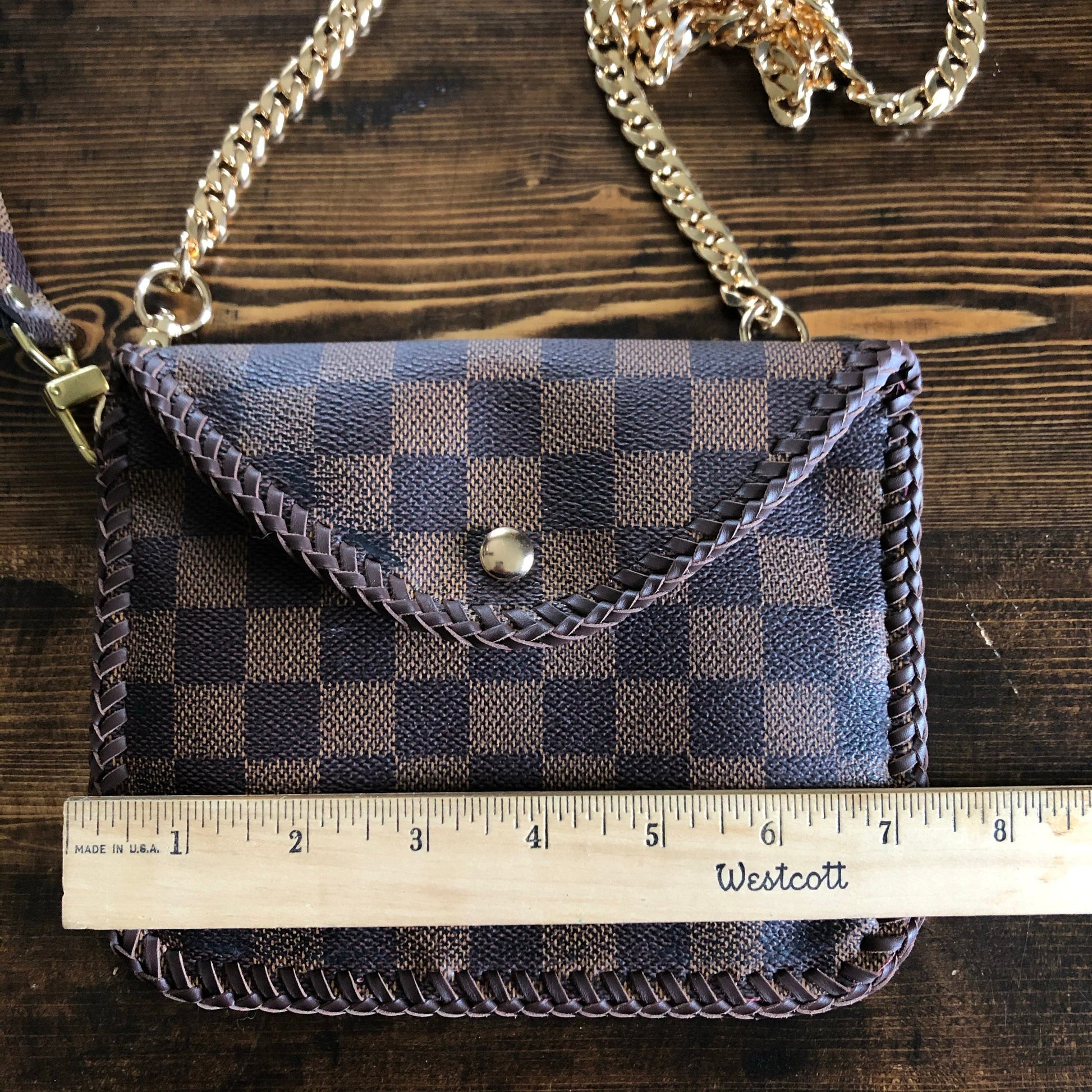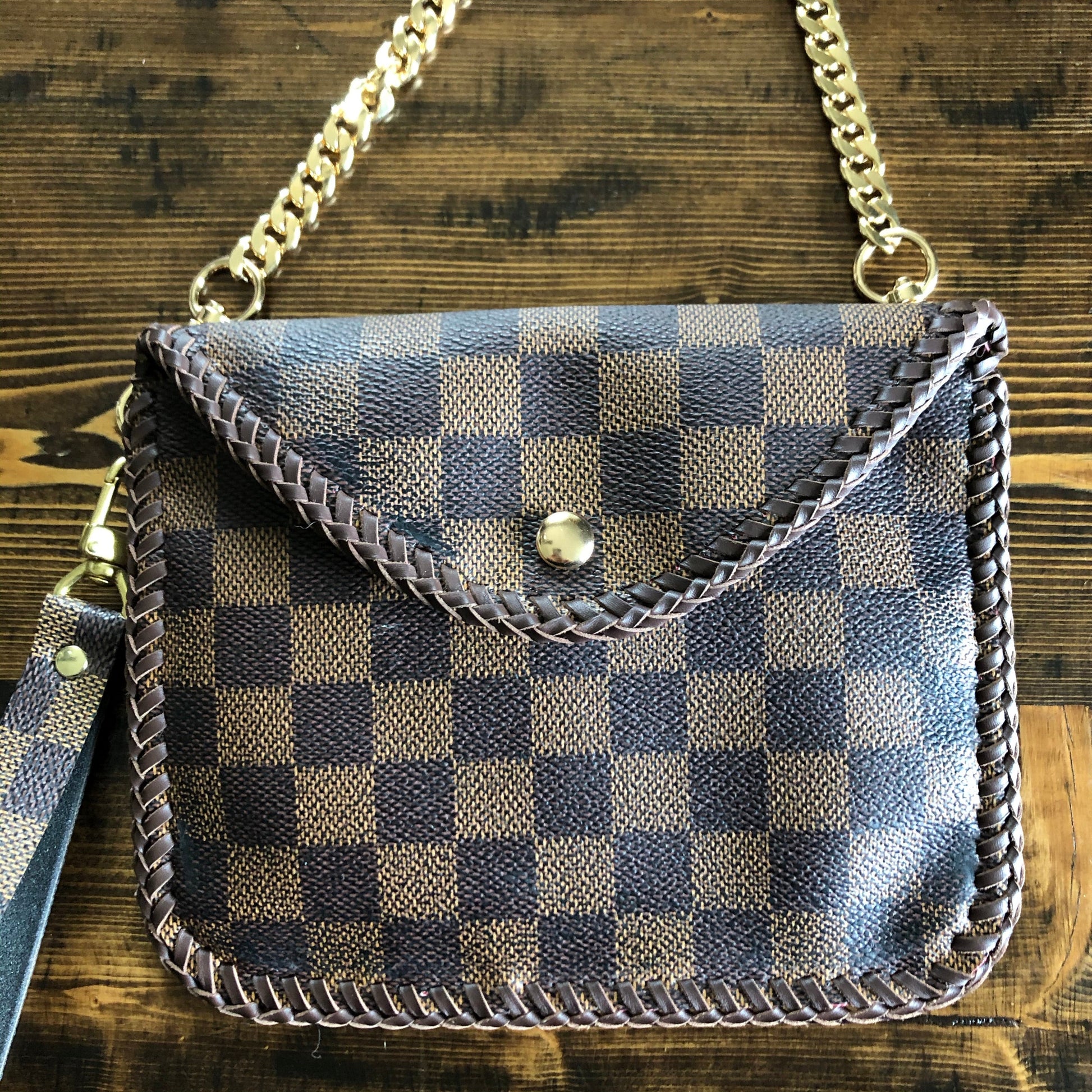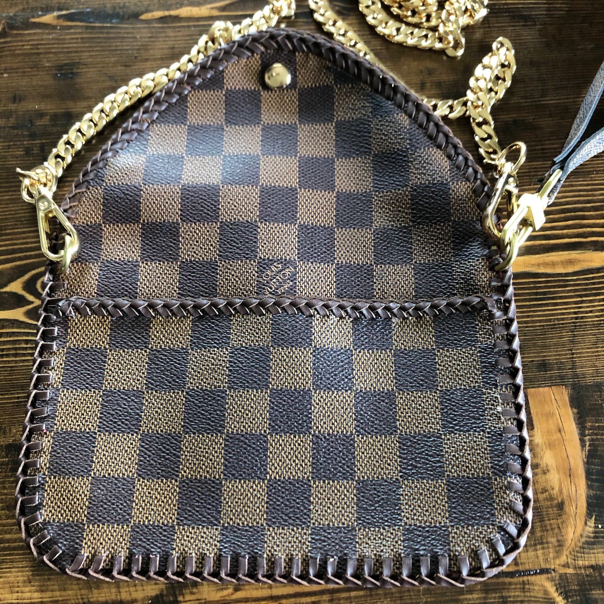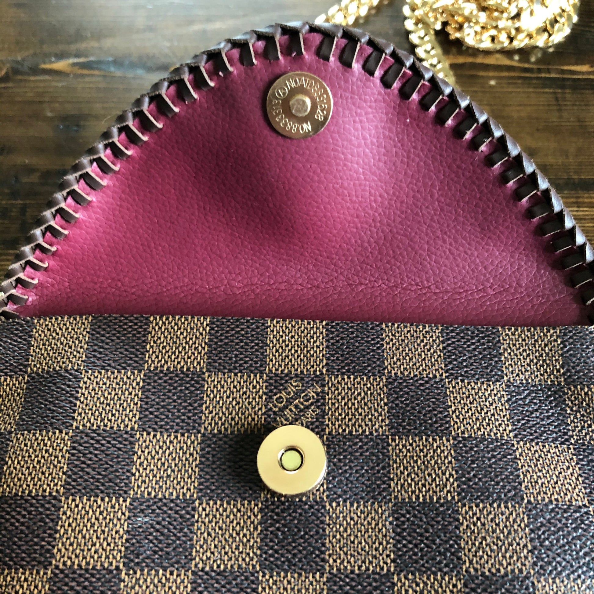 All of the LV canvas is lined with a burgundy/red vegan leather in order to give the bag some substance. The outside edges are brown leather lace which have been stitched by hand. There are brass D-rings stitched into the back so that you can go from crossbody to wristlet to clutch! There is a Damier wristlet strap included. The gold chain crossbody strap is 47" long and is perfect for wearing it crossbody. A simple gold button magnetic snap keeps your items secure. And remember, both straps can be removed to turn this into a beautiful clutch.
