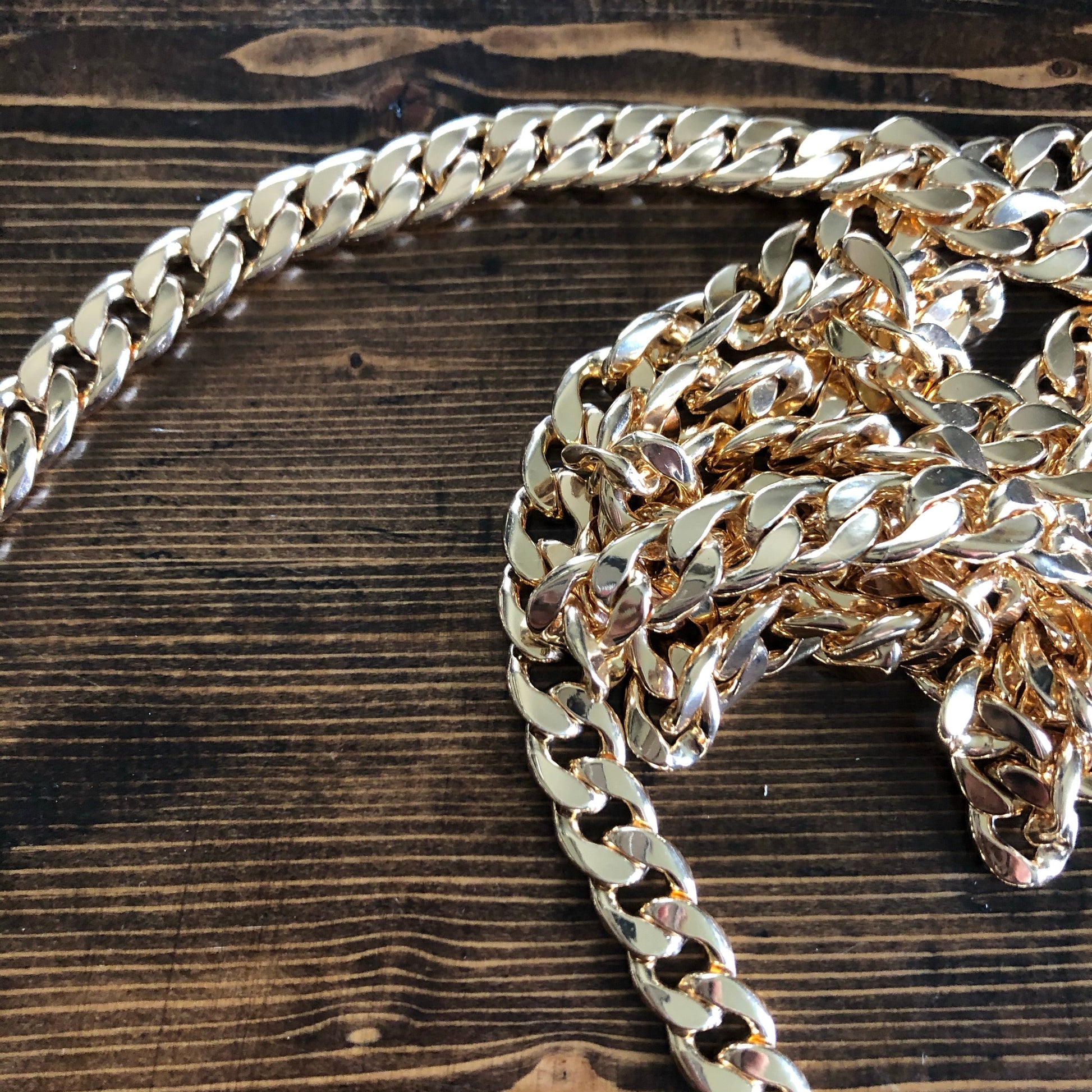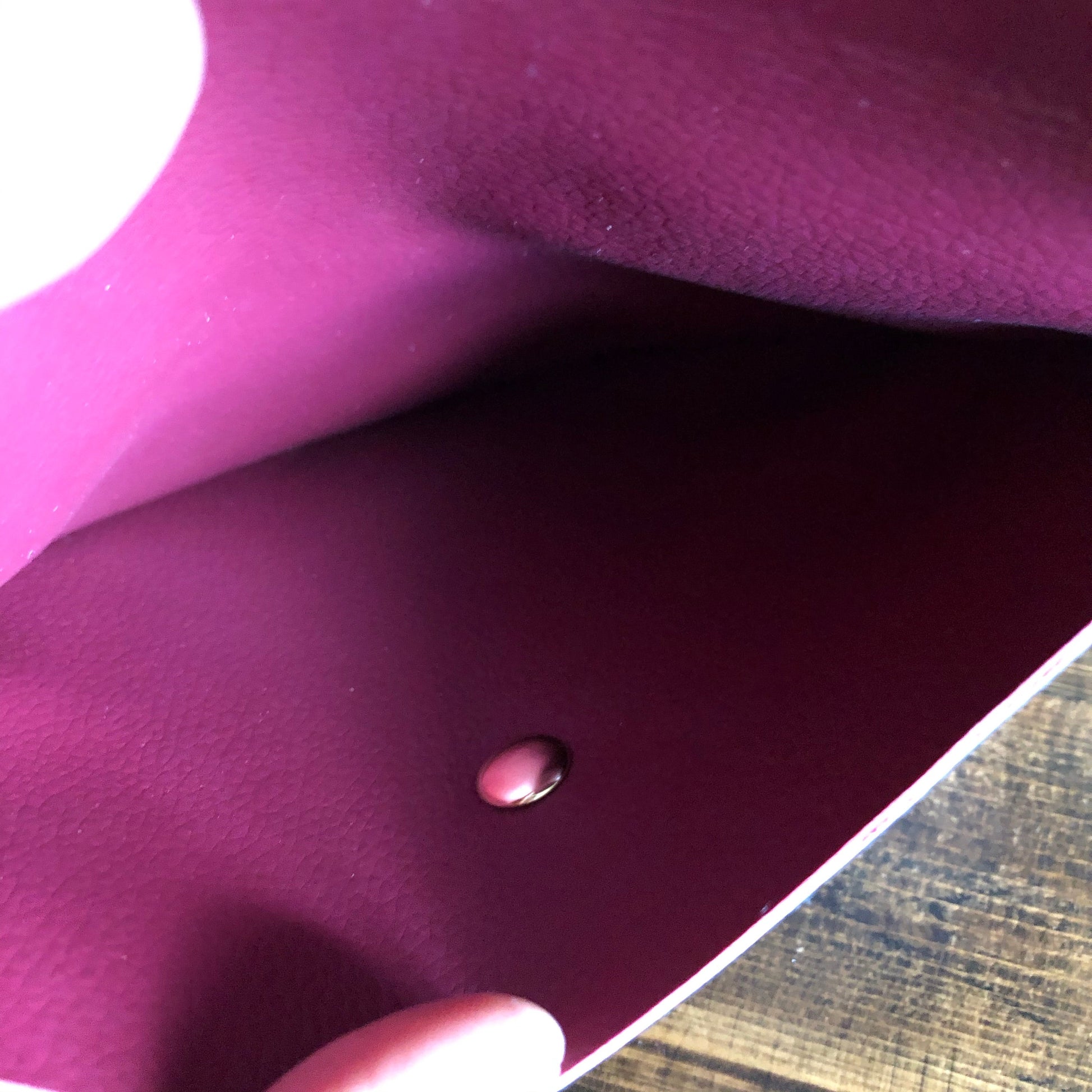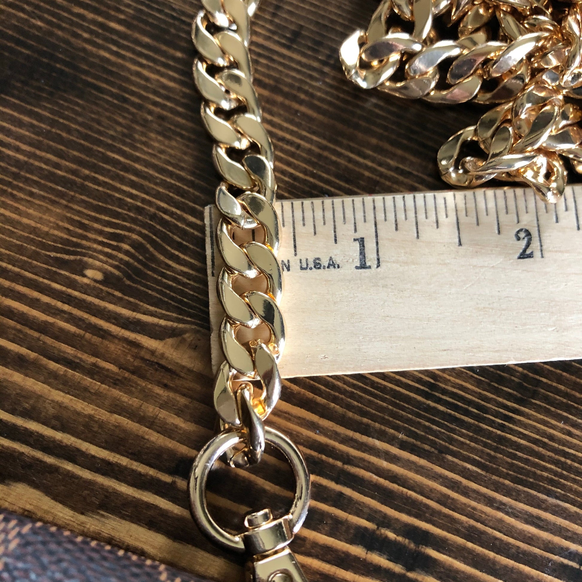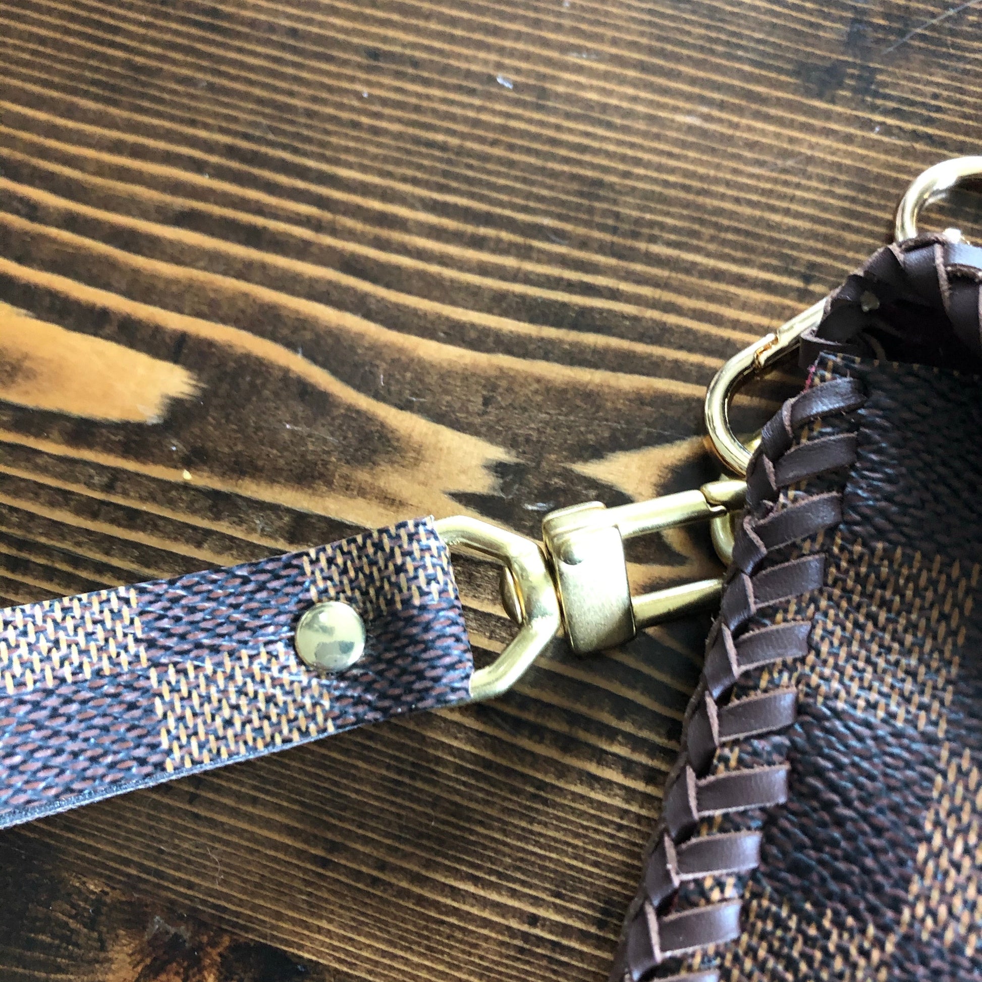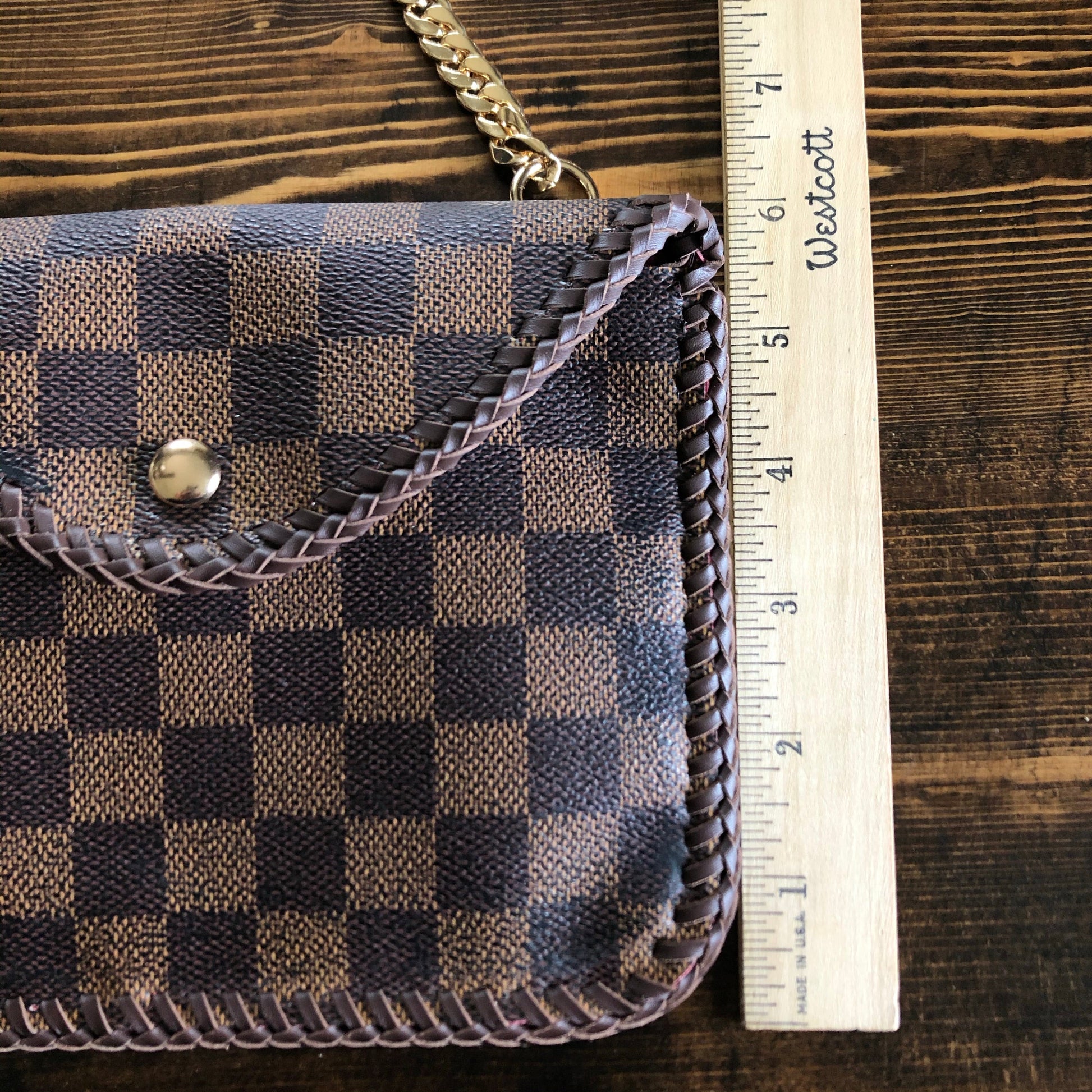 All of the LV canvas is lined with a burgundy/red vegan leather in order to give the bag some substance. The outside edges are brown leather lace which have been stitched by hand. There are brass D-rings stitched into the back so that you can go from crossbody to wristlet to clutch! There is a Damier wristlet strap included. The gold chain crossbody strap is 47" long and is perfect for wearing it crossbody. A simple gold button magnetic snap keeps your items secure. And remember, both straps can be removed to turn this into a beautiful clutch.