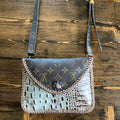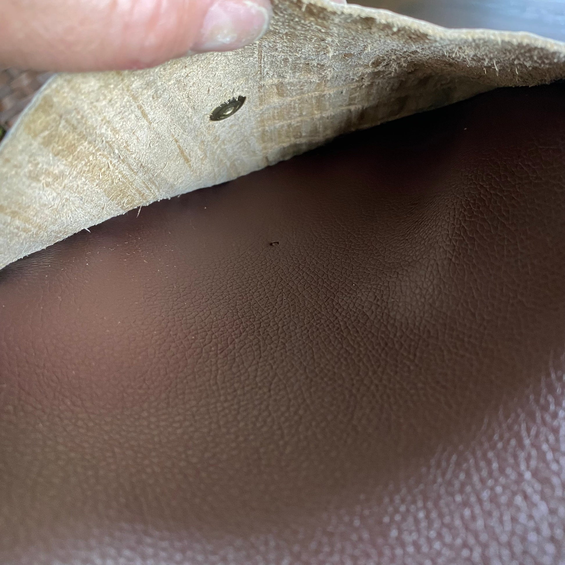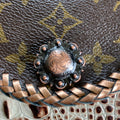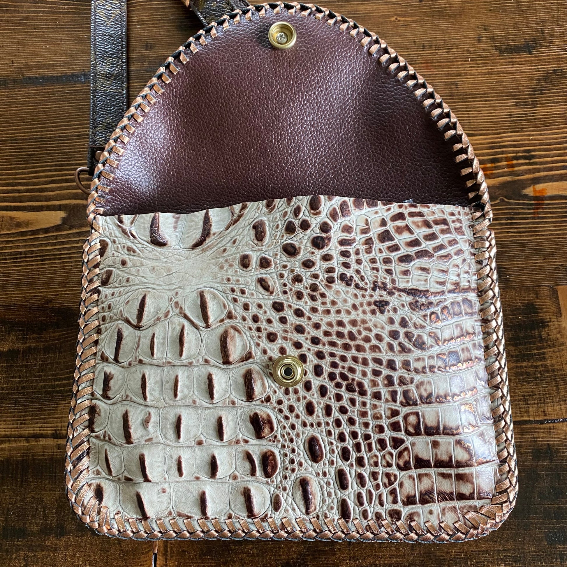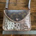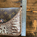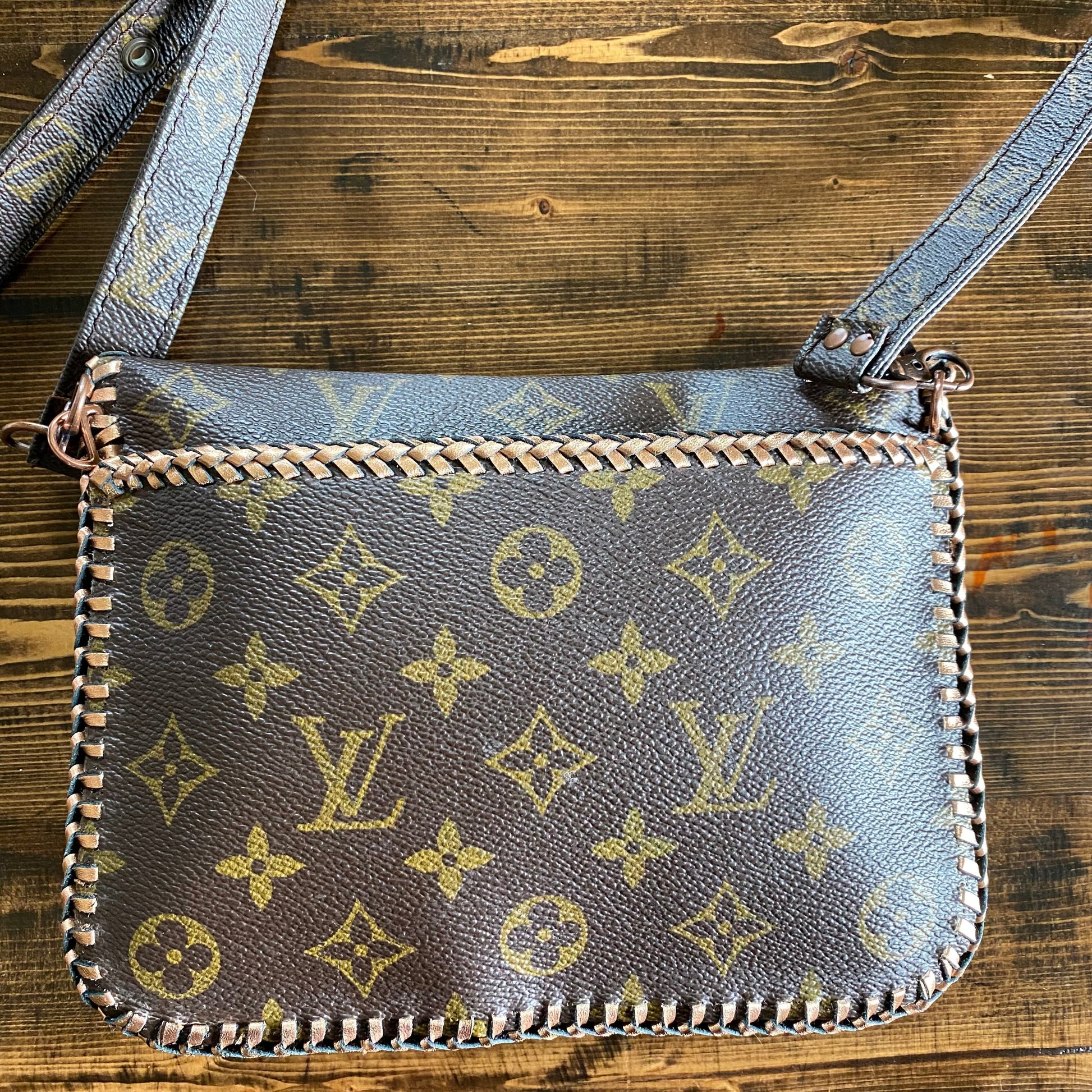 All of the monogram is lined with a brown vegan leather in order to give the bag some substance. The front leather is a rose gold croc-embossed piece that looks amazing with the Monogram print. The outside edges are rose gold leather lace which have been stitched by hand. There are copper colored brass D-rings stitched into the back so that you can go from crossbody to wristlet to clutch! There will be a monogram wristlet strap (not shown). The LV crossbody strap is adjustable from 42 to 26". The antiqued copper clasps match the rest of the bag, and a beautifulPrestige Totes copper colored flower snap keeps your items secure. And remember, both straps can be removed to turn this into a beautiful clutch.