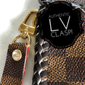 The back has two loops that are attached with gold rivets that will hold onto your belt, giving you an instant chic fanny back. A belt up to 1 1/2" can be used. There is also one gold D-ring stitched into the side on the back that will hold the LV wristlet. Look closely at the wristlet clasp, it's from another bag and has the LV stamped into it!! You can remove it to turn this into a beautiful clutch! A gold button magnetic snap secures your belongings!