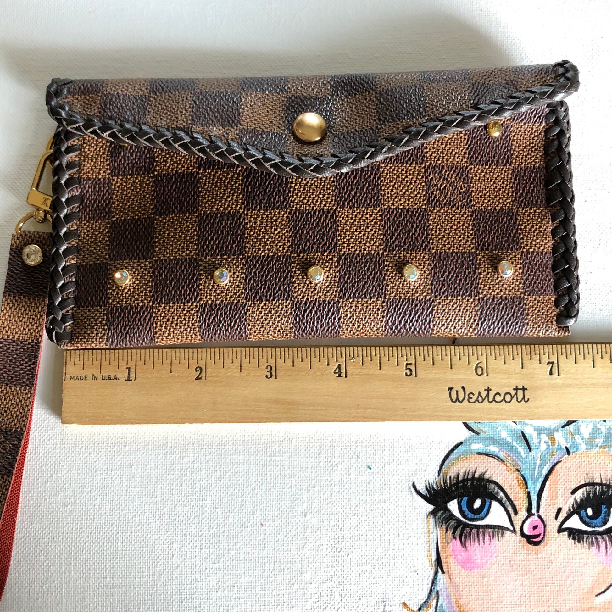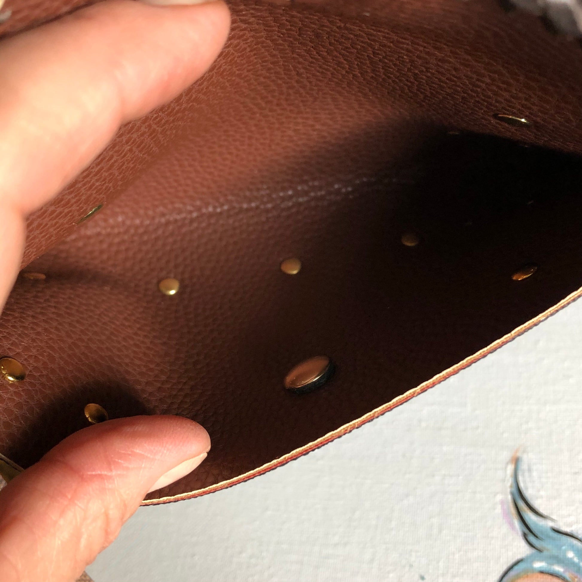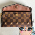 As always, an Louis Vuitton bag was used to create this beautiful little bag. The LV is lined with brown leather, which backs it and gives it a nice feel. The outside edges have been stitched by hand with brown leather lace. The front has a row of gold-rimmed crystal rivets, giving it some bling! There are also four gold rivets at the top that were placed to hide some flaws in the canvas. They do not affect the functionality of this cute bag in any way, and cannot be seen when the flap is closed.