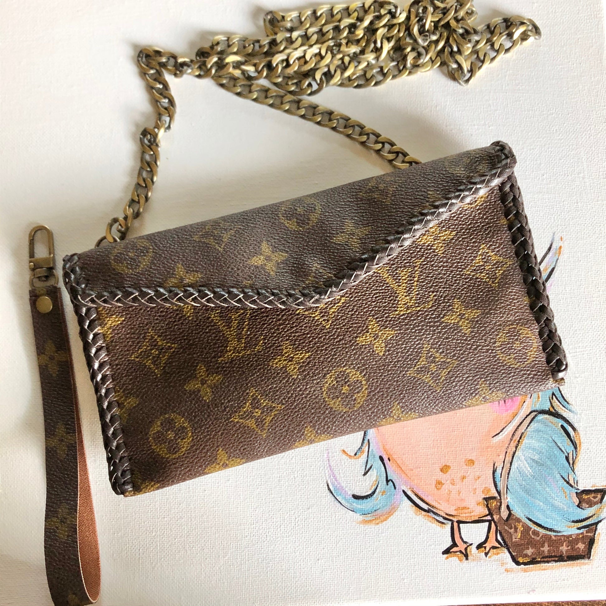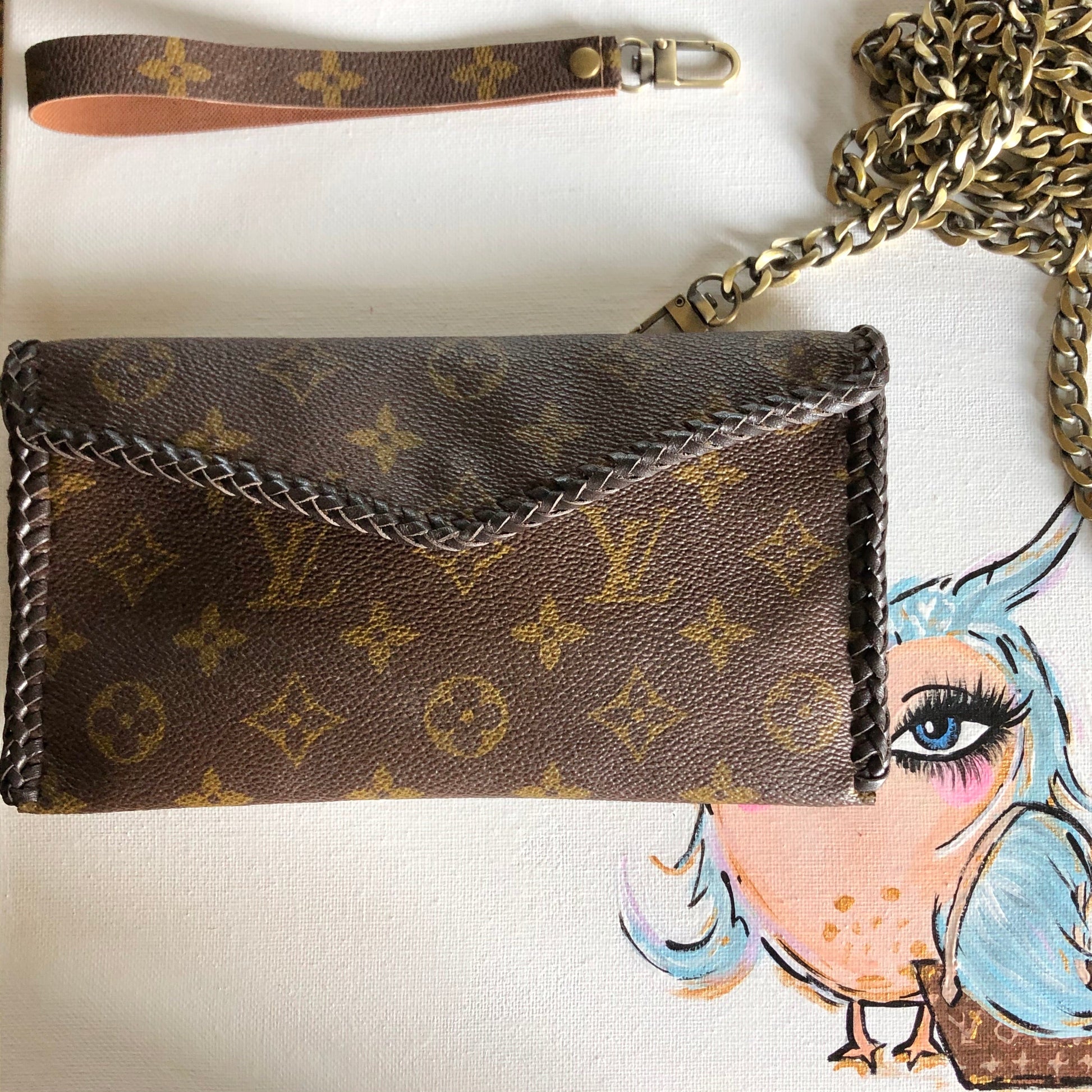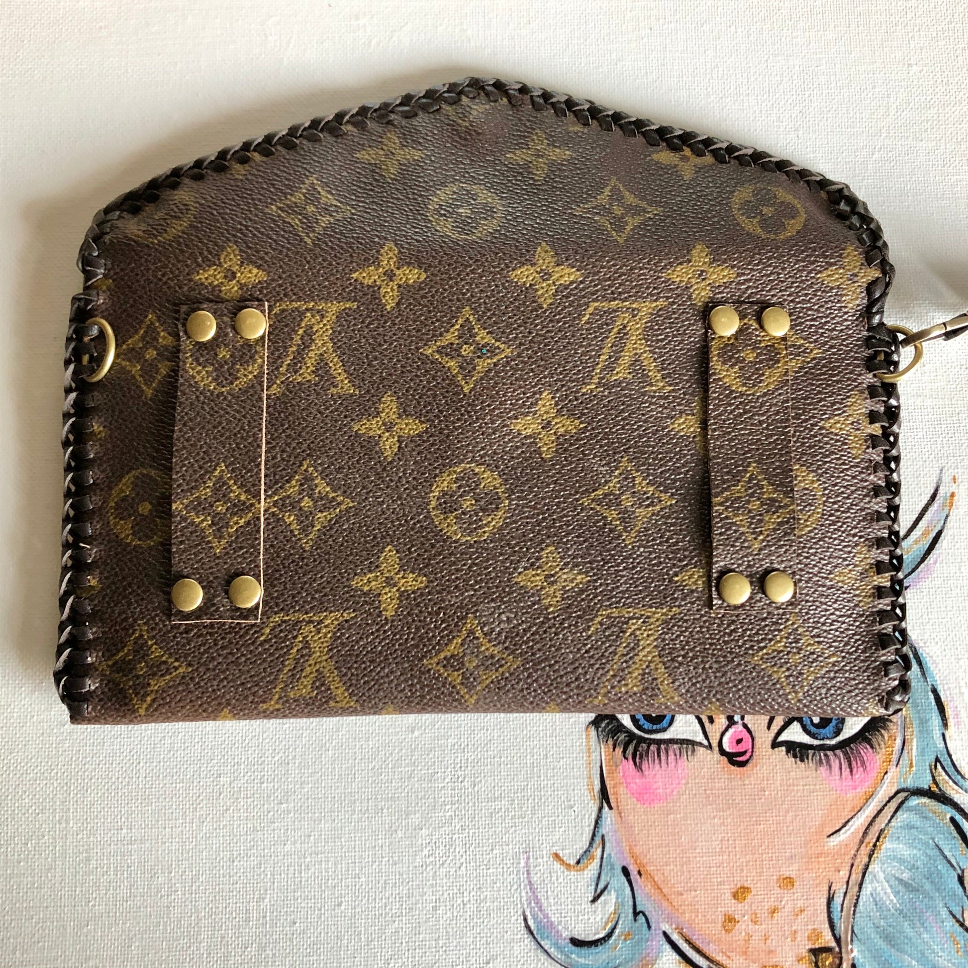 As always, an Louis Vuitton bag was used to create this beautiful little bag. The LV is lined with brown leather, which backs it and gives it a nice feel. The outside edges have been stitched by hand with brown leather lace. The back has two loops that are attached with bronze rivets that will hold onto your belt, giving you an instant chic fanny back. A belt up to 2" can be used. There are also two antique bronze D-rings stitched into the sides on the back that will hold the antique bronze crossbody chain (47"), or the LV wristlet. You can take both off and turn this into a beautiful clutch! A hidden magnetic snap secures your belongings!