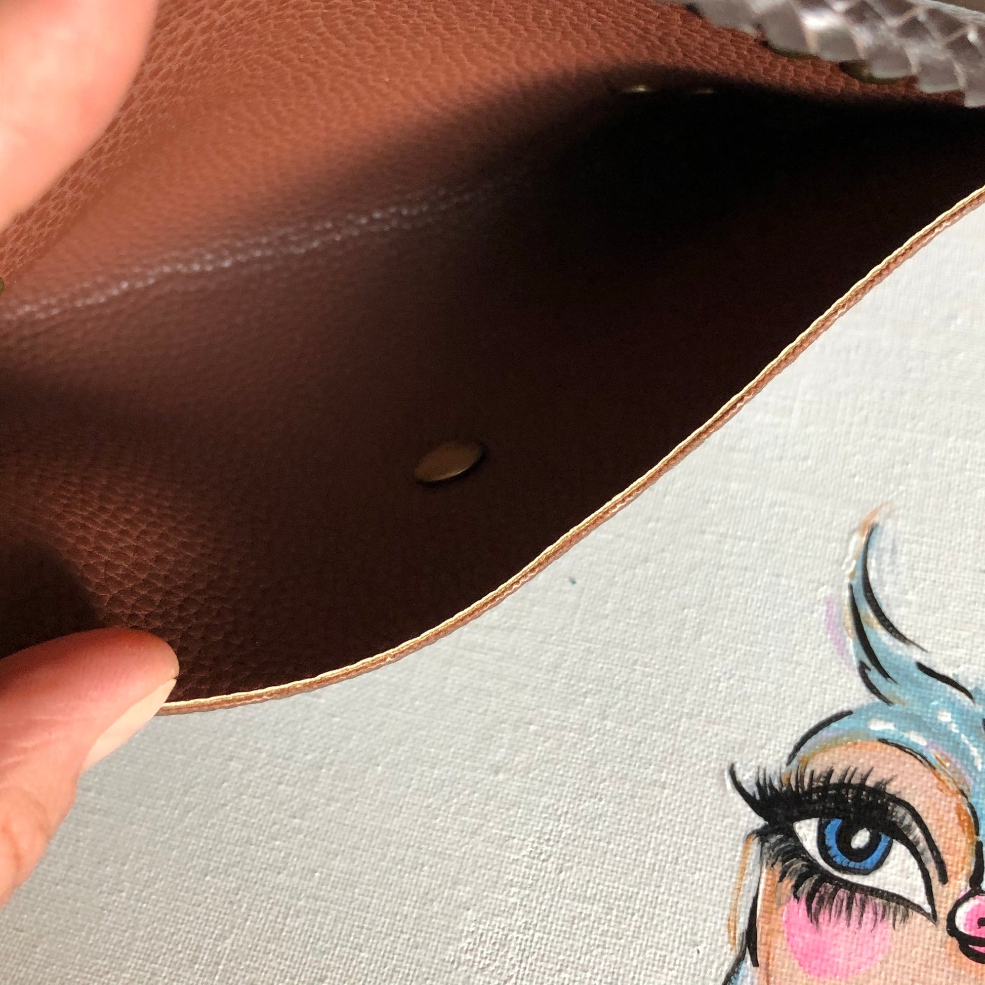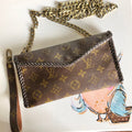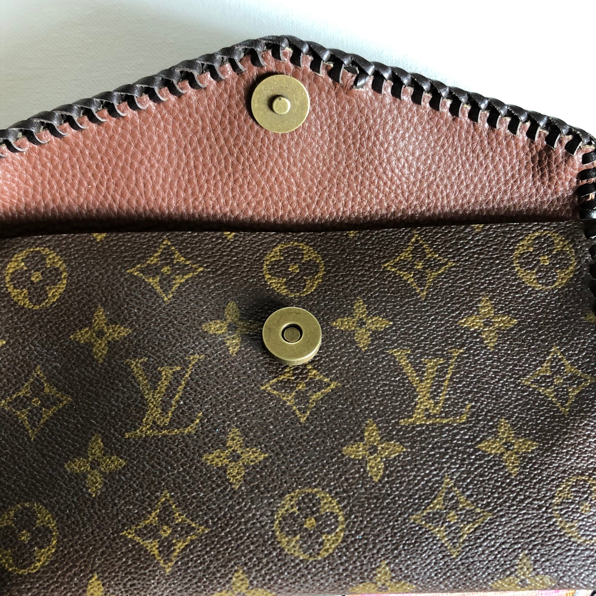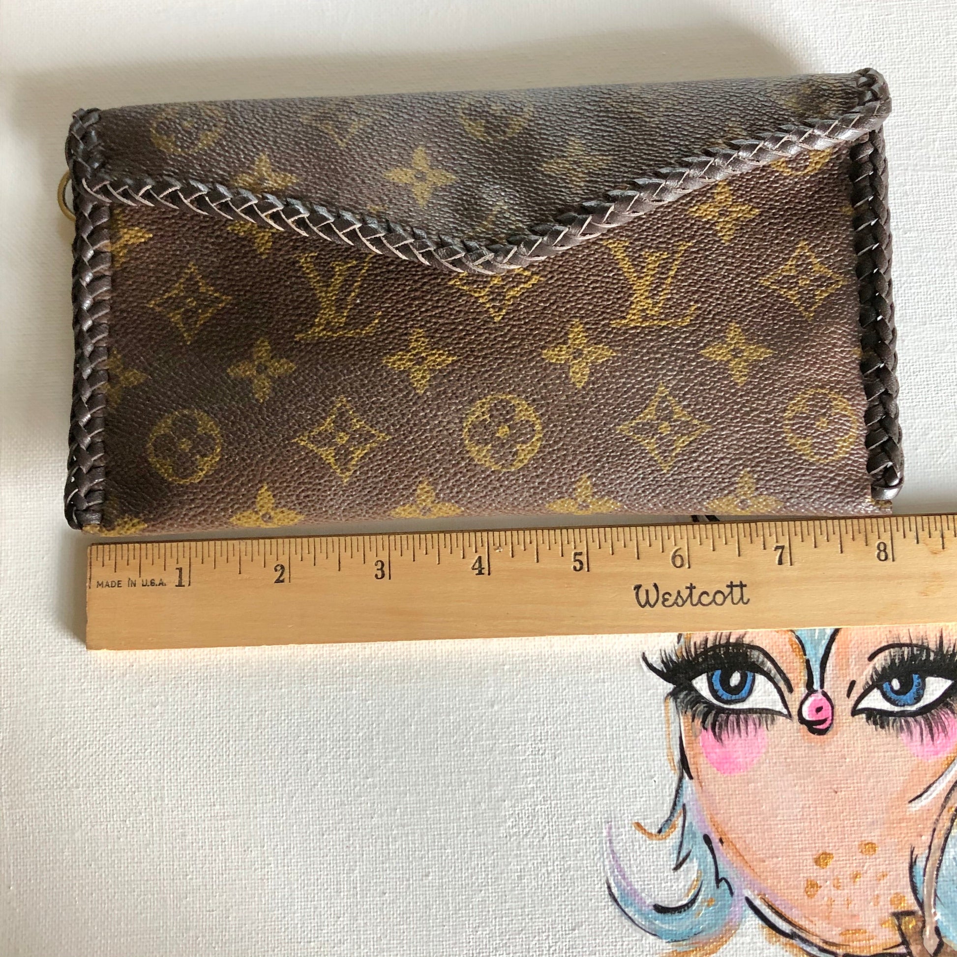 As always, an Louis Vuitton bag was used to create this beautiful little bag. The LV is lined with brown leather, which backs it and gives it a nice feel. The outside edges have been stitched by hand with brown leather lace. The back has two loops that are attached with bronze rivets that will hold onto your belt, giving you an instant chic fanny back. A belt up to 2" can be used. There are also two antique bronze D-rings stitched into the sides on the back that will hold the antique bronze crossbody chain (47"), or the LV wristlet. You can take both off and turn this into a beautiful clutch! A hidden magnetic snap secures your belongings!