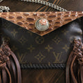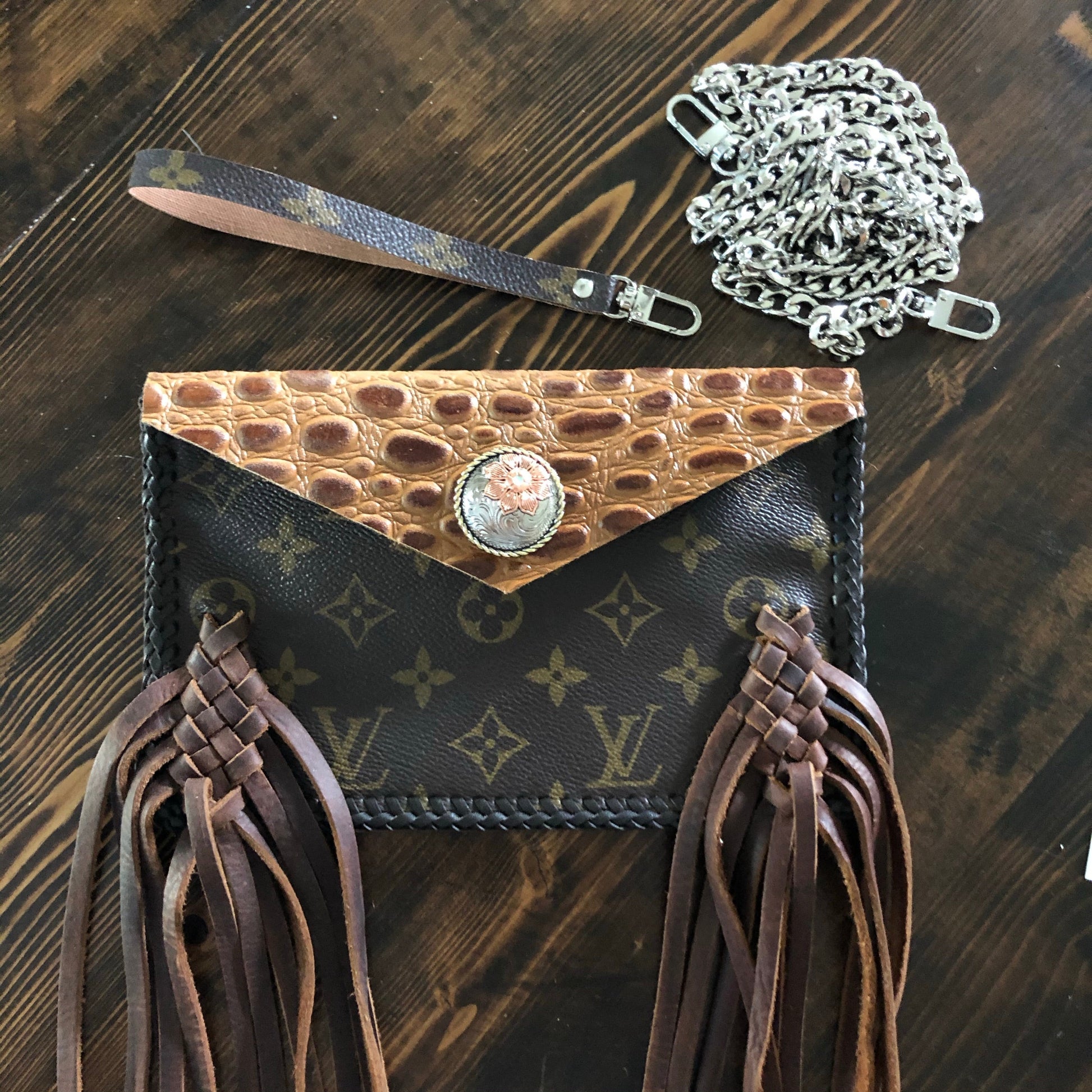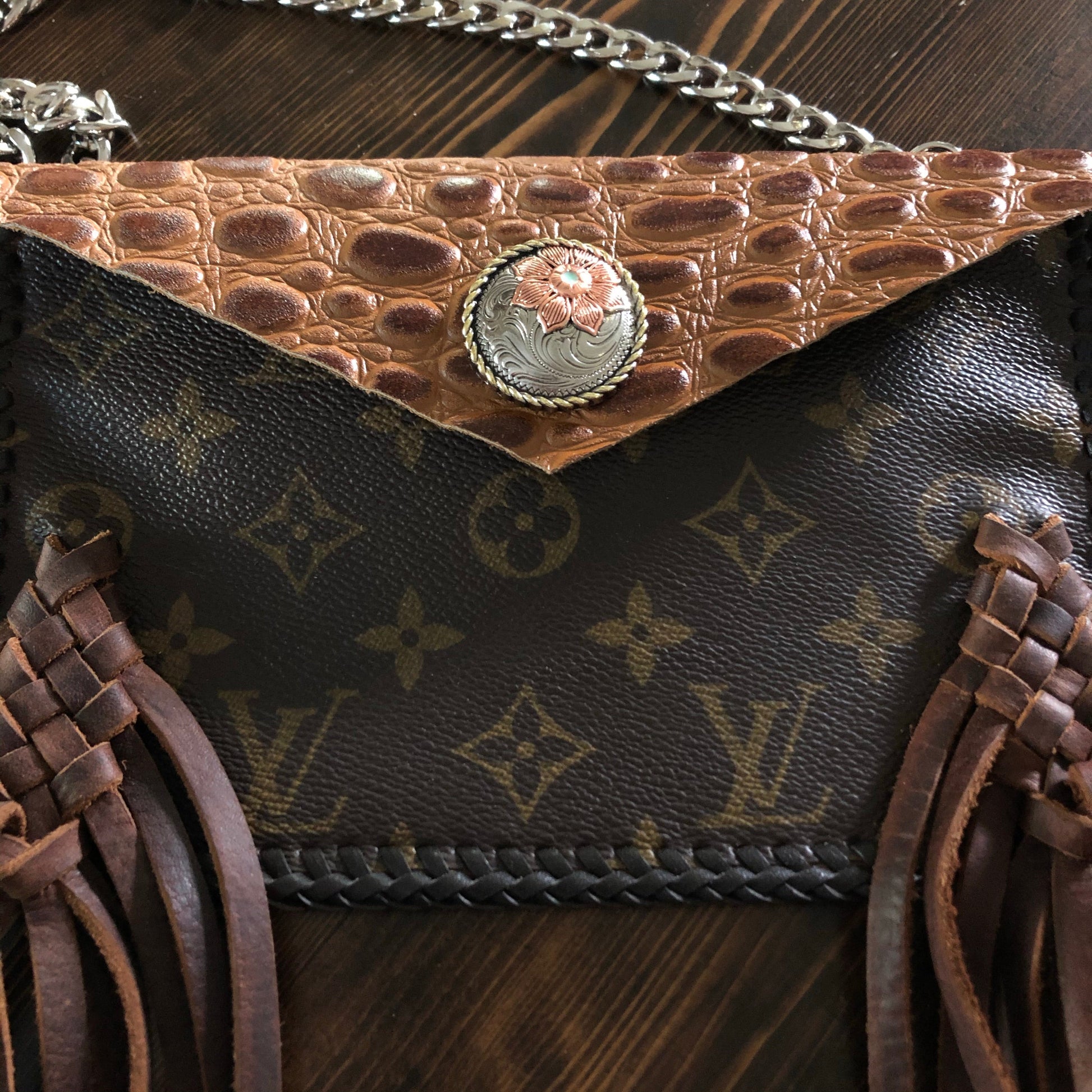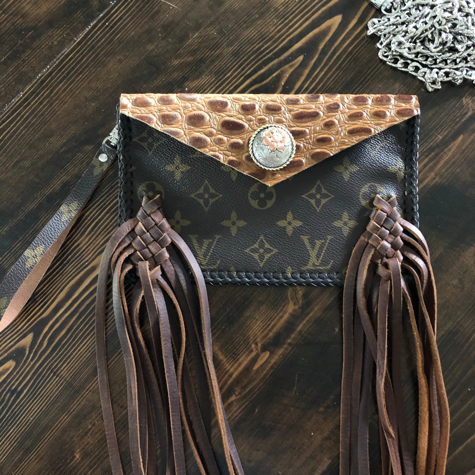 As always, an Louis Vuitton bag was used to create this beautiful little bag. I enhanced the front by adding braided fringe in two different colors to give it some dimension. The back/front flap is a gorgeous Cognac colored gator-embossed leather! It is STUNNING!!! The outside edge has been stitched by hand with brown leather lace. There are two silver D-rings stitched into the sides that will hold the silver crossbody chain (47"), or the click-n-go wristlet. The wristlet is the star LV print and has a small silver LV-like clasp at the end. Perfect for your keys OR your wrist!! Or, take both off and turn this into a beautiful clutch! A silver/copperPrestige Totes looking concho snap completes this look.
