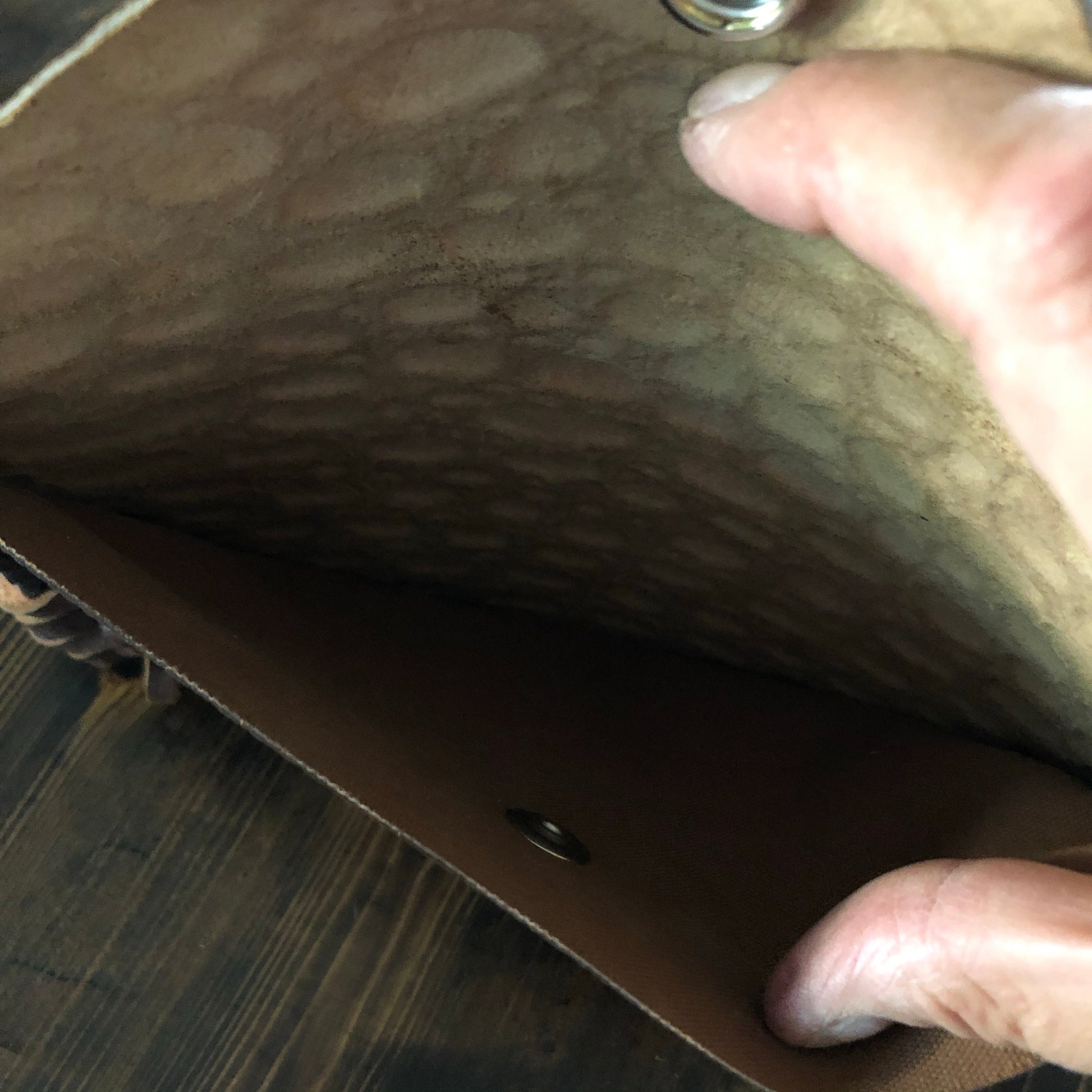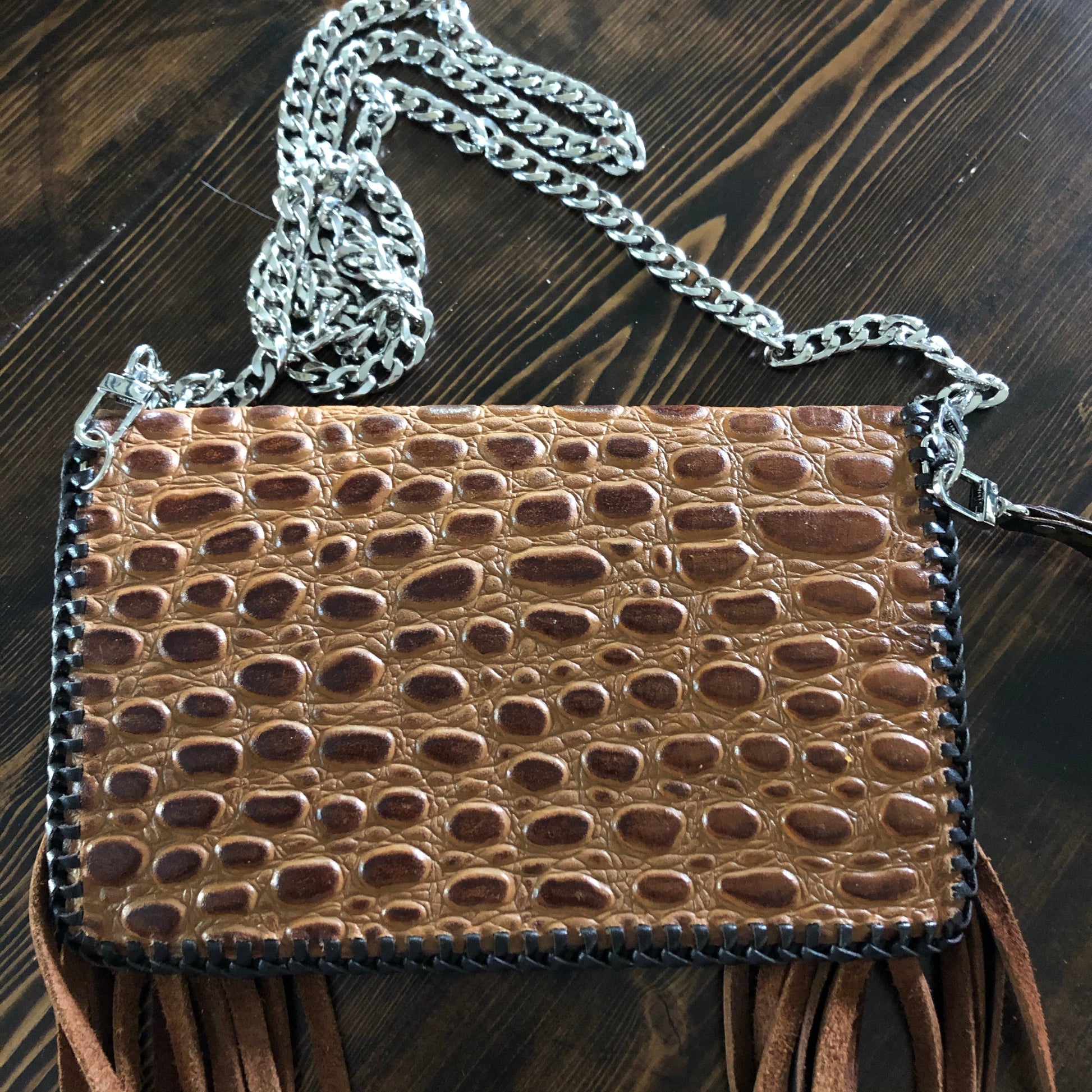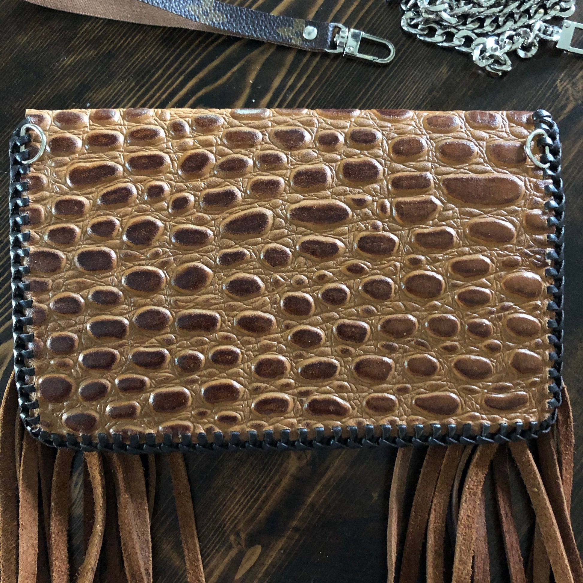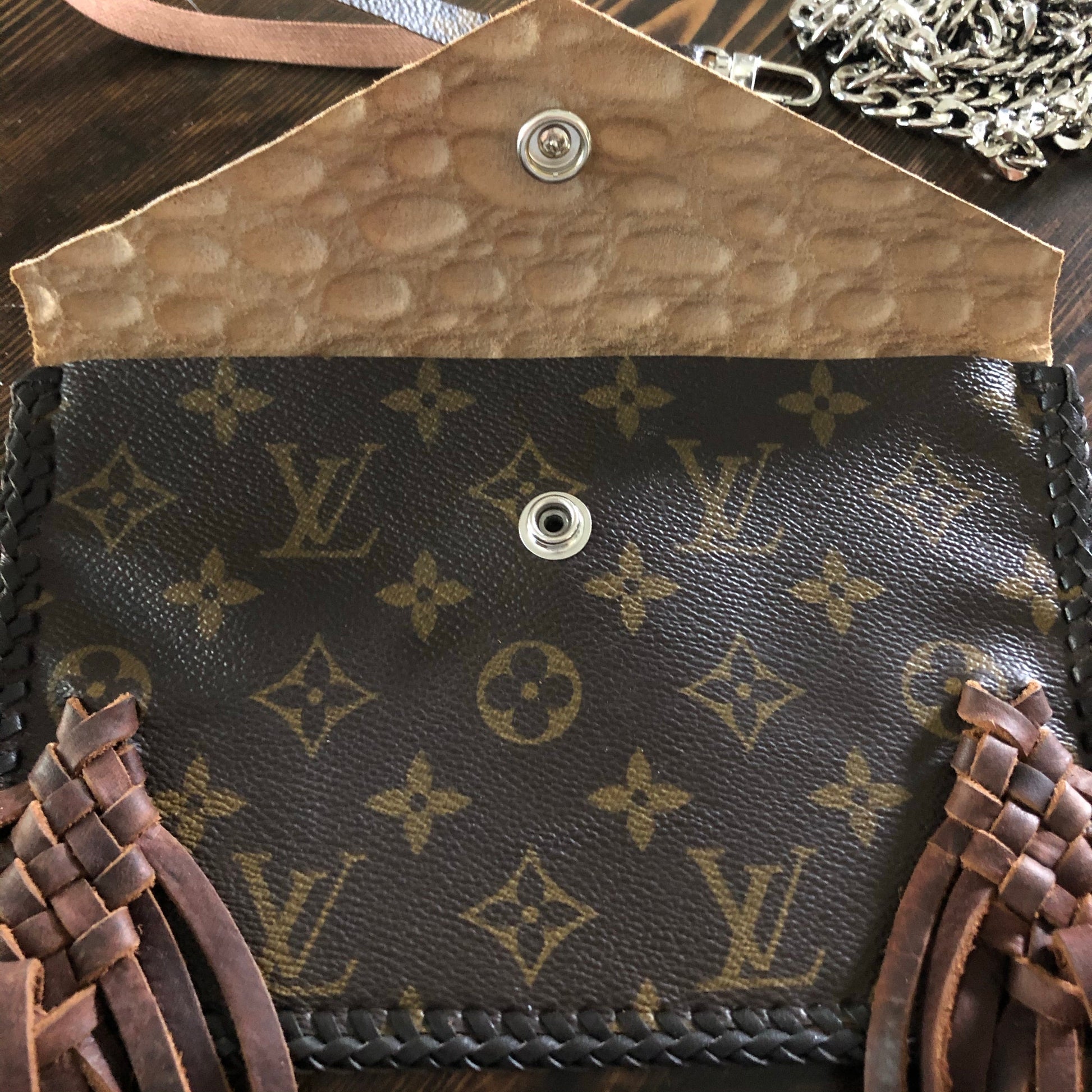 As always, an Louis Vuitton bag was used to create this beautiful little bag. I enhanced the front by adding braided fringe in two different colors to give it some dimension. The back/front flap is a gorgeous Cognac colored gator-embossed leather! It is STUNNING!!! The outside edge has been stitched by hand with brown leather lace. There are two silver D-rings stitched into the sides that will hold the silver crossbody chain (47"), or the click-n-go wristlet. The wristlet is the star LV print and has a small silver LV-like clasp at the end. Perfect for your keys OR your wrist!! Or, take both off and turn this into a beautiful clutch! A silver/copperPrestige Totes looking concho snap completes this look.
