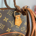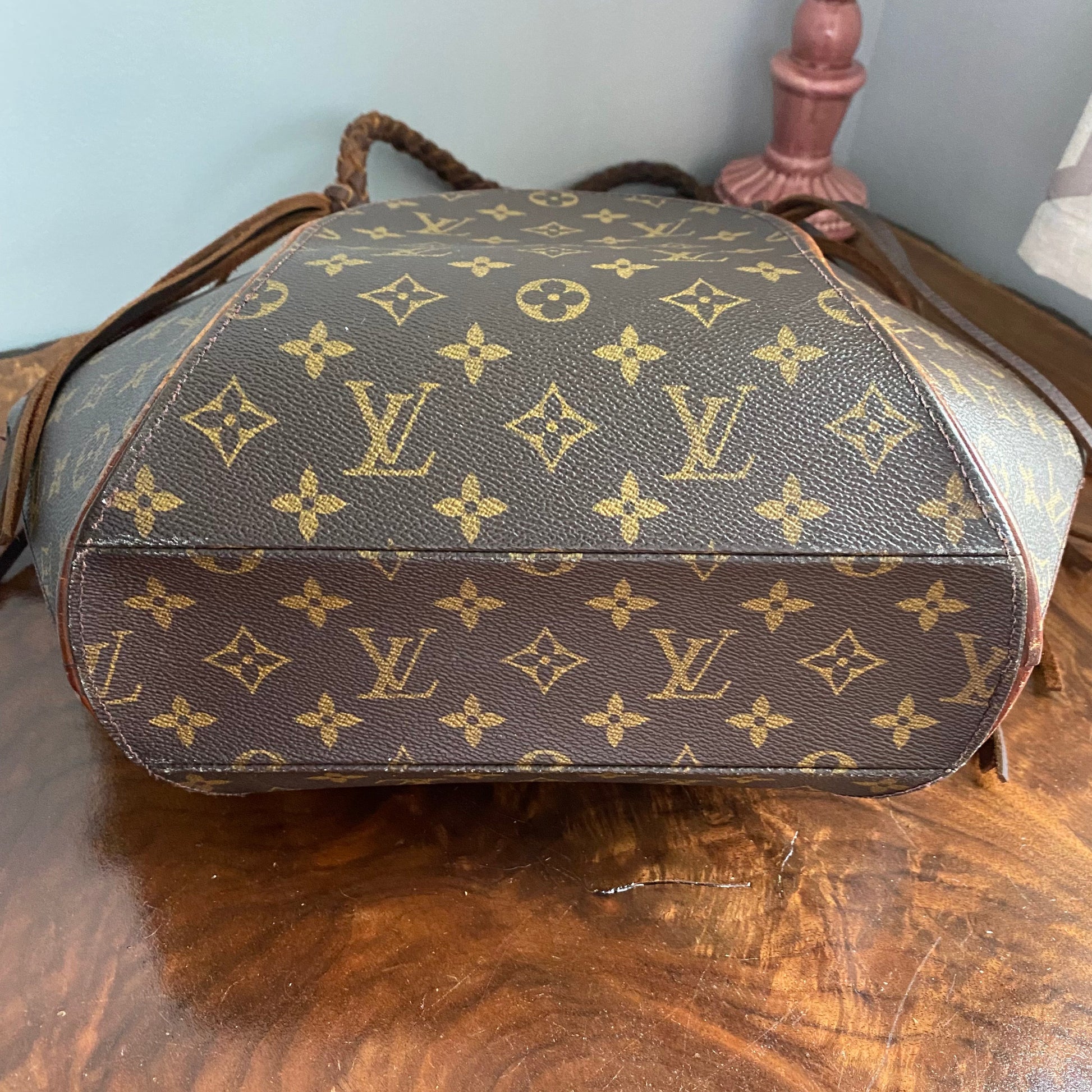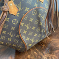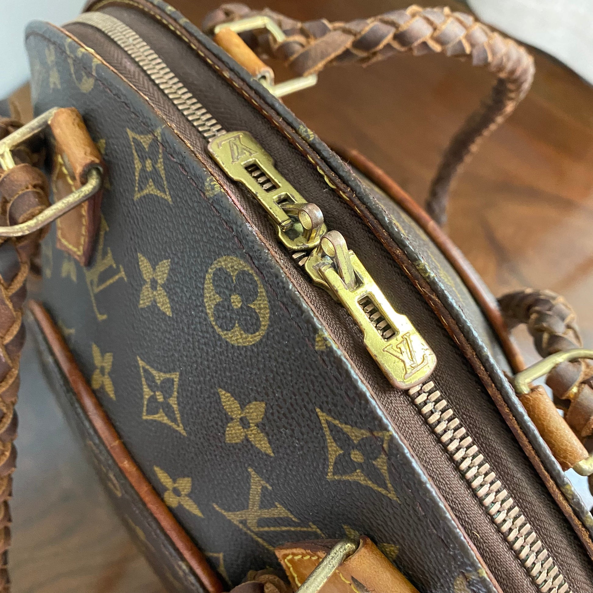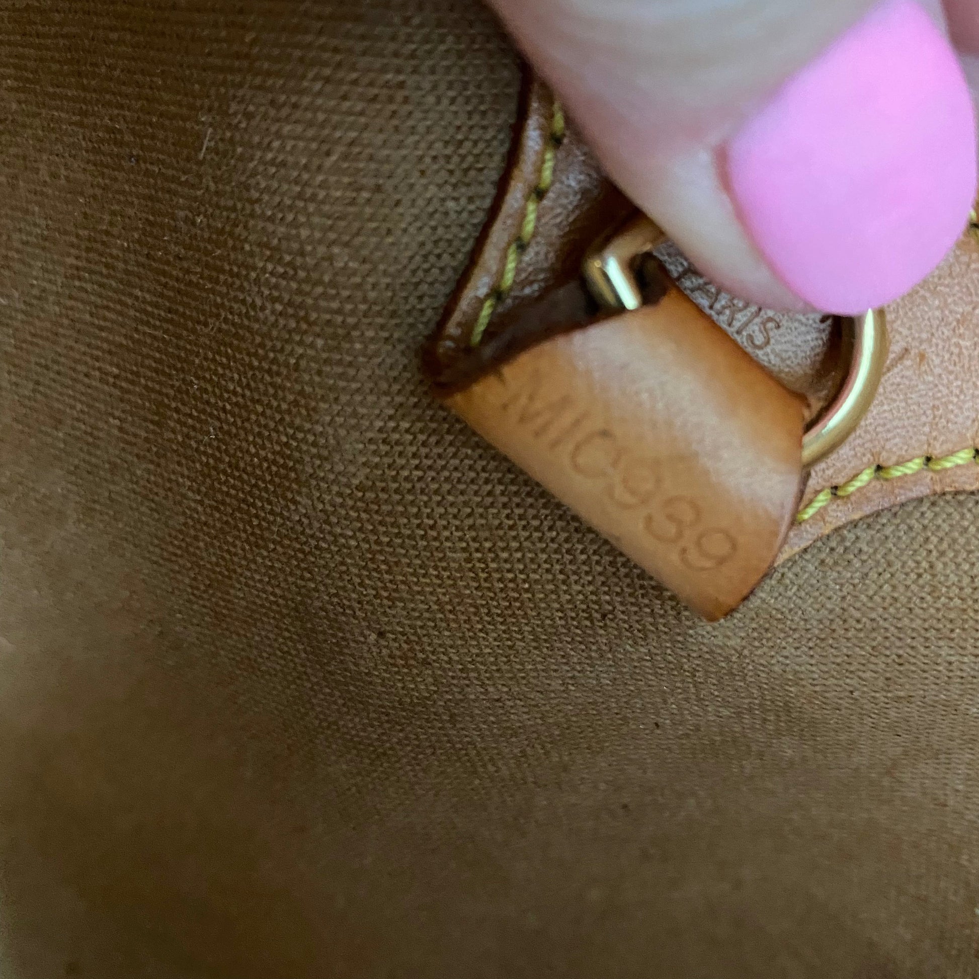 The bag's monogram is in excellent shape. The vachetta was cleaned and conditioned, and has very minor cracking. The interior canvas has also been cleaned, but a few pen marks remain. The zipper has been polished and works great.