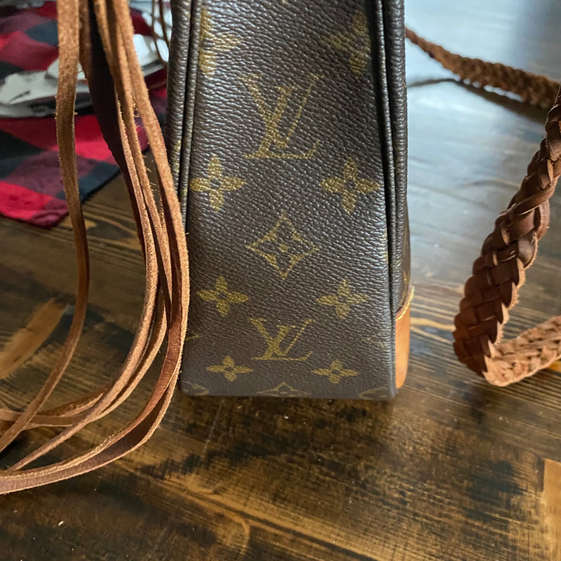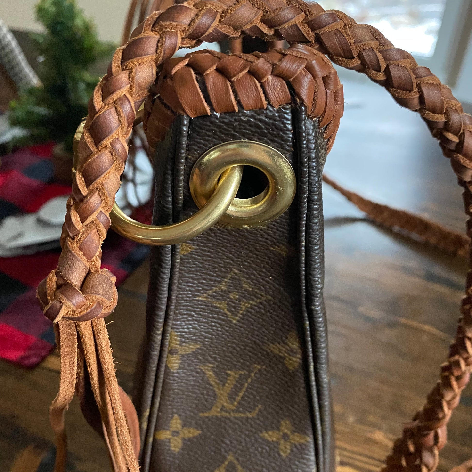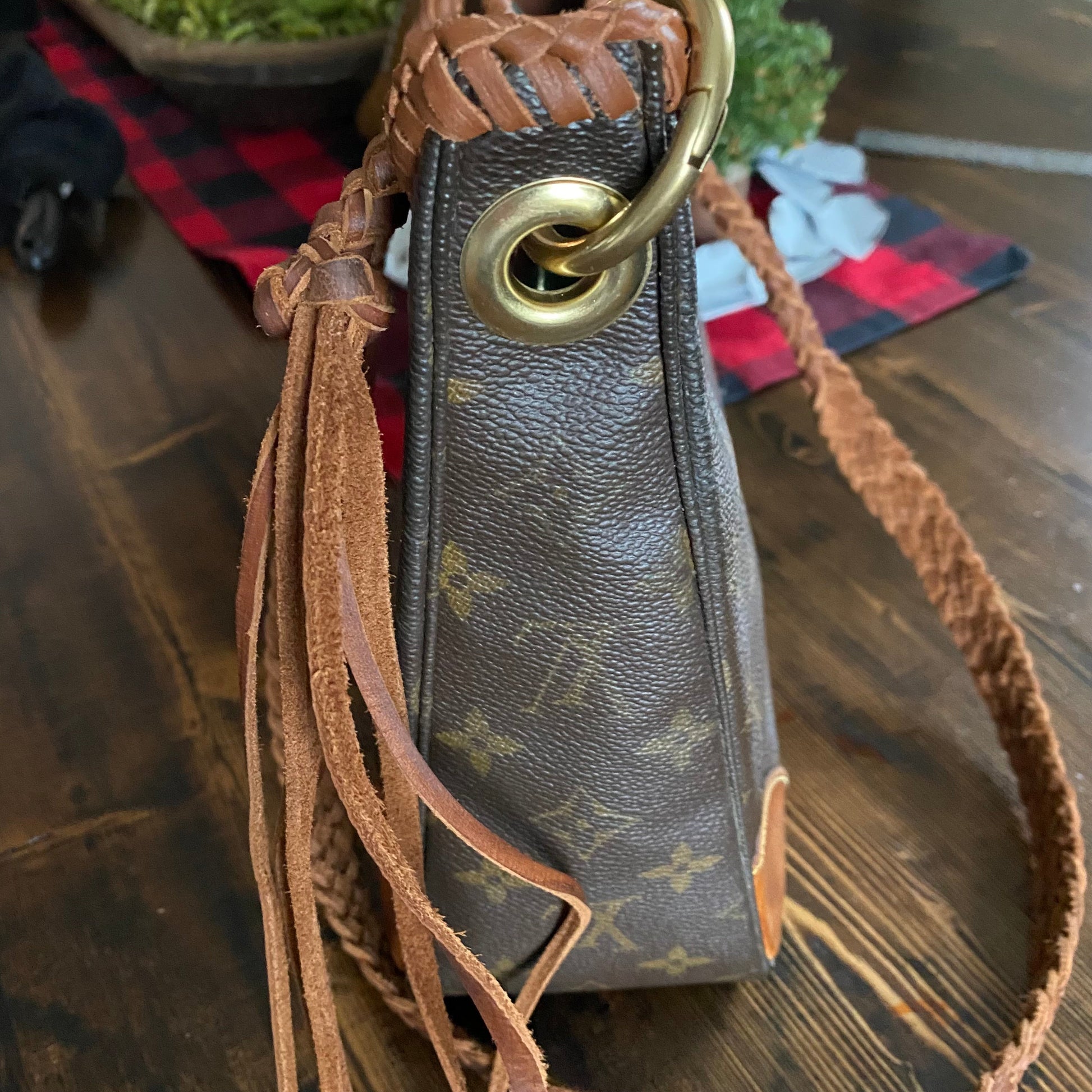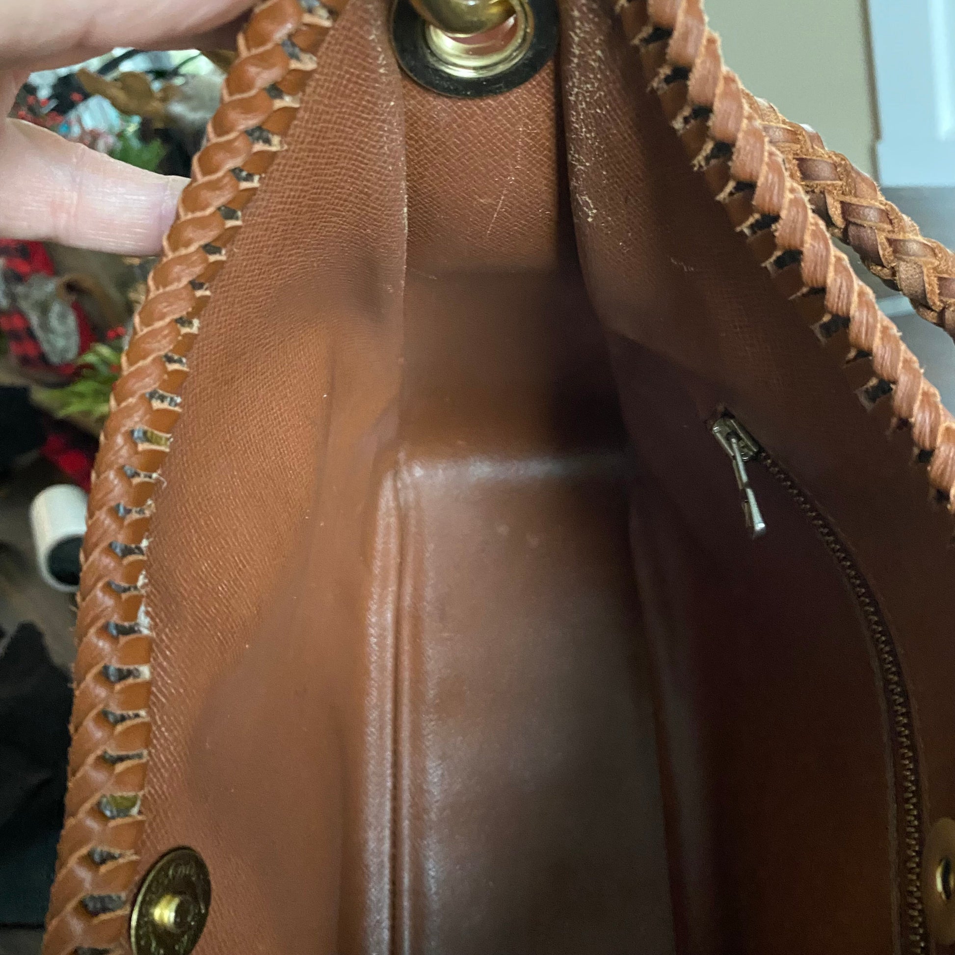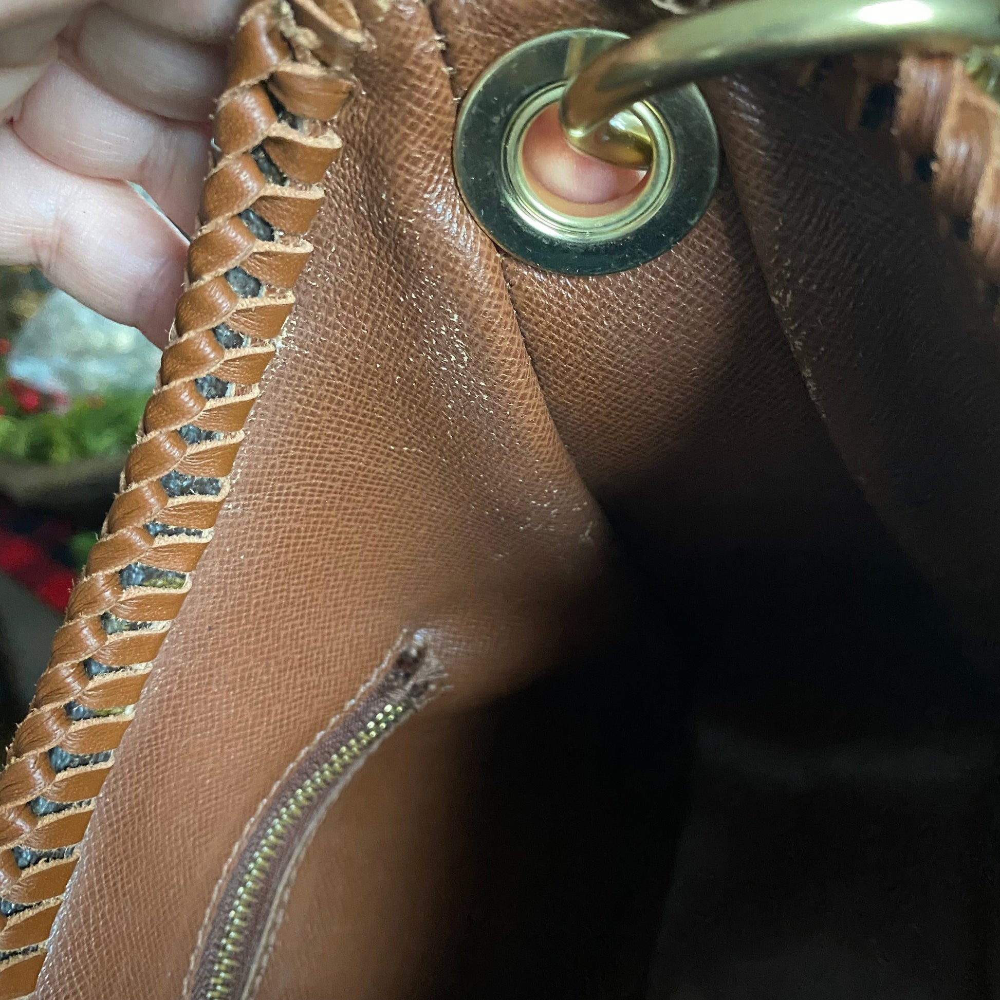 The vachetta on this bag is in pretty good shape, so I just conditioned it. The top of this larger bag (W 11.8" x H 7" x D 3.8") is stitched by hand with tan leather lace. The interior was thoroughly cleaned, and is in really good condition! The interior pocket zipper was broken, but I've mended it and removed the Vuittonite inside, leaving a soft gray flannel fabric. I added brass eyelets to the side to secure the brass O-Ring clasp for the handle. The new handle is a 6-strand tab braided leather strap that is flat where it sits on your shoulder, and round towards the brass clasps. It is 48" long and has a fringe that can be trimmed down if desired. There are hidden magnetic snaps inside keeping your items secure.