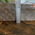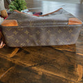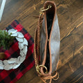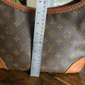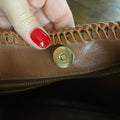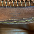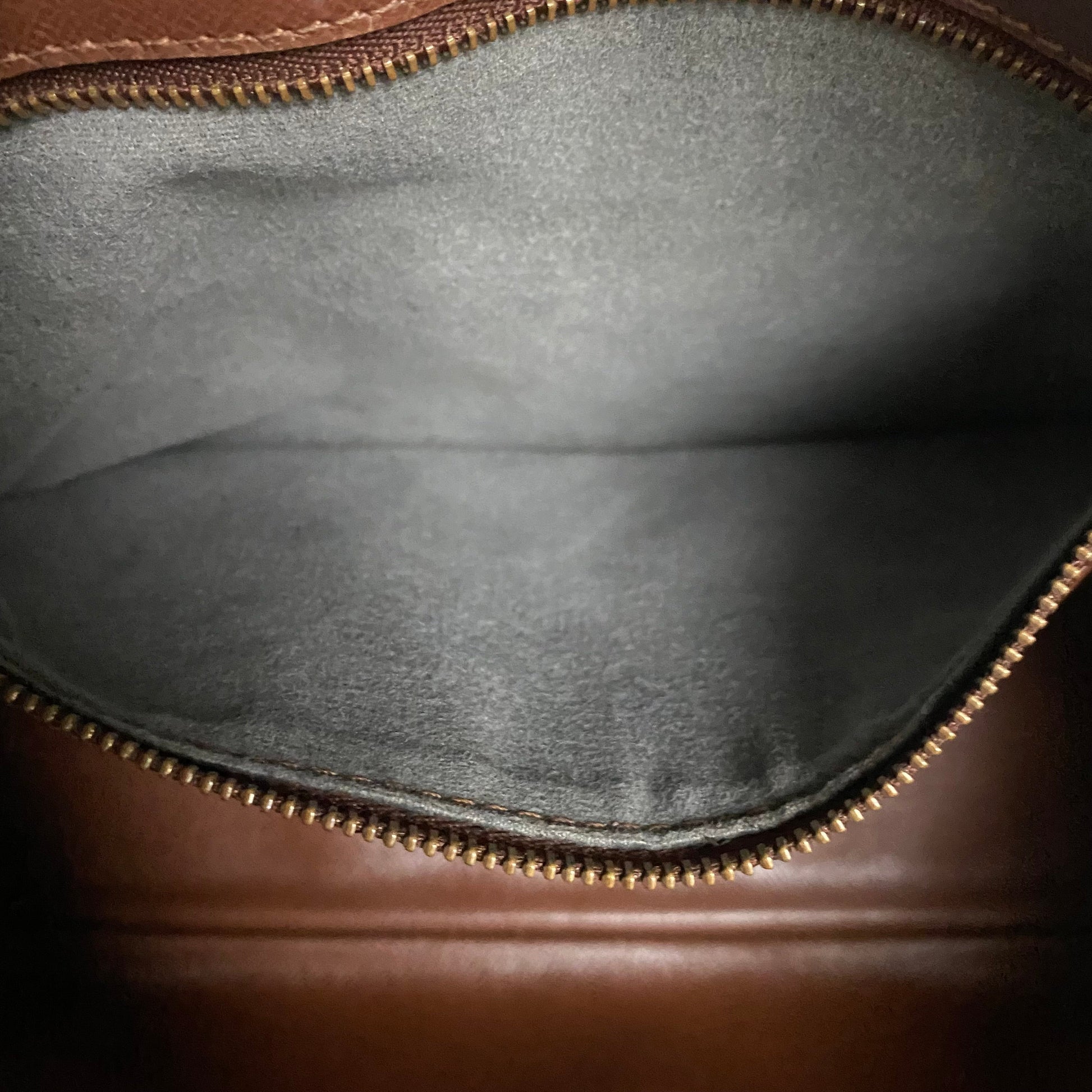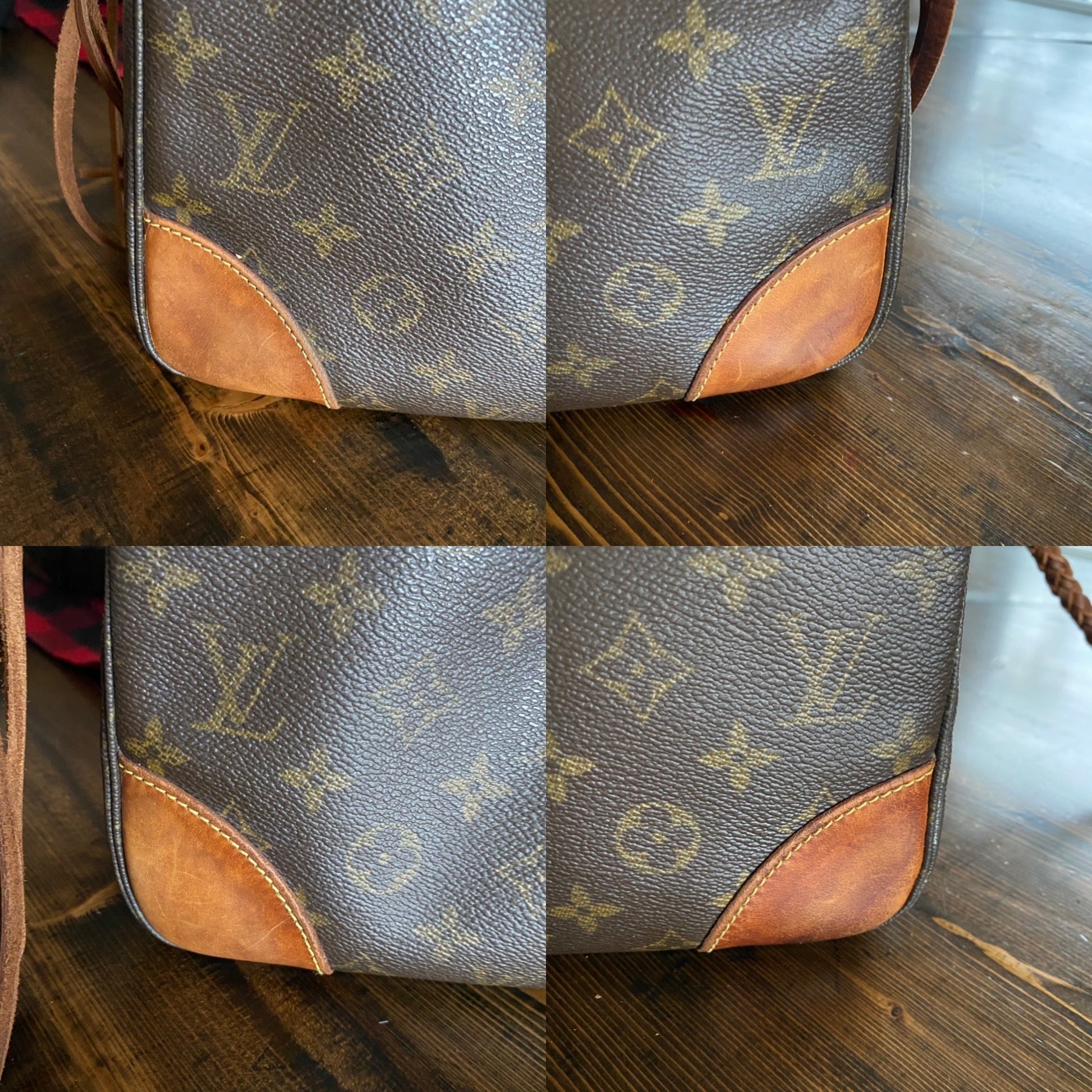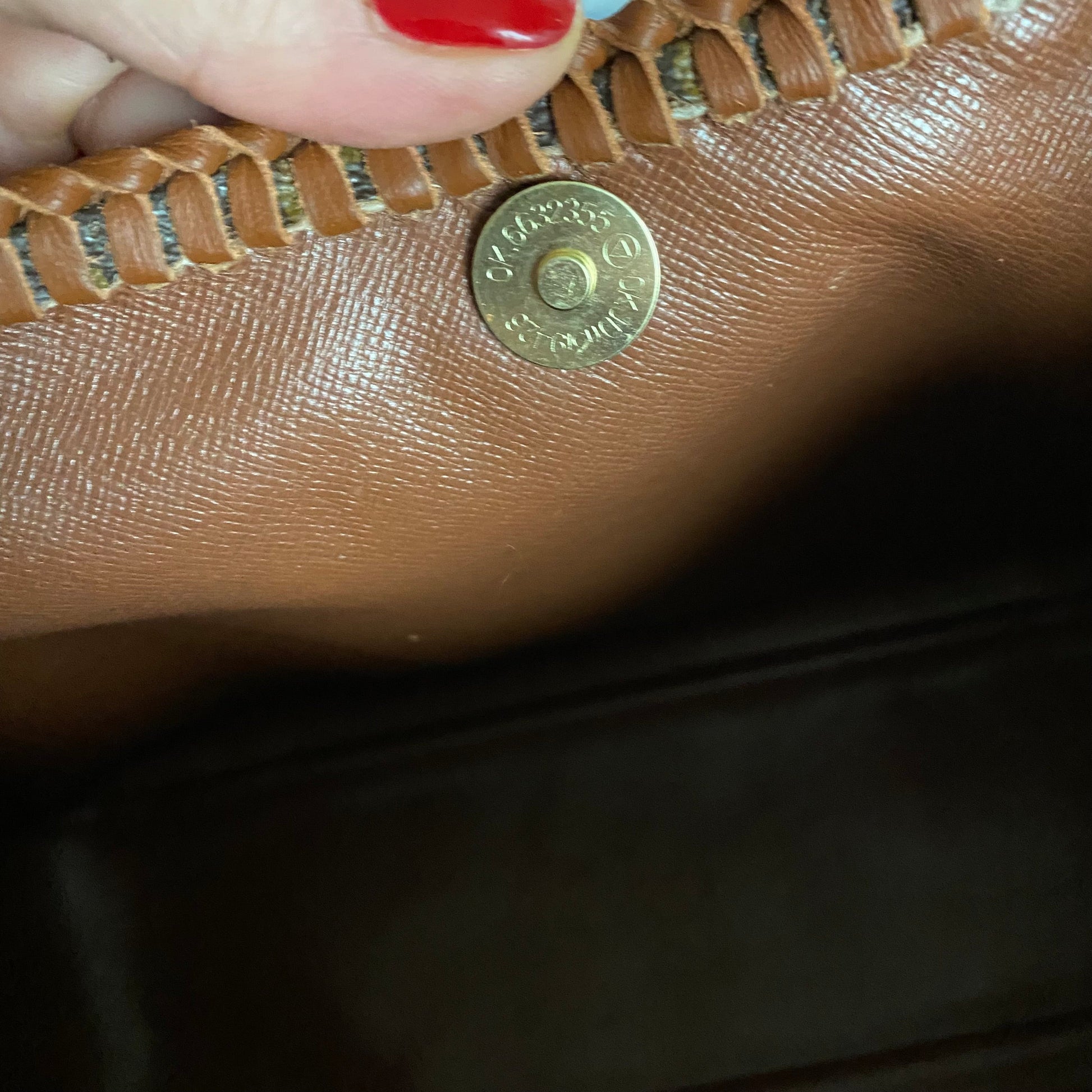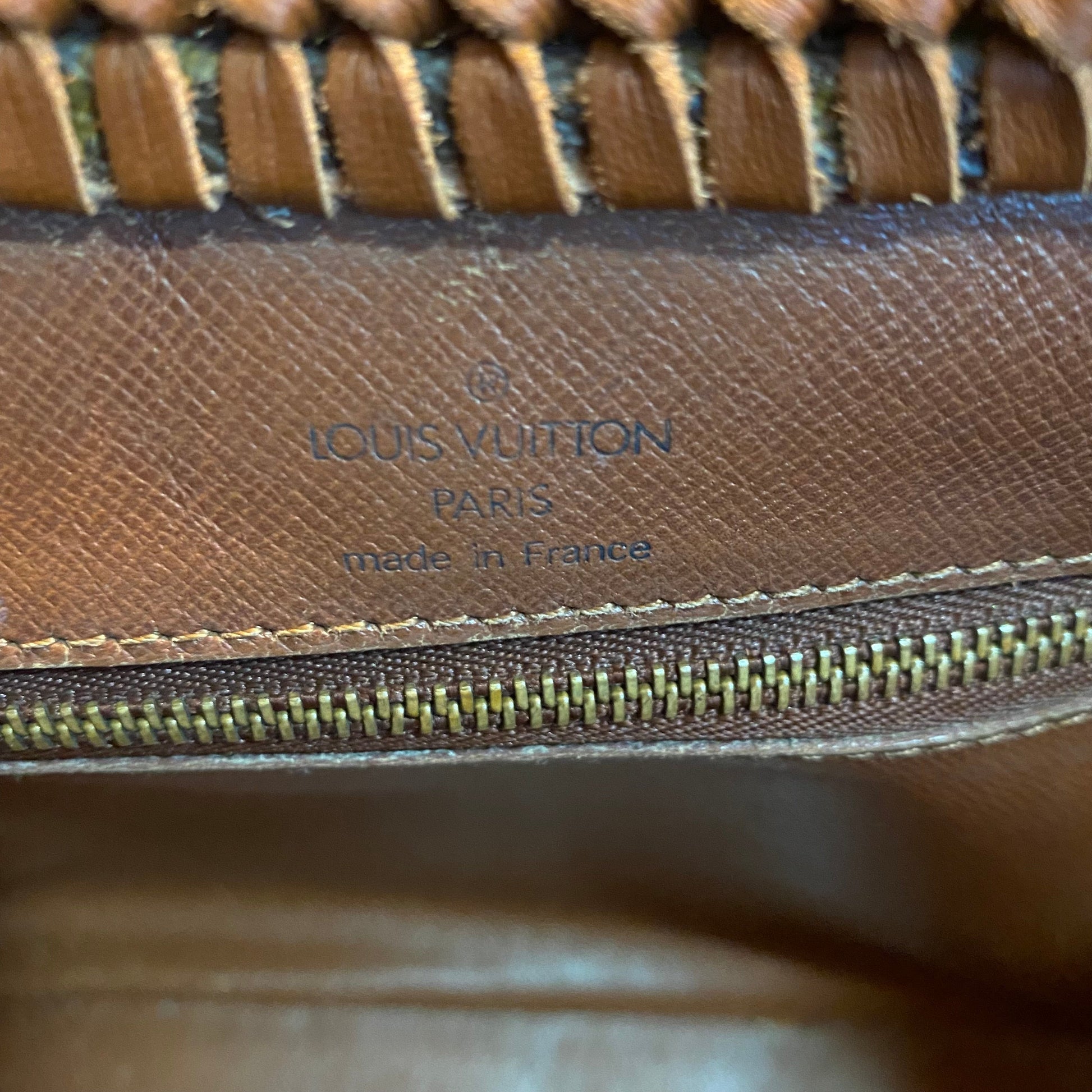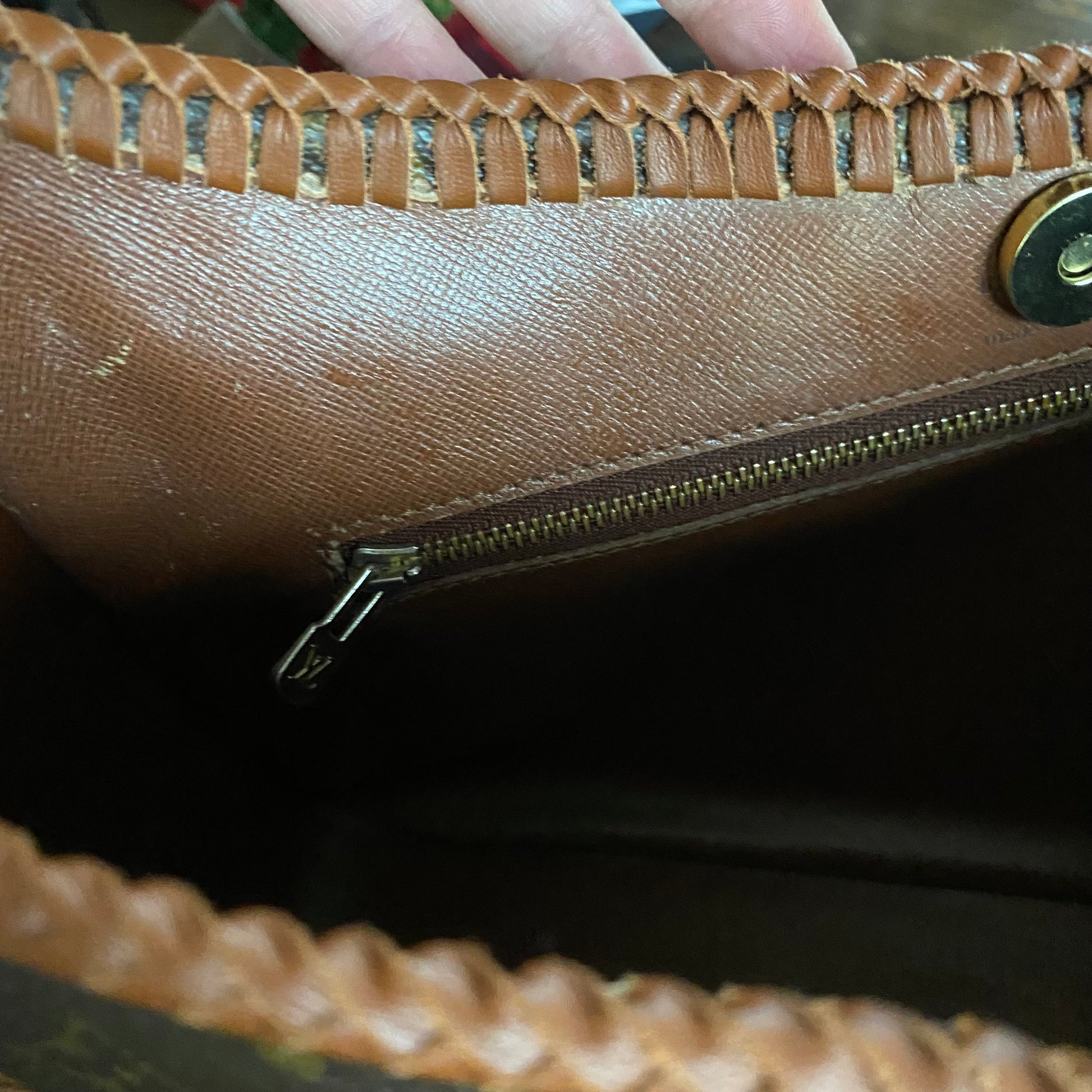 The vachetta on this bag is in pretty good shape, so I just conditioned it. The top of this larger bag (W 11.8" x H 7" x D 3.8") is stitched by hand with tan leather lace. The interior was thoroughly cleaned, and is in really good condition! The interior pocket zipper was broken, but I've mended it and removed the Vuittonite inside, leaving a soft gray flannel fabric. I added brass eyelets to the side to secure the brass O-Ring clasp for the handle. The new handle is a 6-strand tab braided leather strap that is flat where it sits on your shoulder, and round towards the brass clasps. It is 48" long and has a fringe that can be trimmed down if desired. There are hidden magnetic snaps inside keeping your items secure.
