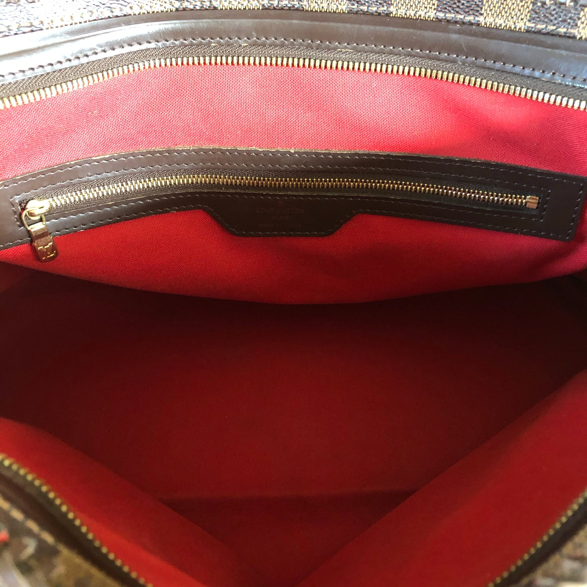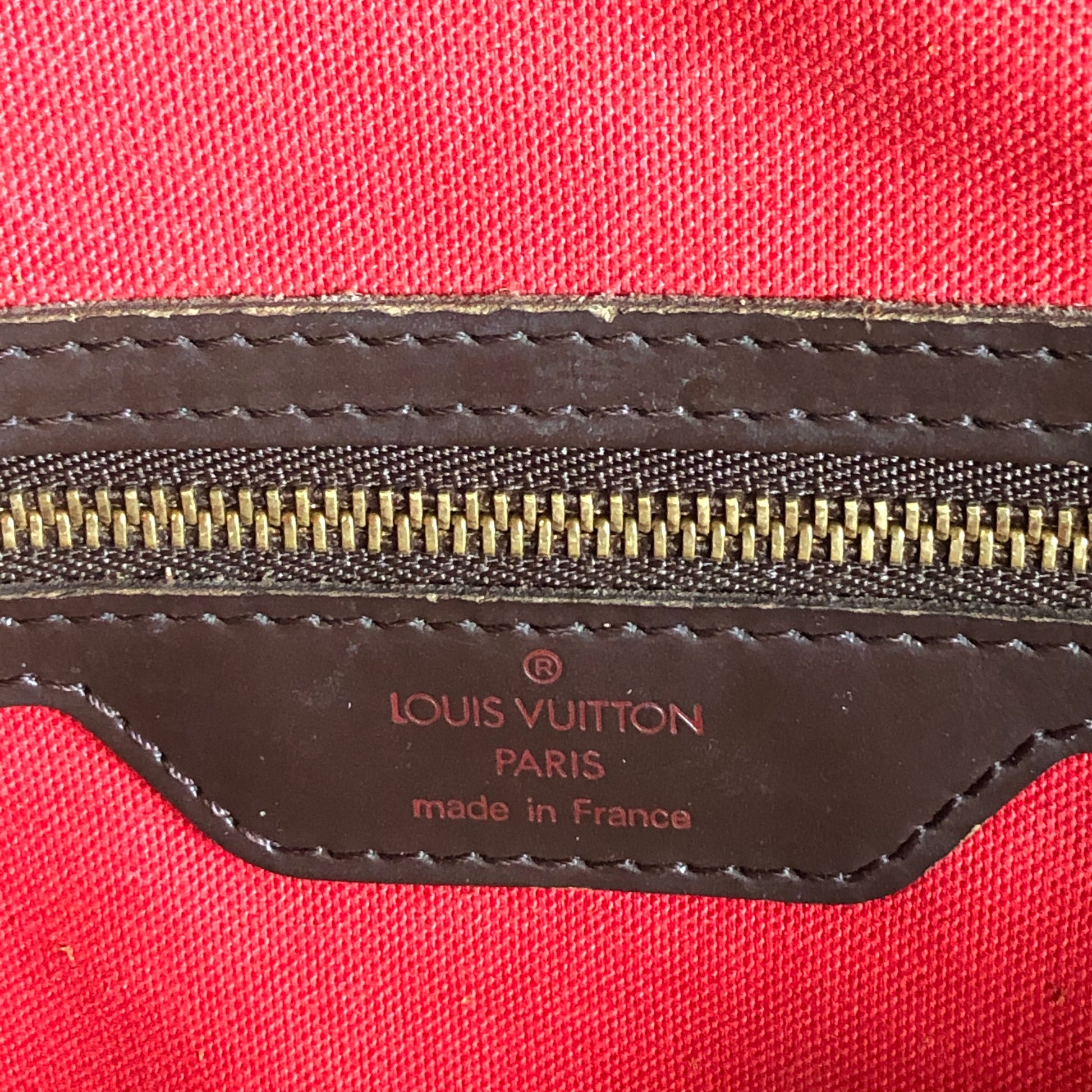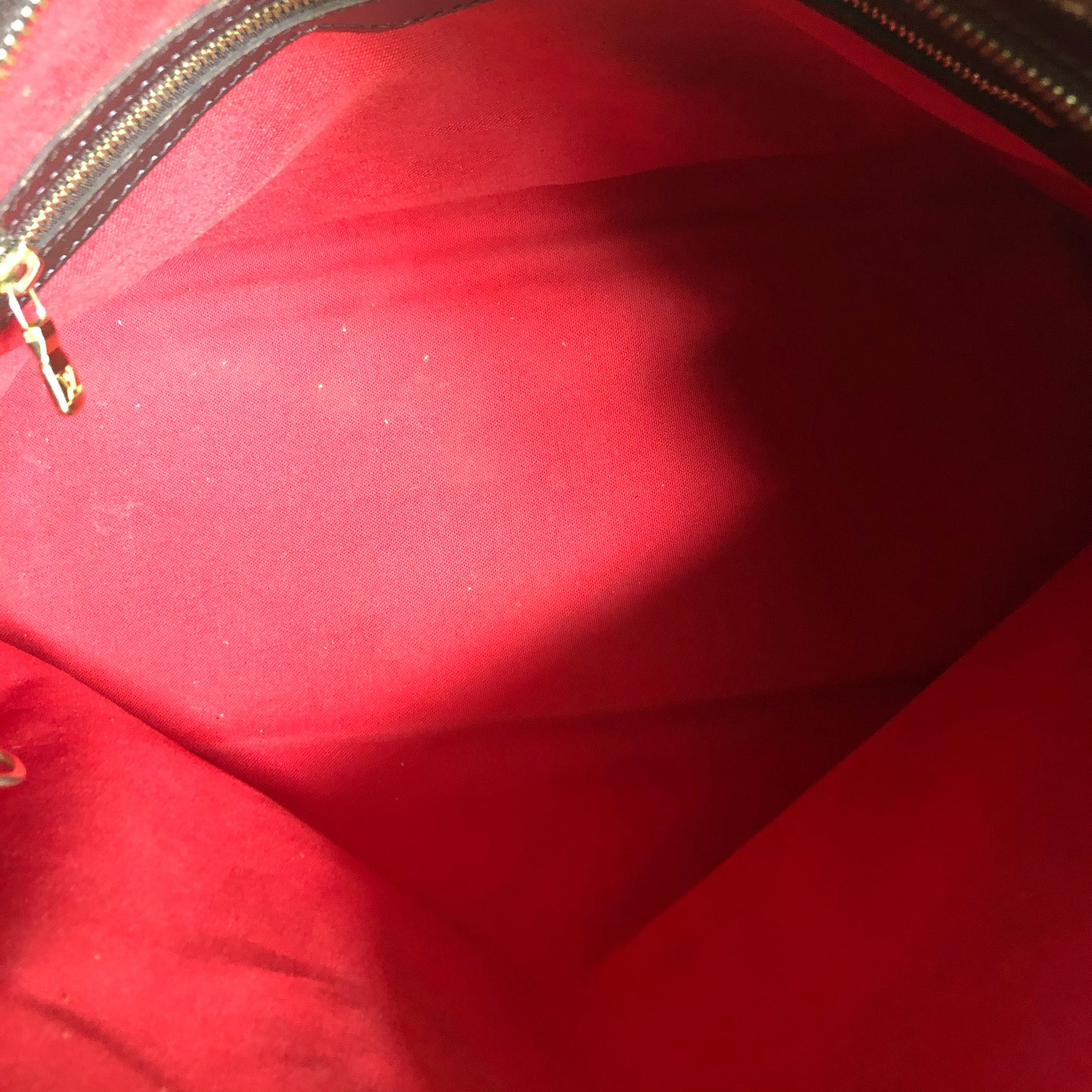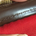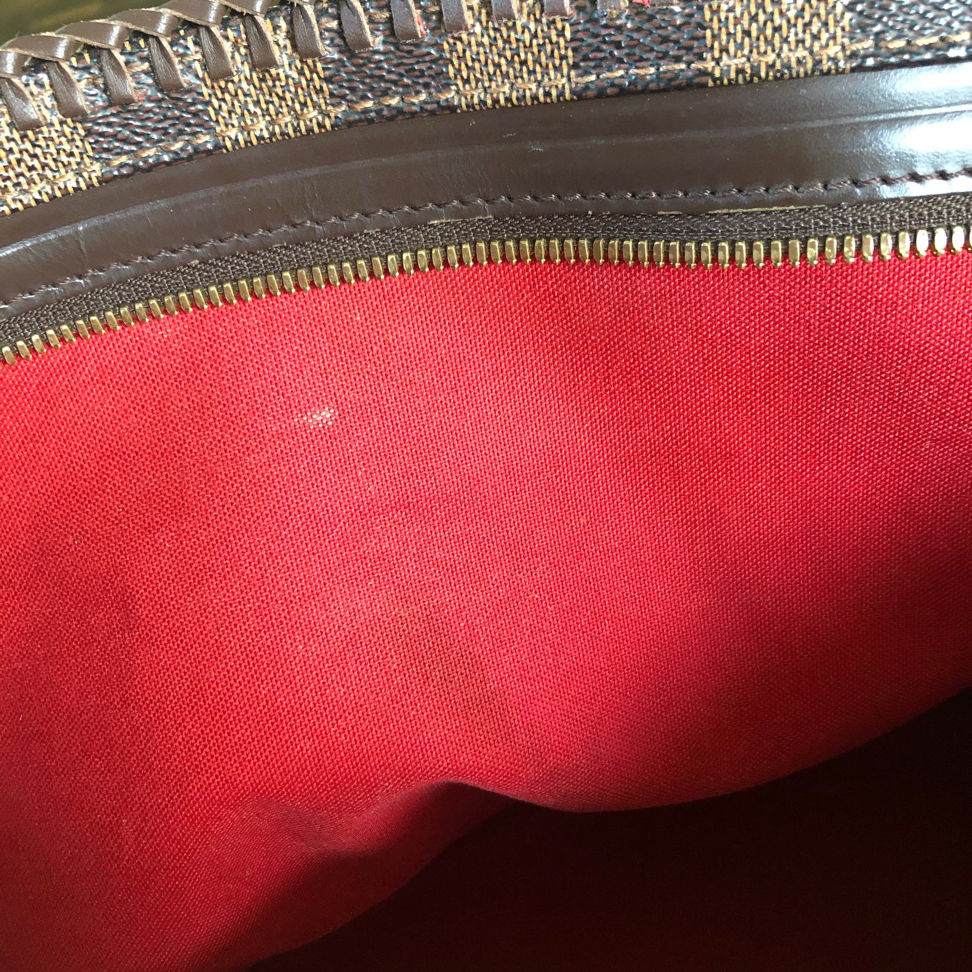 The bag's outer Damier Ebene canvas is in excellent shape! The inside red liner is also extremely clean, with only one noticeable mark. There is one zippered pocket inside, and a very roomy interior. This bag normally has snaps that hold down the ends of the zipper, but they were non-functional, so I replaced them with brass screws.
