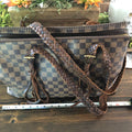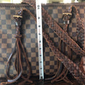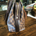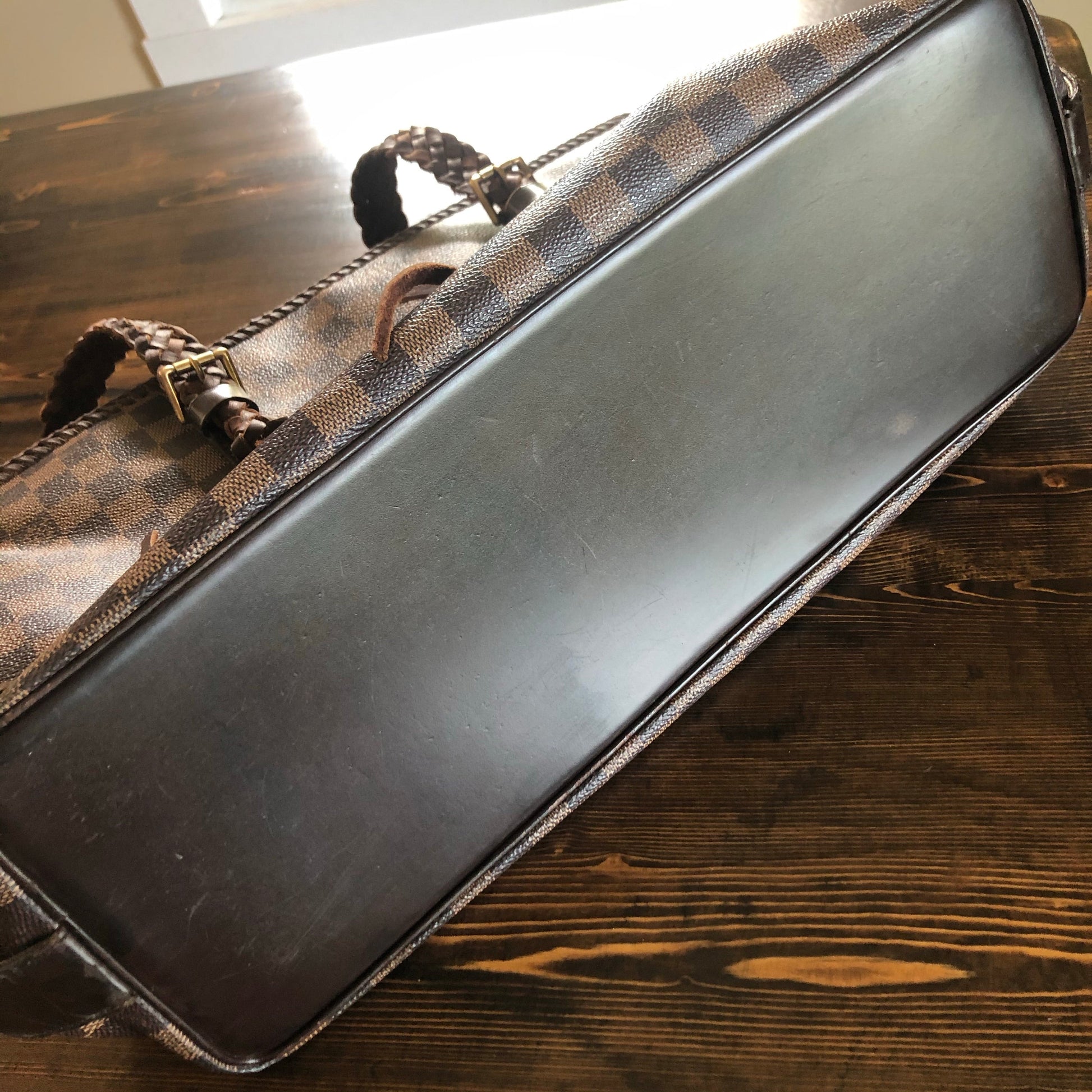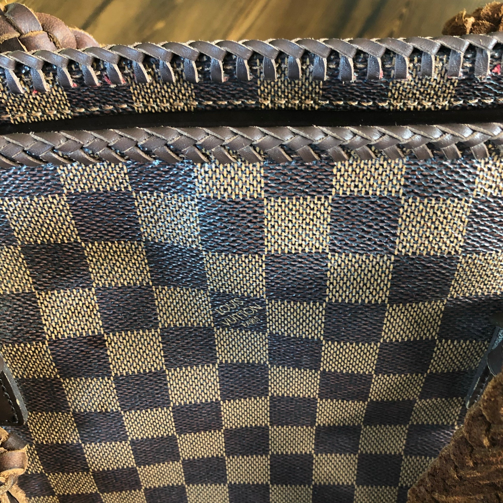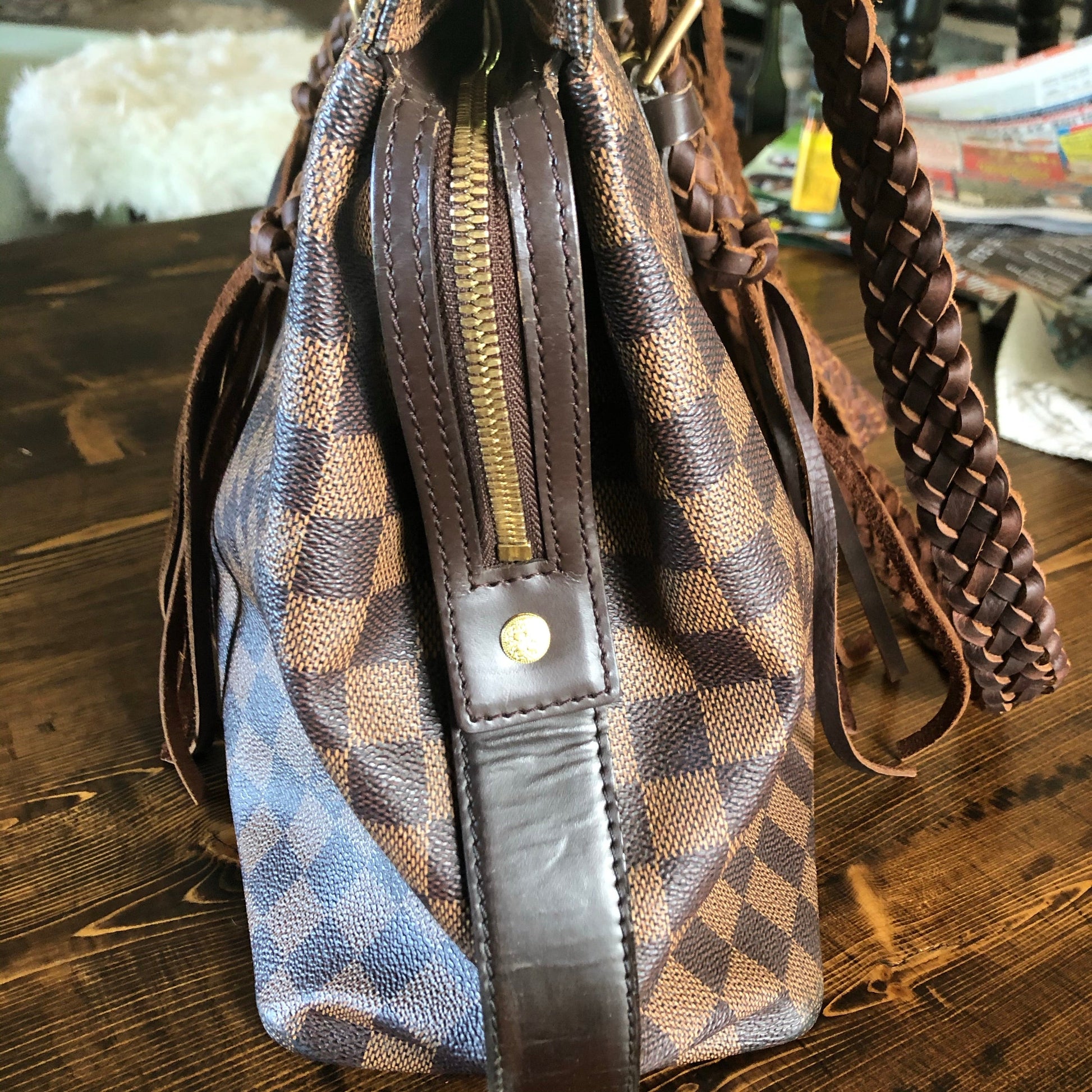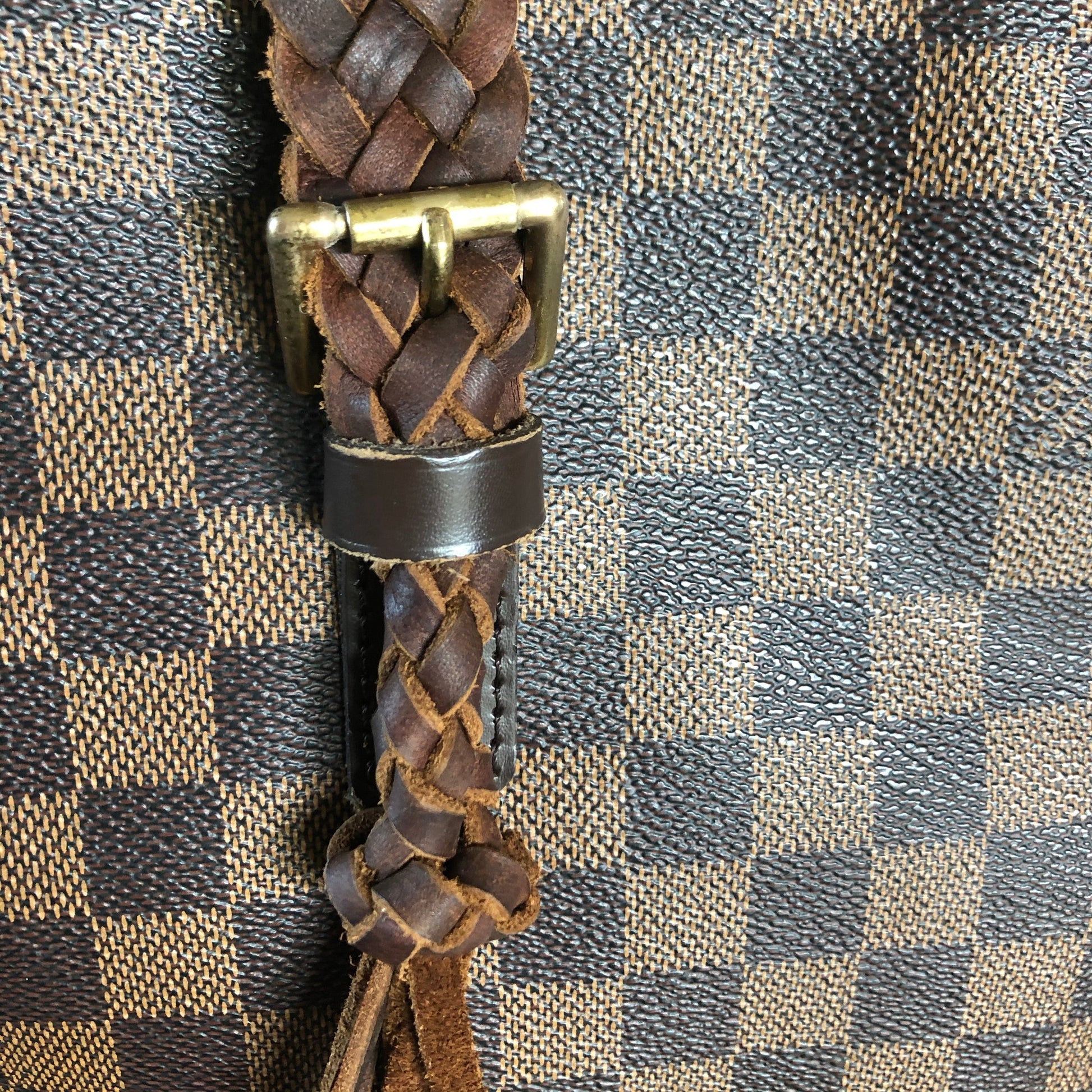 The bag's outer Damier Ebene canvas is in excellent shape! The inside red liner is also extremely clean, with only one noticeable mark. There is one zippered pocket inside, and a very roomy interior. This bag normally has snaps that hold down the ends of the zipper, but they were non-functional, so I replaced them with brass screws.