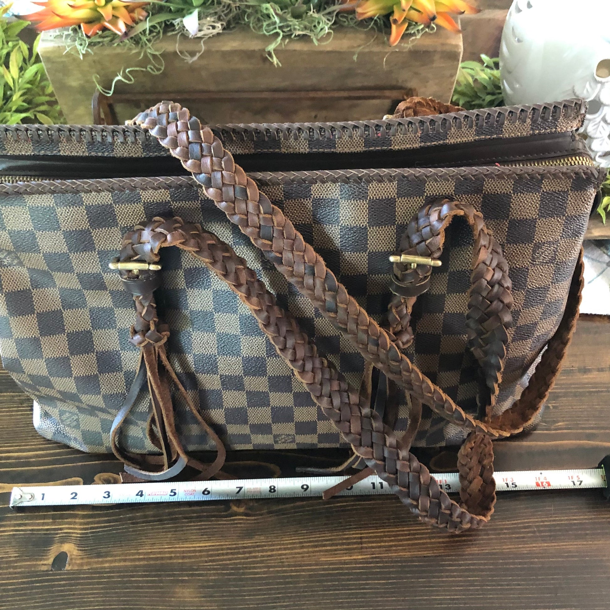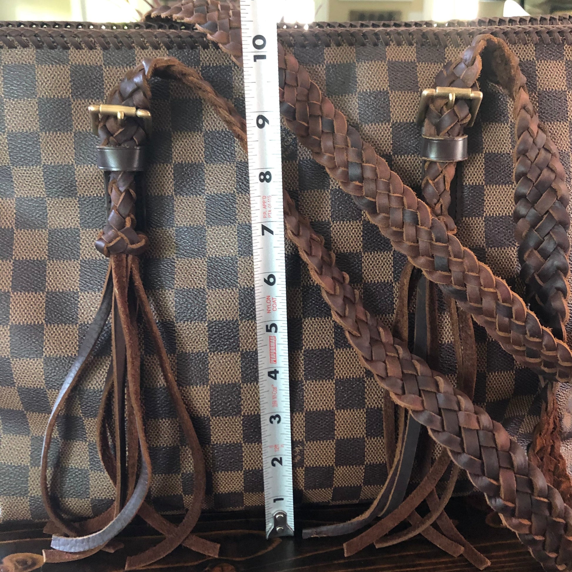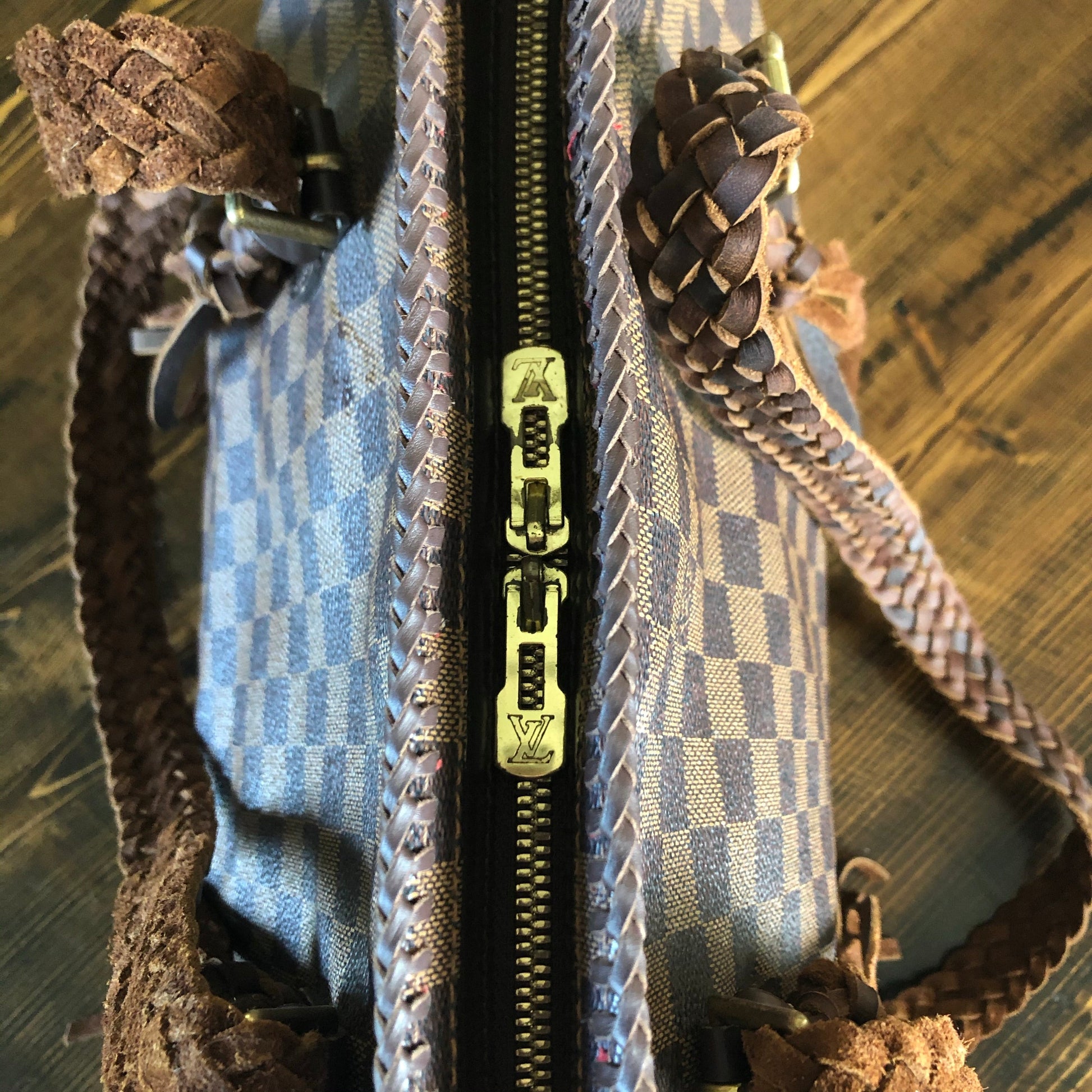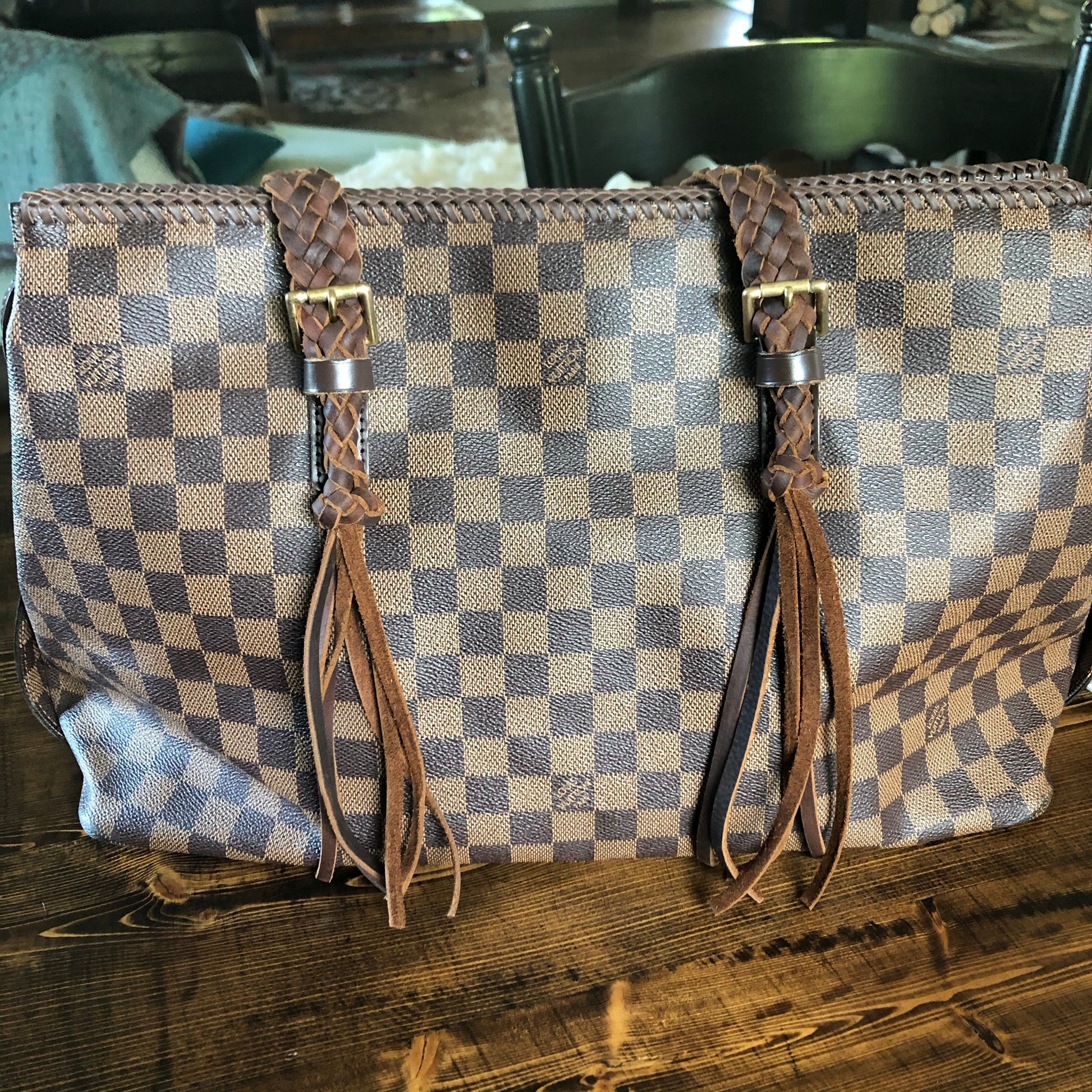 I started with an Louis Vuitton Chelsea bag, added some braiding along the top, replaced the straps, and voila! A beautiful and functional bag was born! This bag is W16 x H11 x D6".