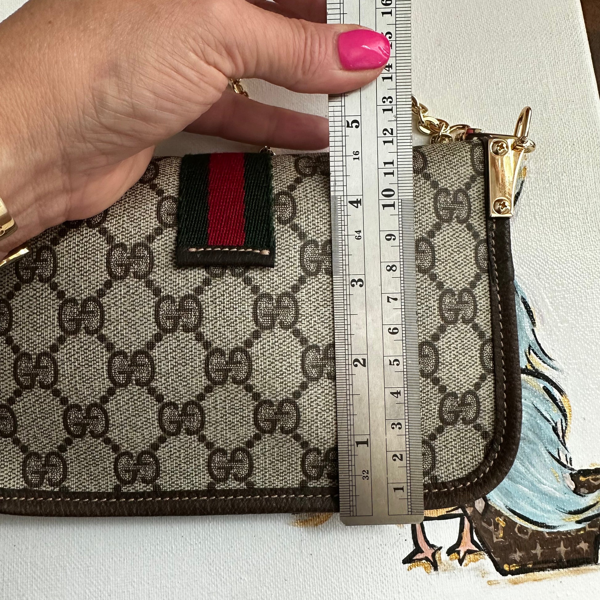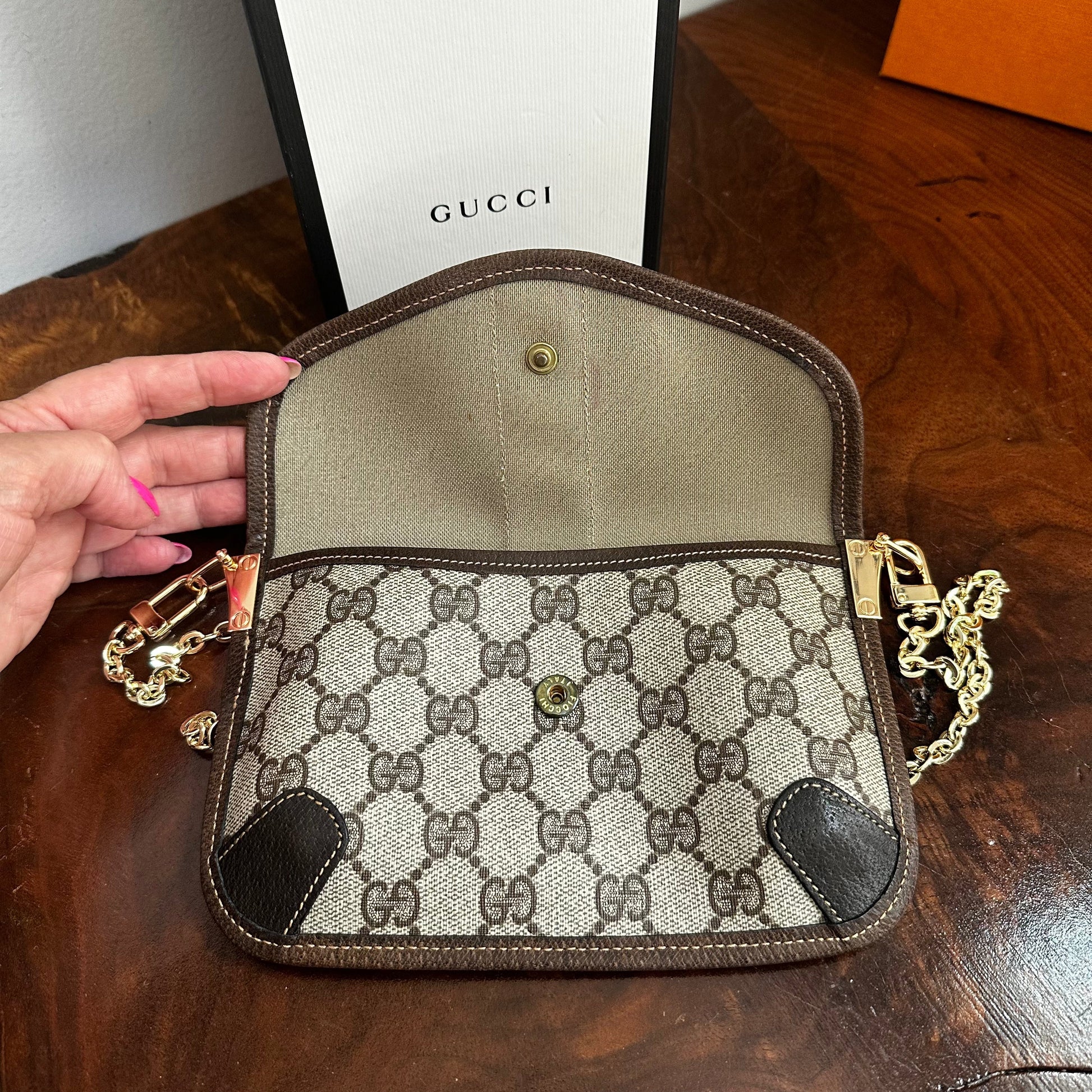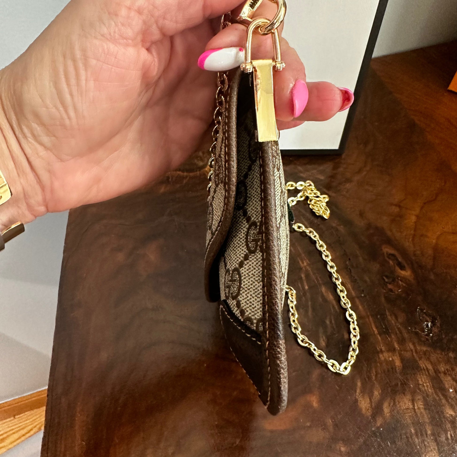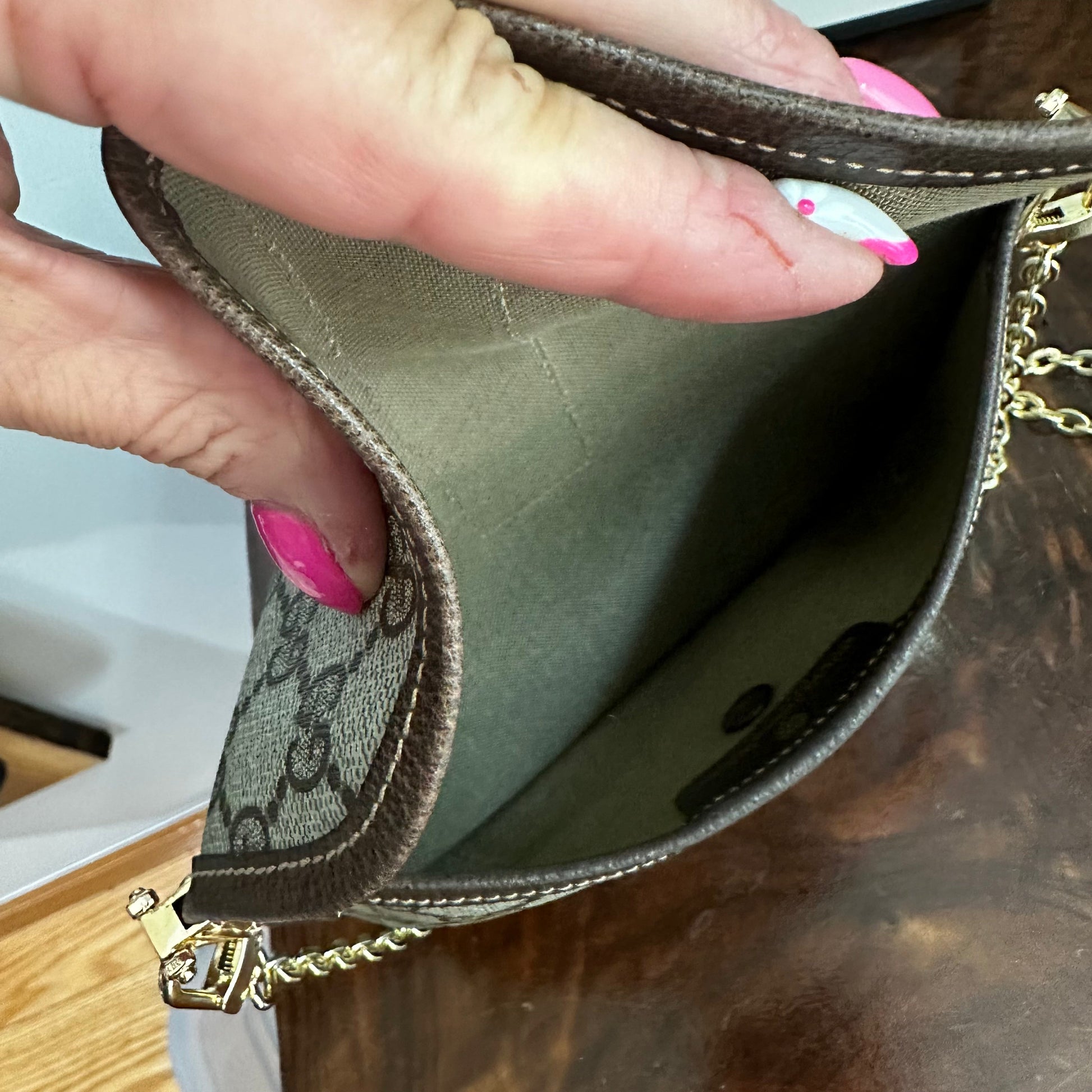 This adorable Junco is a small bag that is the perfect accessory and will go with any outfit! This bag was part of Gucci's Sherry Line and was part of their Accessory collection. In order to make it more useable, I've added side D-rings in order to hold the fun crossbody chain strap. The strap is 39" long, which enables this bag to tuck up higher at your rib cage. If needed, I can add more links to make the chain 47", just add a note during checkout or contact me immediately after purchase. Both the exterior and interior have been fully cleaned, and she looks fantastic!!! It's a smaller bag that can carry just a few important things, coming in at W7.5 x H4.5x D1 inches.