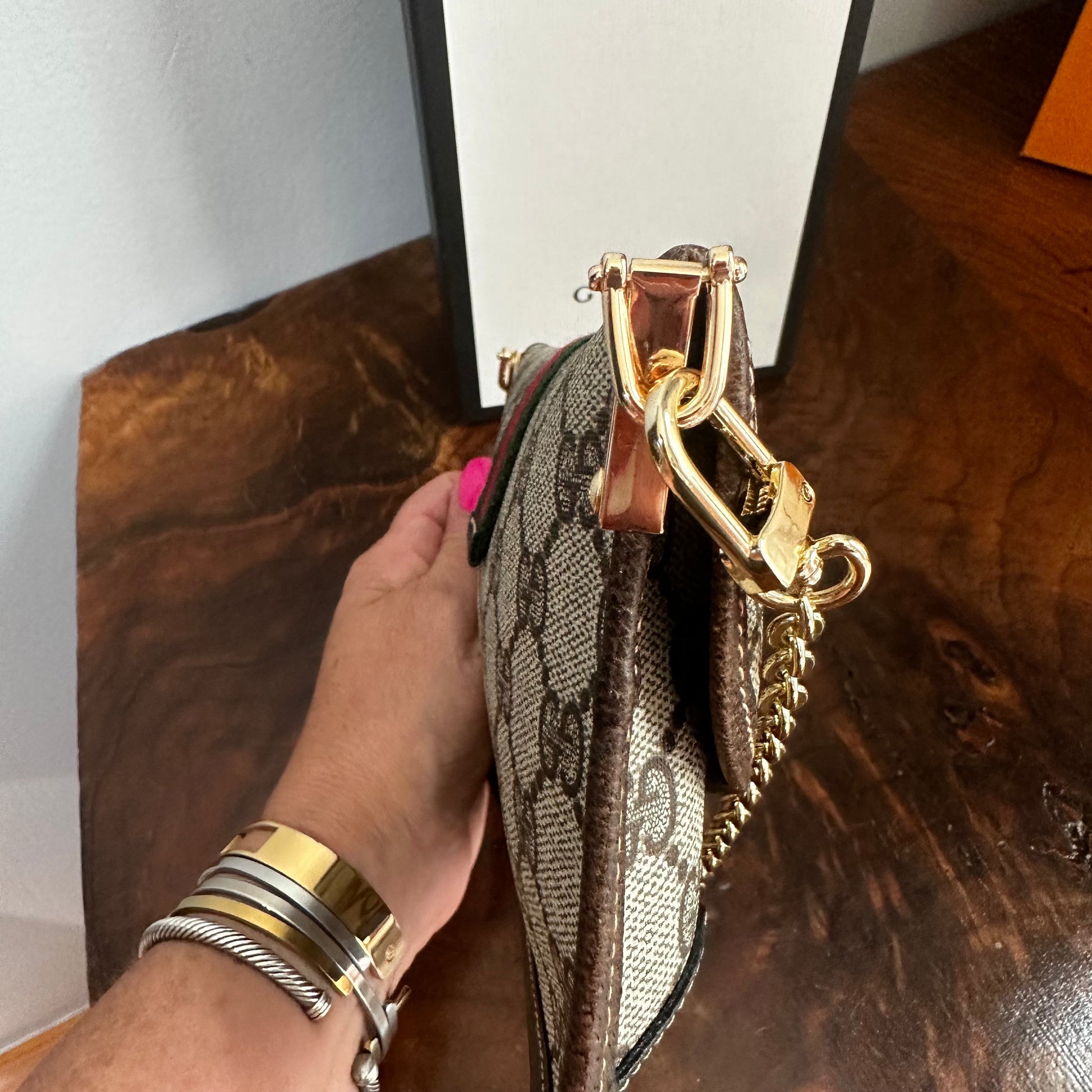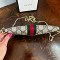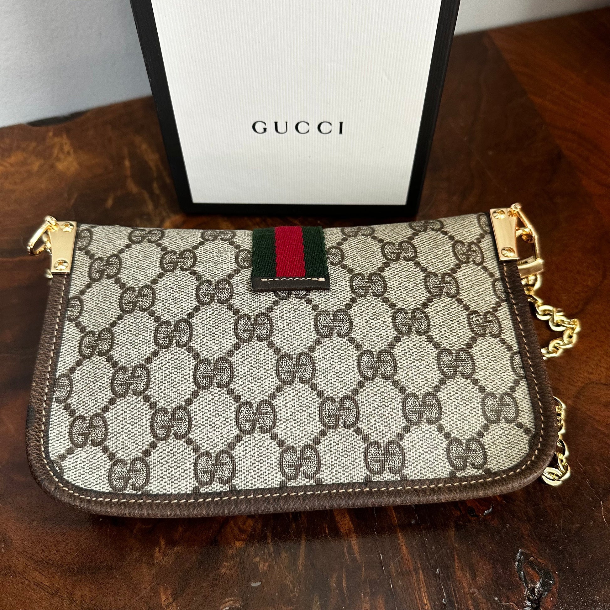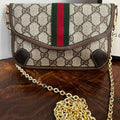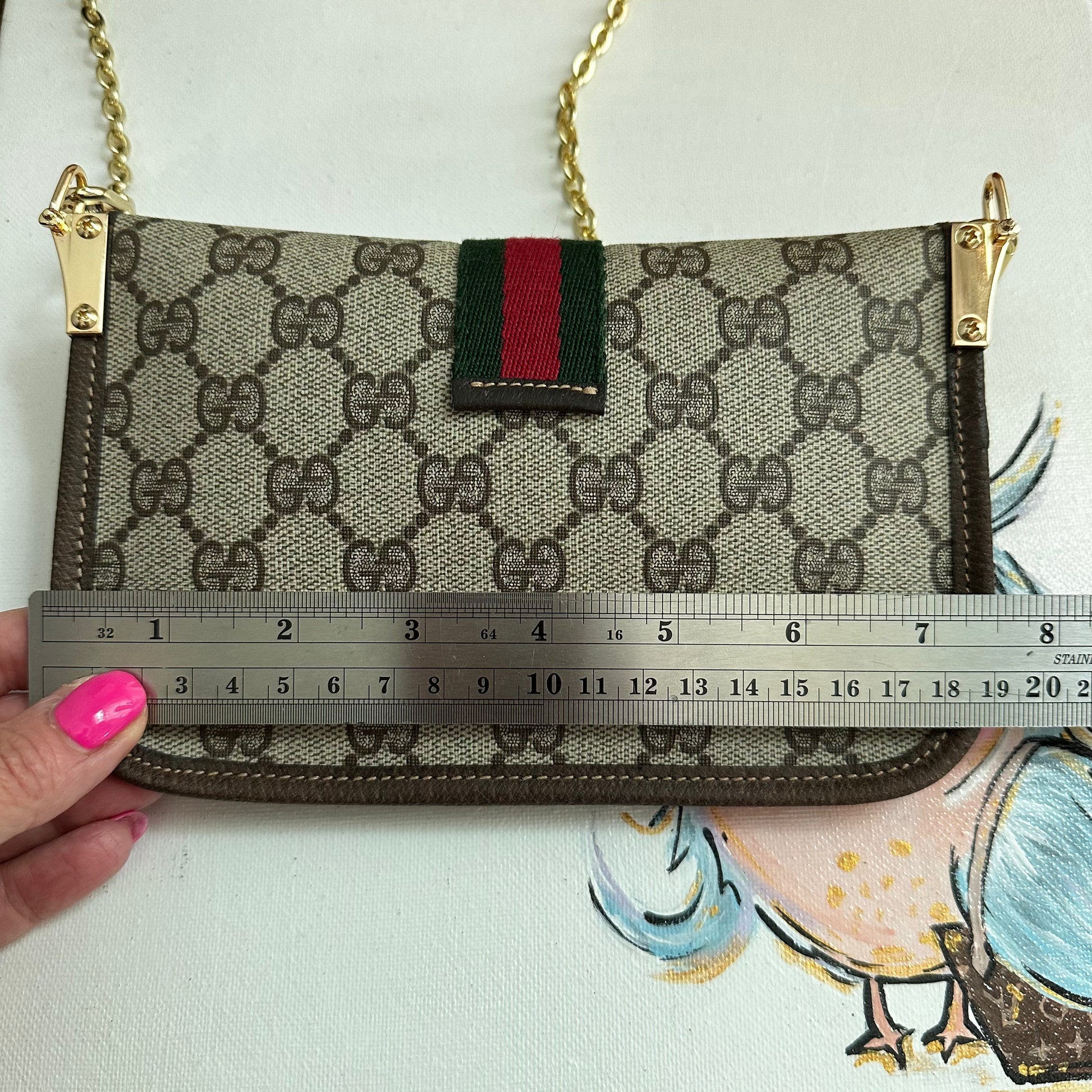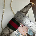 This adorable Junco is a small bag that is the perfect accessory and will go with any outfit! This bag was part of Gucci's Sherry Line and was part of their Accessory collection. In order to make it more useable, I've added side D-rings in order to hold the fun crossbody chain strap. The strap is 39" long, which enables this bag to tuck up higher at your rib cage. If needed, I can add more links to make the chain 47", just add a note during checkout or contact me immediately after purchase. Both the exterior and interior have been fully cleaned, and she looks fantastic!!! It's a smaller bag that can carry just a few important things, coming in at W7.5 x H4.5x D1 inches.