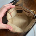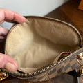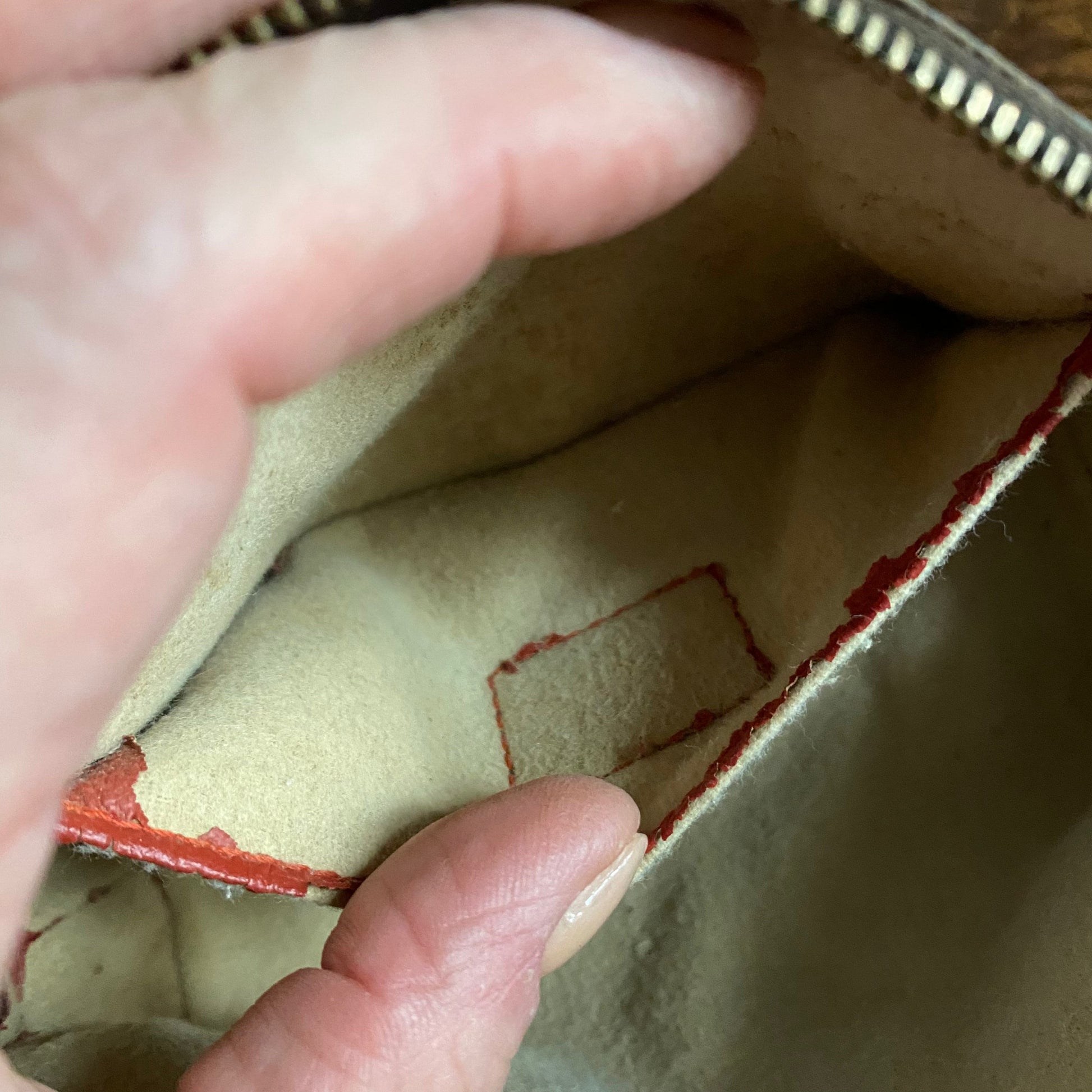 The Vuittonite (see below) was super sticky, so I scrubbed it out, leaving a soft flannel interior. It still has the LV patch and a small pocket. I did my very best to remove all the red, but some still remains. It had a musty smell, so I gave it a good bath and added some lavender oil to the interior flannel ... it smells LOVELY now. The zipper has been polished and is fully functional. The exterior canvas is clean, however there is a small amount of wear. I've added brass D-rings to the back and attached a gorgeous thin brown leather strap that is 47", thereby making this the cutest "running to the store bag" ever!! I can switch out the strap to a different one (chain or canvas) if you'd like, just message me to get options!!