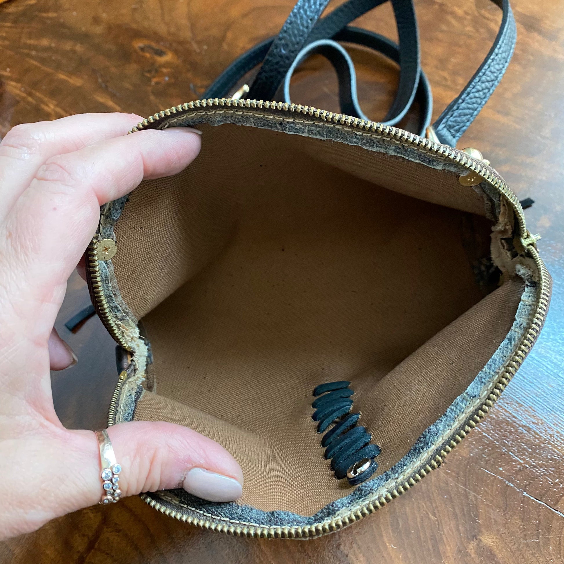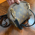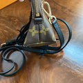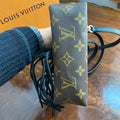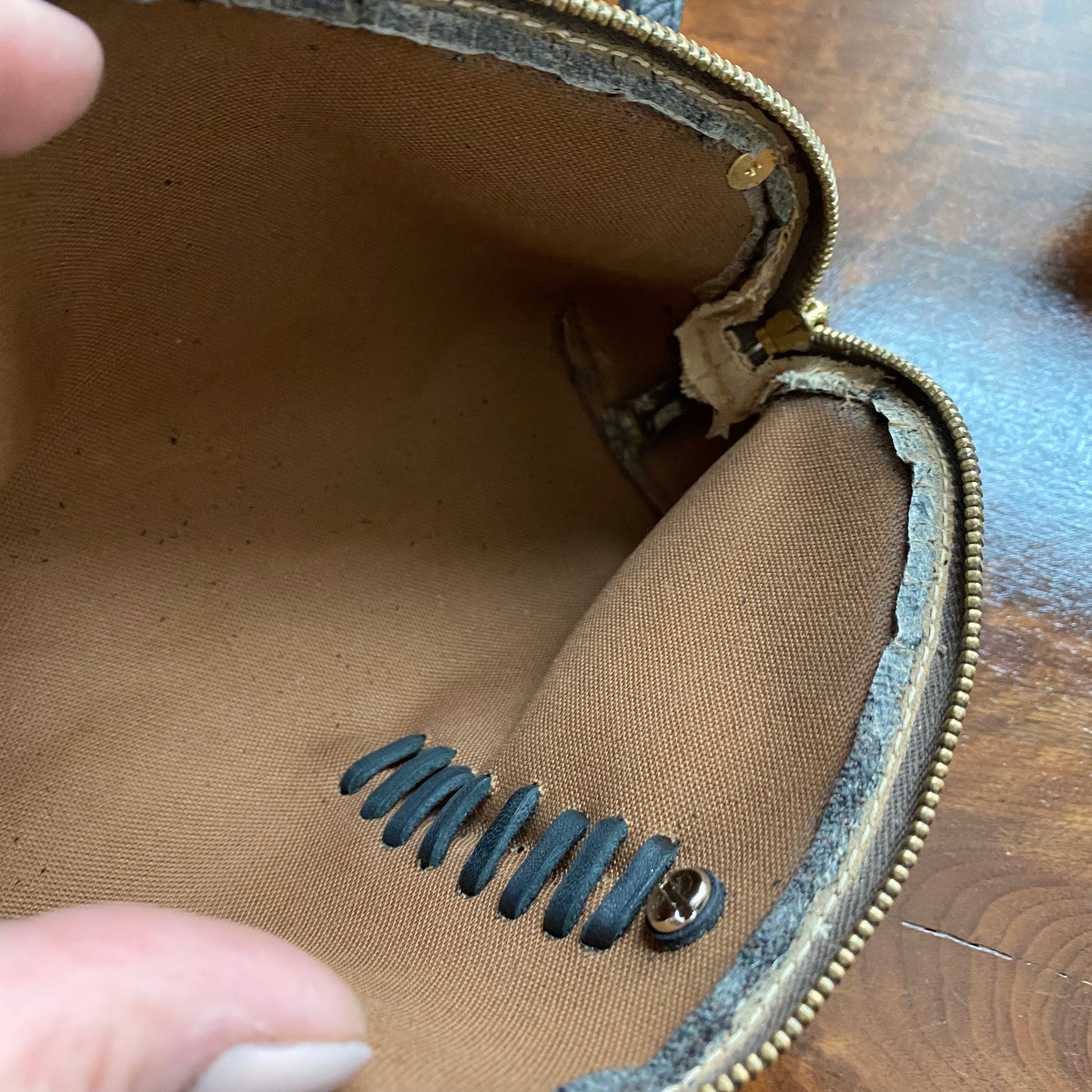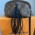 The Vuittonite (see below) was a mess, so I removed it entirely ... leaving the bare canvas similar to a speedy bag. The zipper is fully functional. The canvas is clean, however the edges and corners do show a tiny bit of wear. The leather end tabs were also missing when I received it. I've added black fringe and a black concho to the front to give it a fun flair. I've also added brass D-rings to the back and attached a black leather strap that's adjustable from 43-51", thereby making this the cutest "running to the store bag" ever!! I can switch out the strap to a different one if you'd like (even chains), just message me to get options!!
