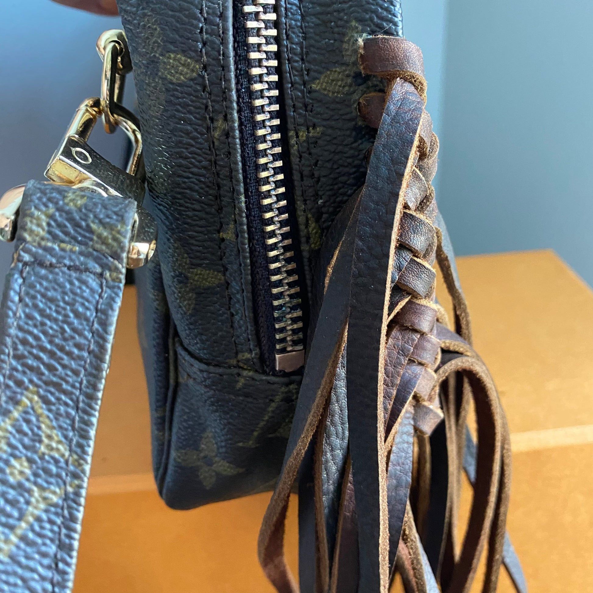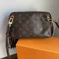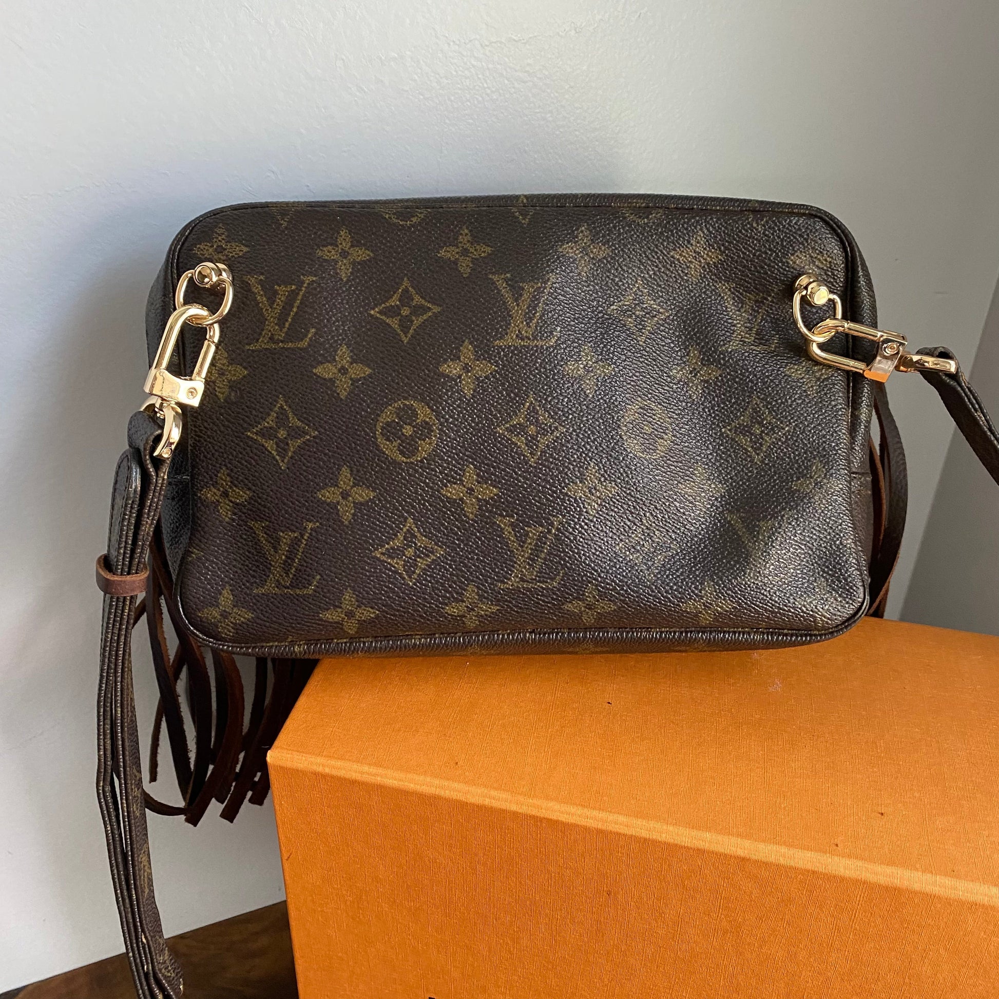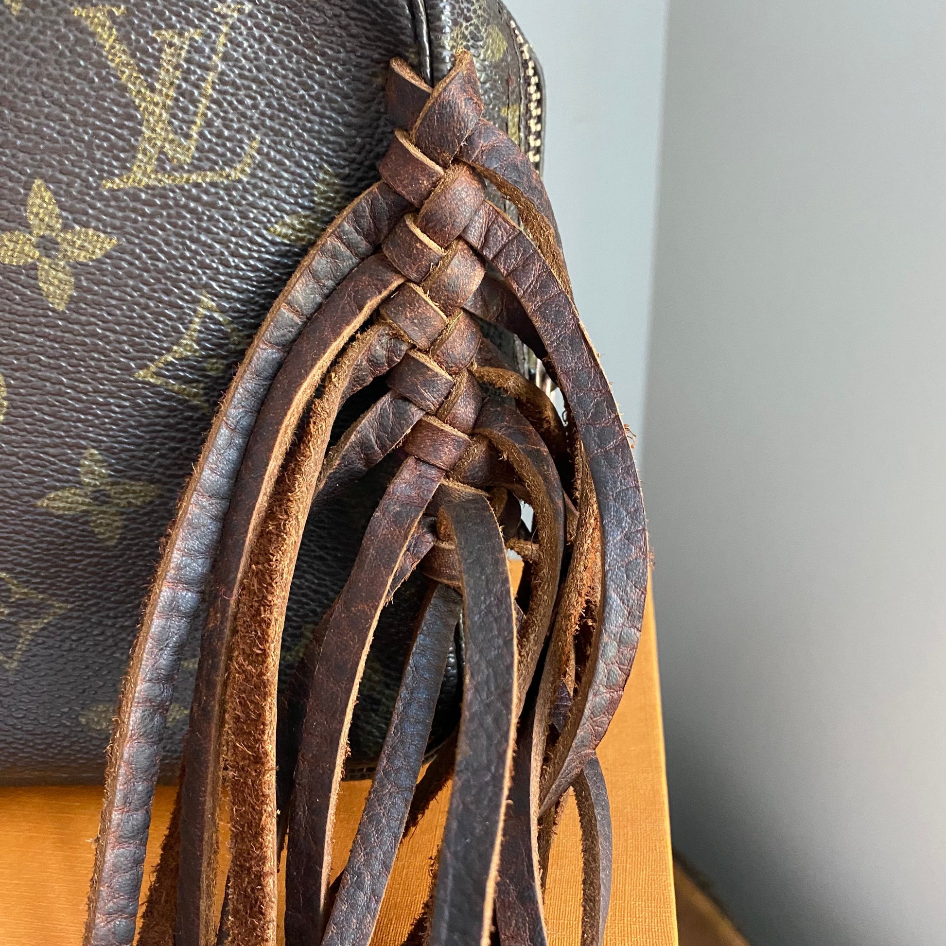 This bag's Monogram is in great shape (except for one small spot on the backside), so I hand braided brown leather lace to the sides to give it some visual interest! The inside is clean and has a slot pocket and three bands that can hold sunglasses, hand sanitizer, etc. Because this was a cosmetic pouch, I added D-rings to the back to hold an adjustable LV strap that I had left over from another bag (worth $100+!!). I love how she turned out!!!