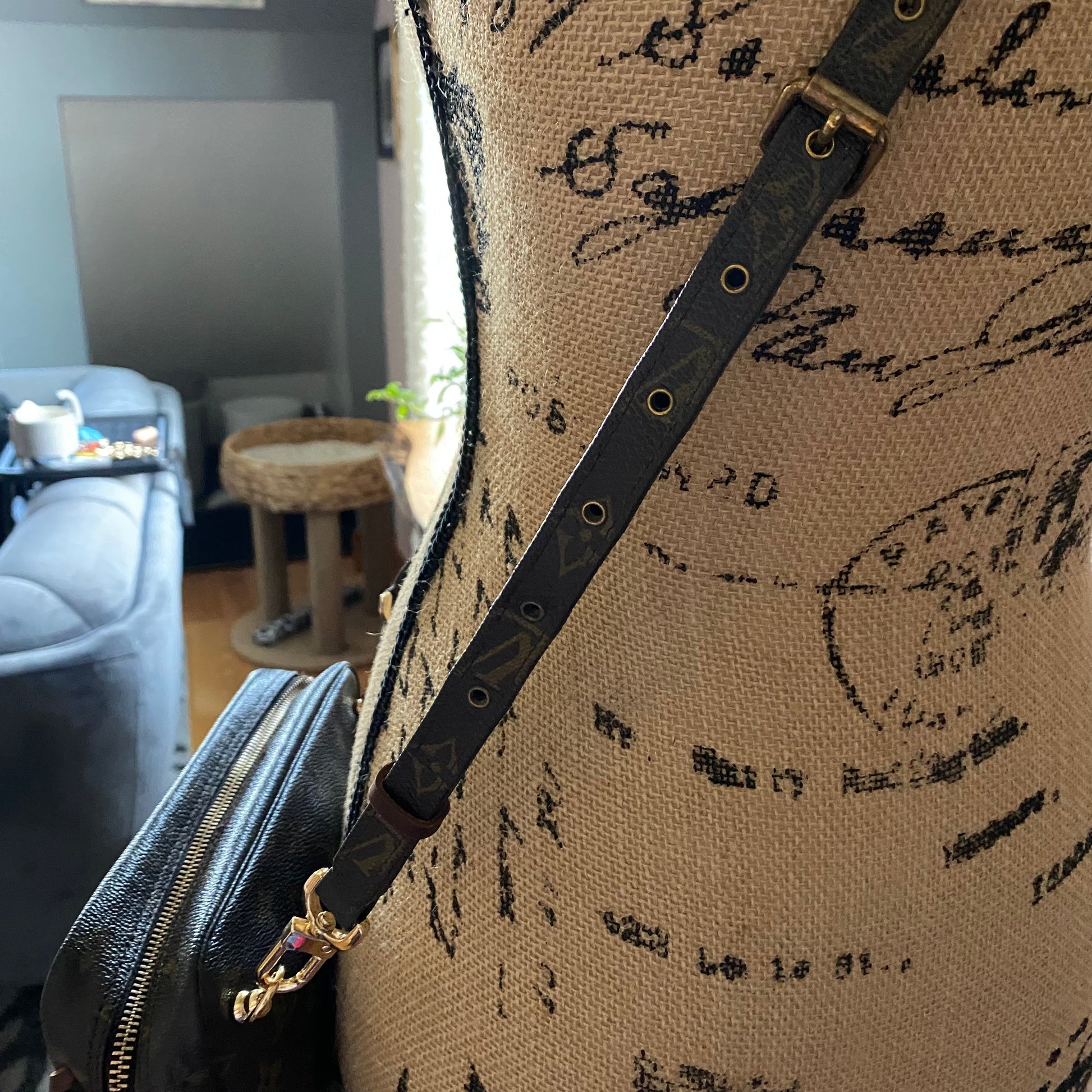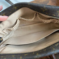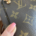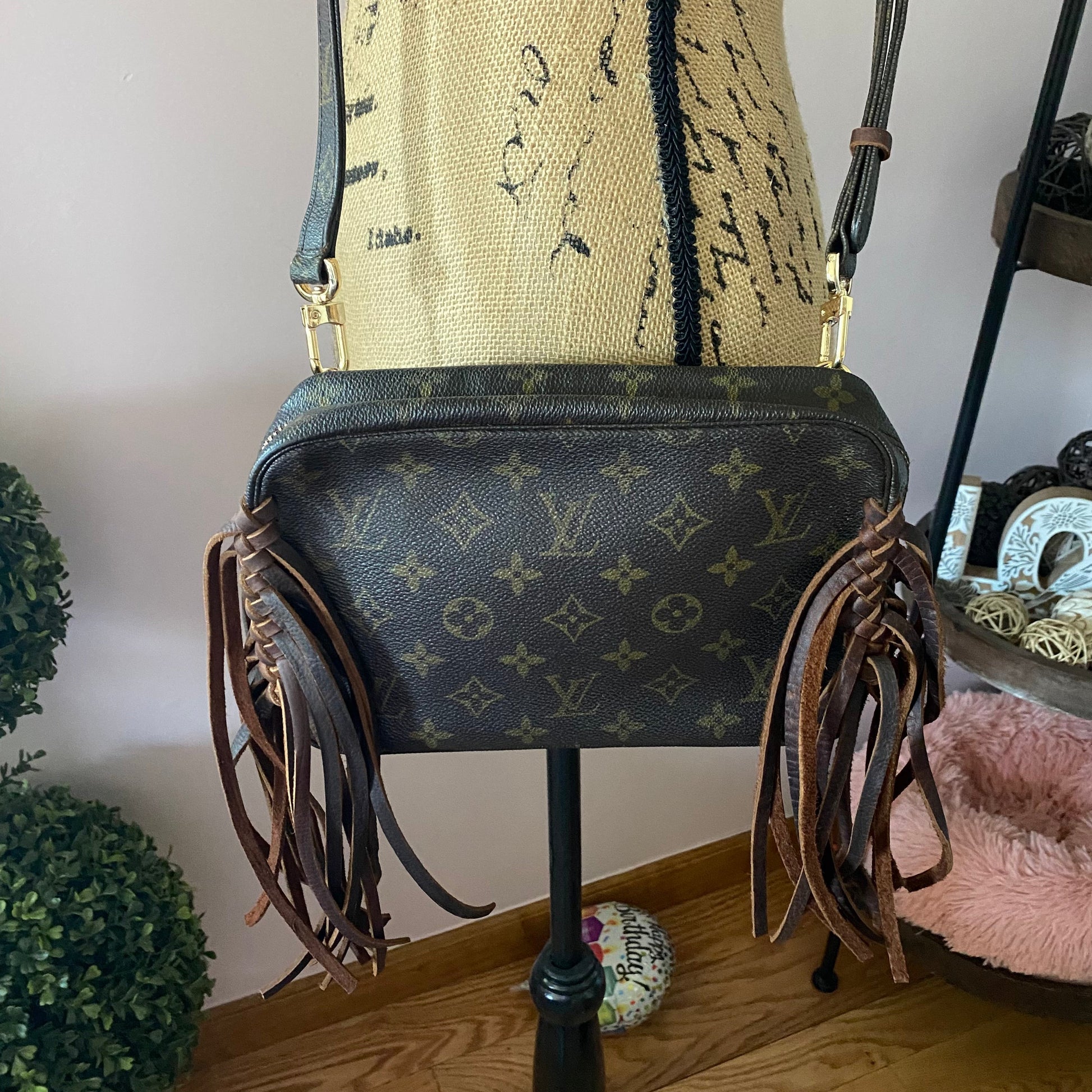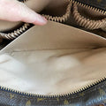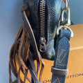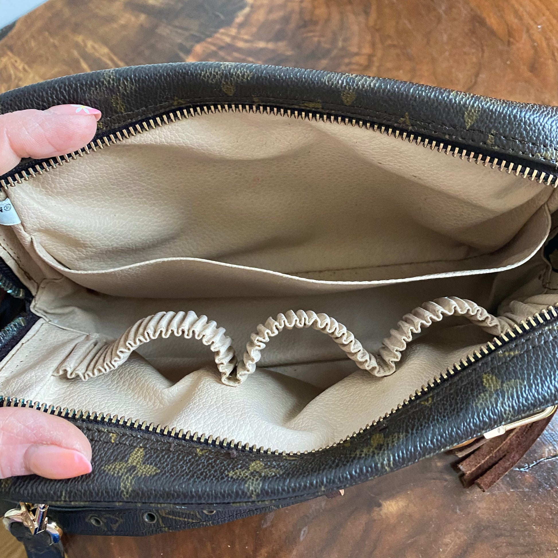 This bag's Monogram is in great shape (except for one small spot on the backside), so I hand braided brown leather lace to the sides to give it some visual interest! The inside is clean and has a slot pocket and three bands that can hold sunglasses, hand sanitizer, etc. Because this was a cosmetic pouch, I added D-rings to the back to hold an adjustable LV strap that I had left over from another bag (worth $100+!!). I love how she turned out!!!