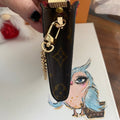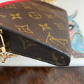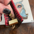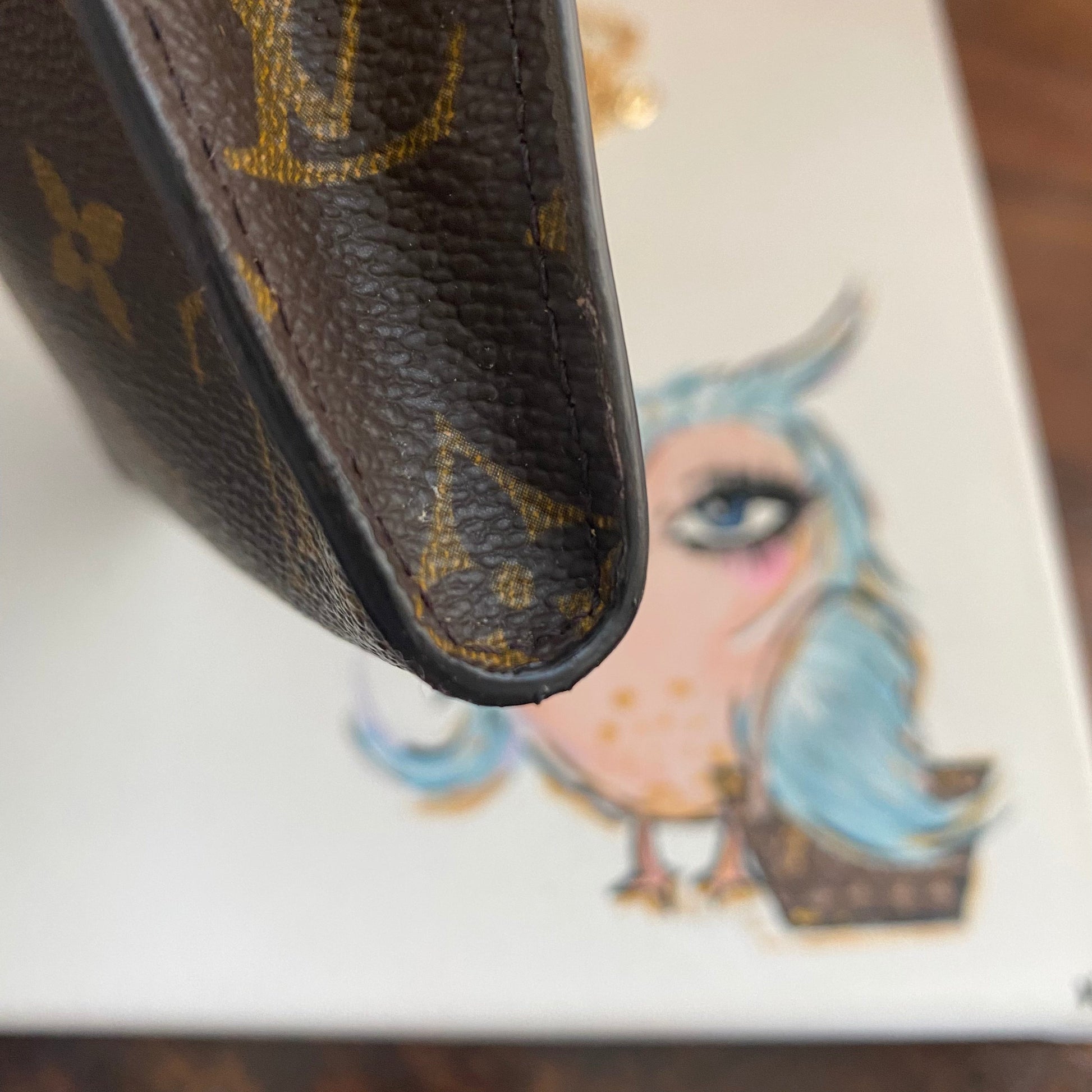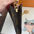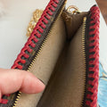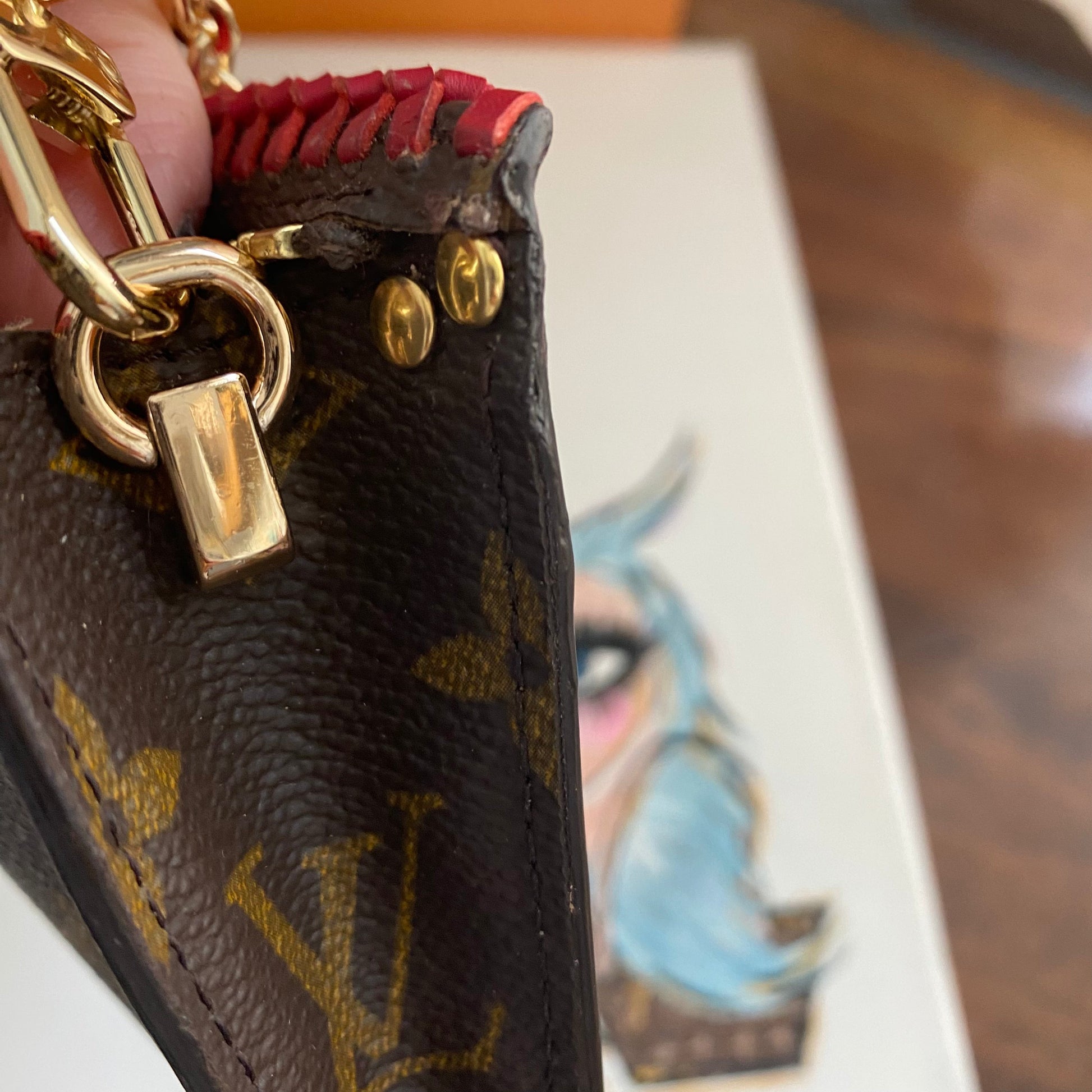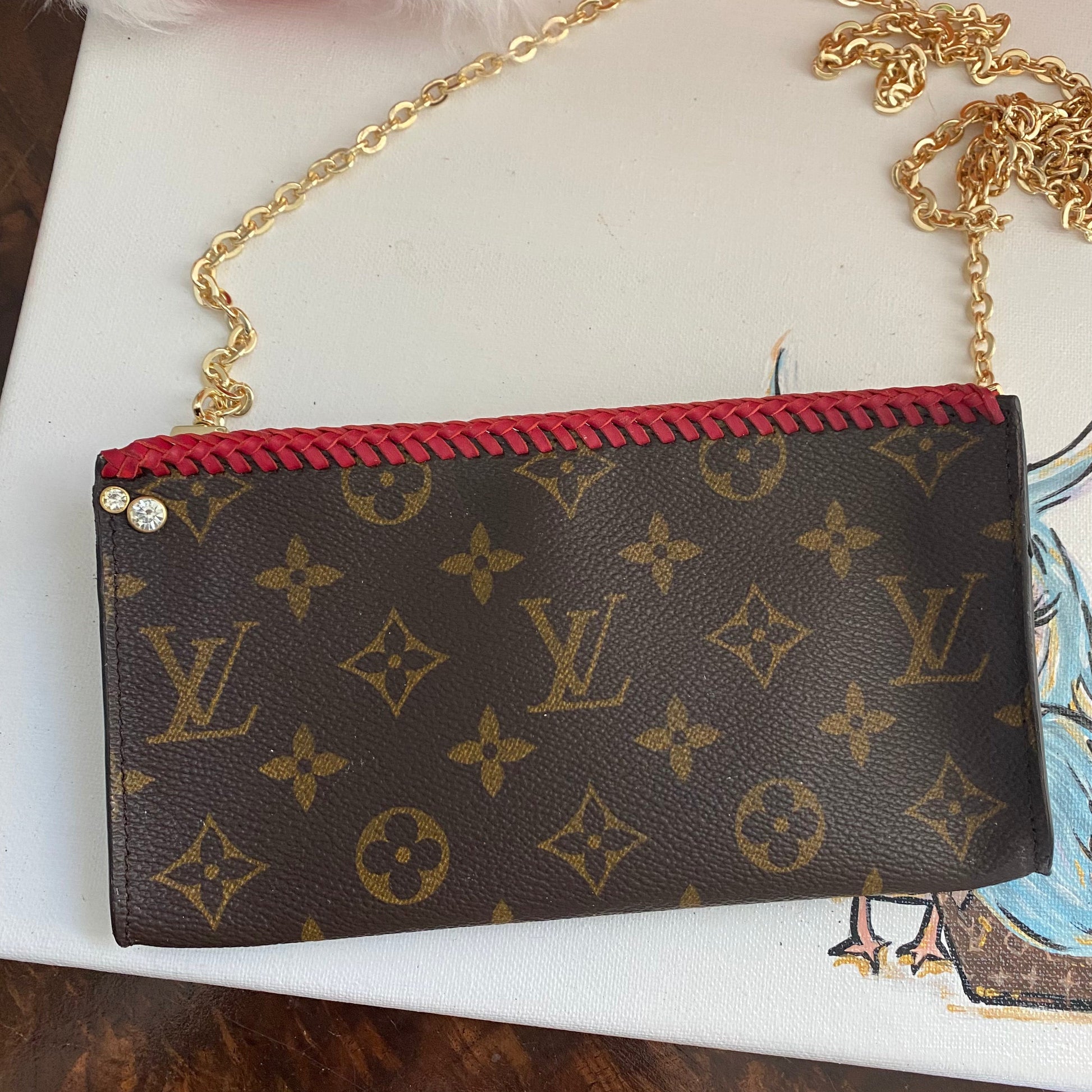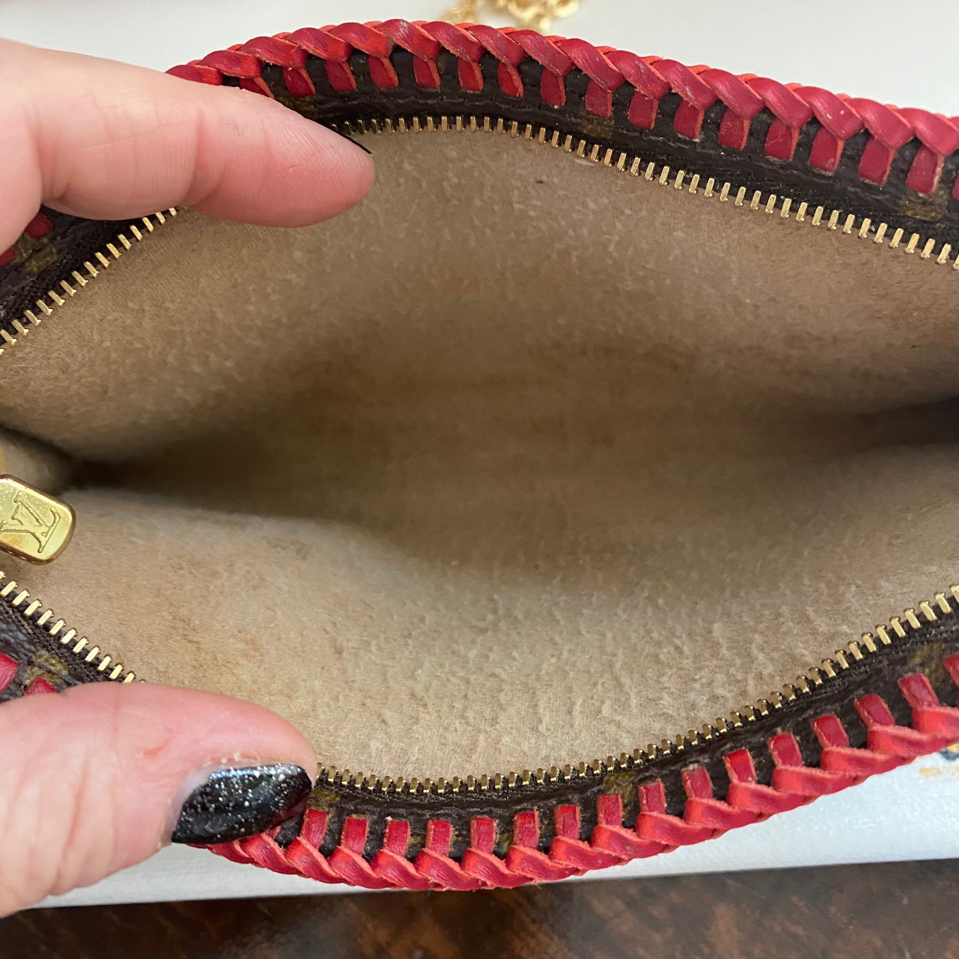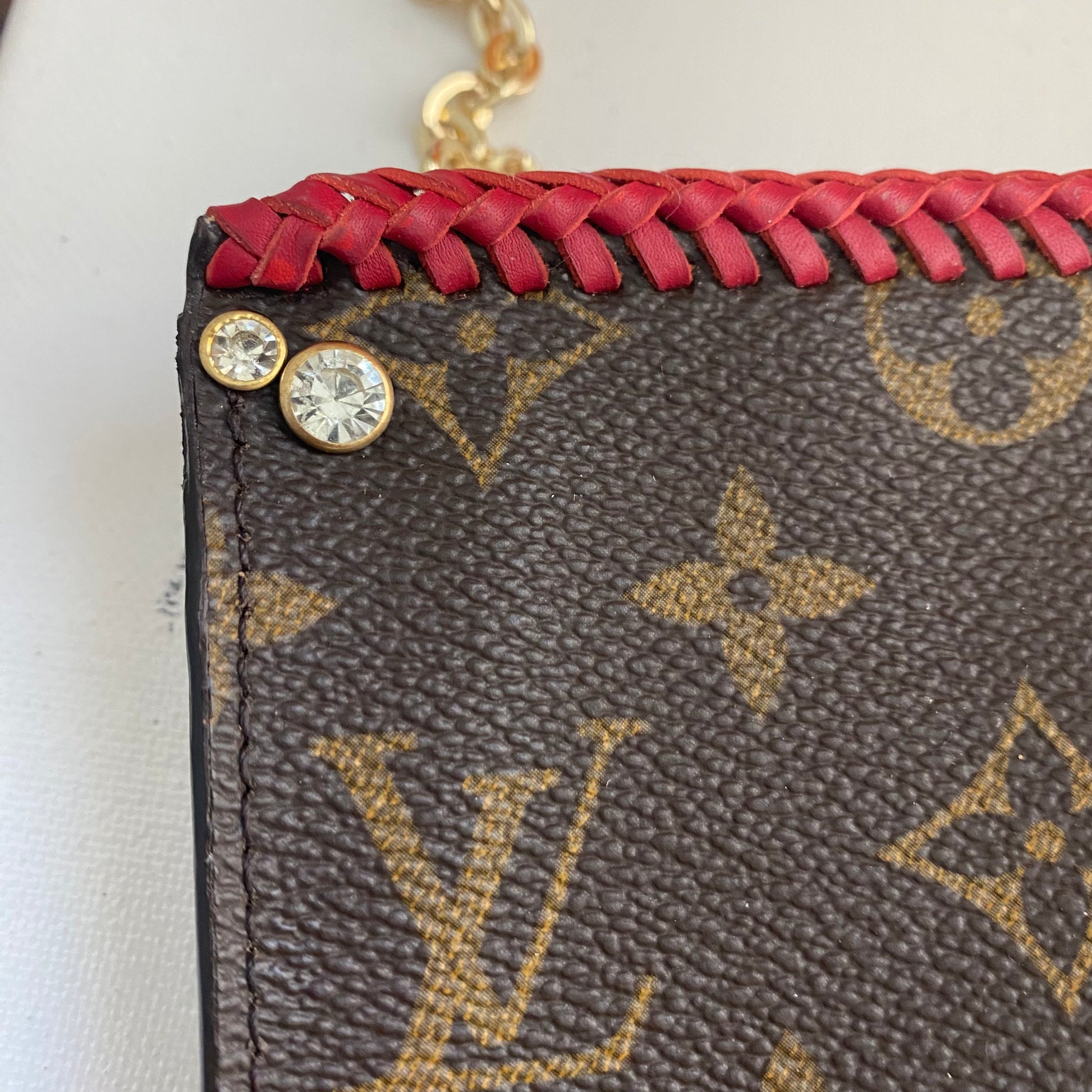 This bag's Monogram was in great shape so I hand braided a red leather lace on the top edges to give it a "Valentine" flair. The inside was a VERY sticky Vuittonite, so I had to scrub it all out, leaving a clean flannel-like interior. The leather zipper pull at the end was missing, so I shortened the overall zipper and added a flashy gold end to it. The front left corner was starting to pull away from the side, so I added some blingy crystals to ensure it stayed intact. And let's face it, they're super cute! I also re-coated the edges with an edge coat so they look brand new! I finished by adding some tiny gold D-rings to the sides and a fun chain (47") to make this a cute crossbody.