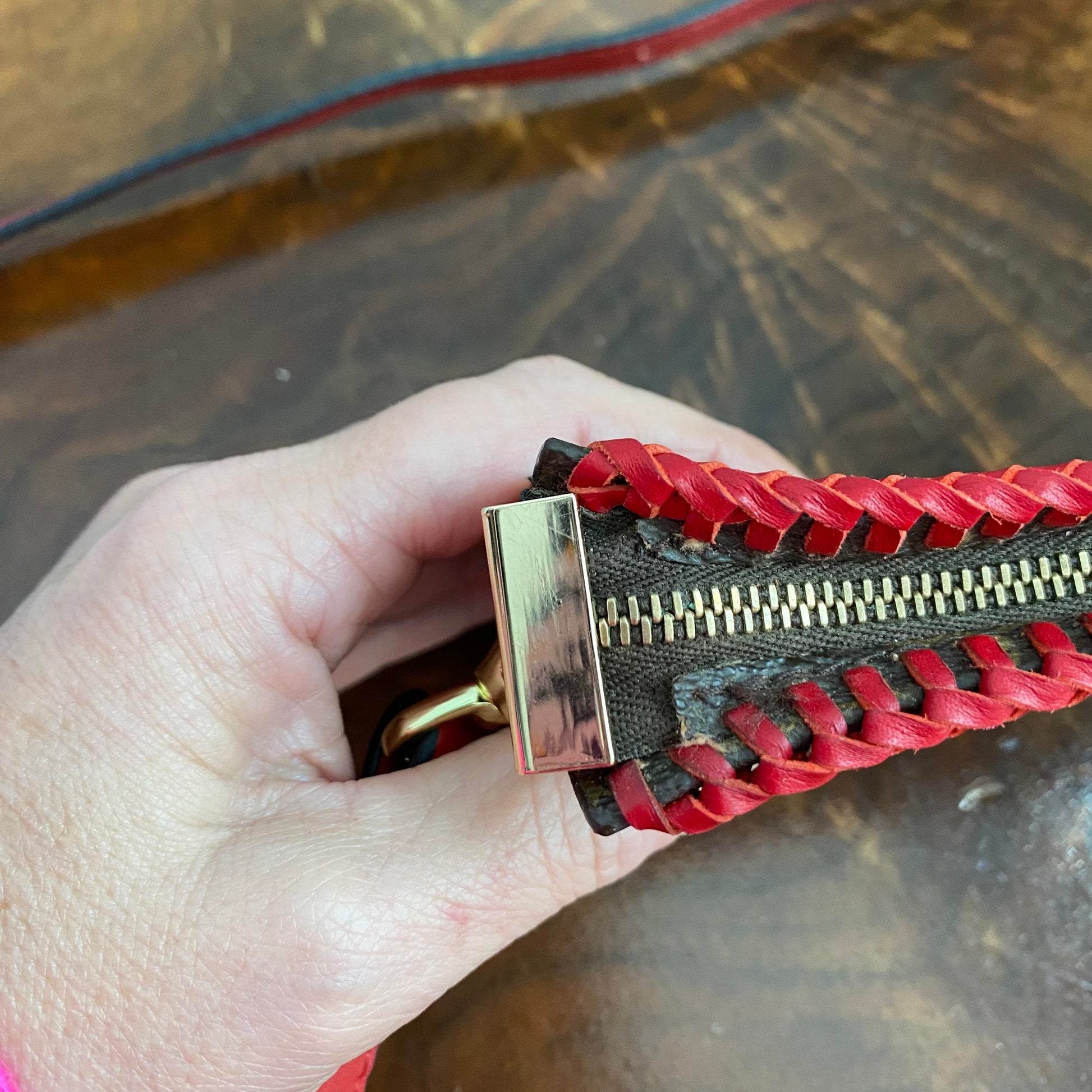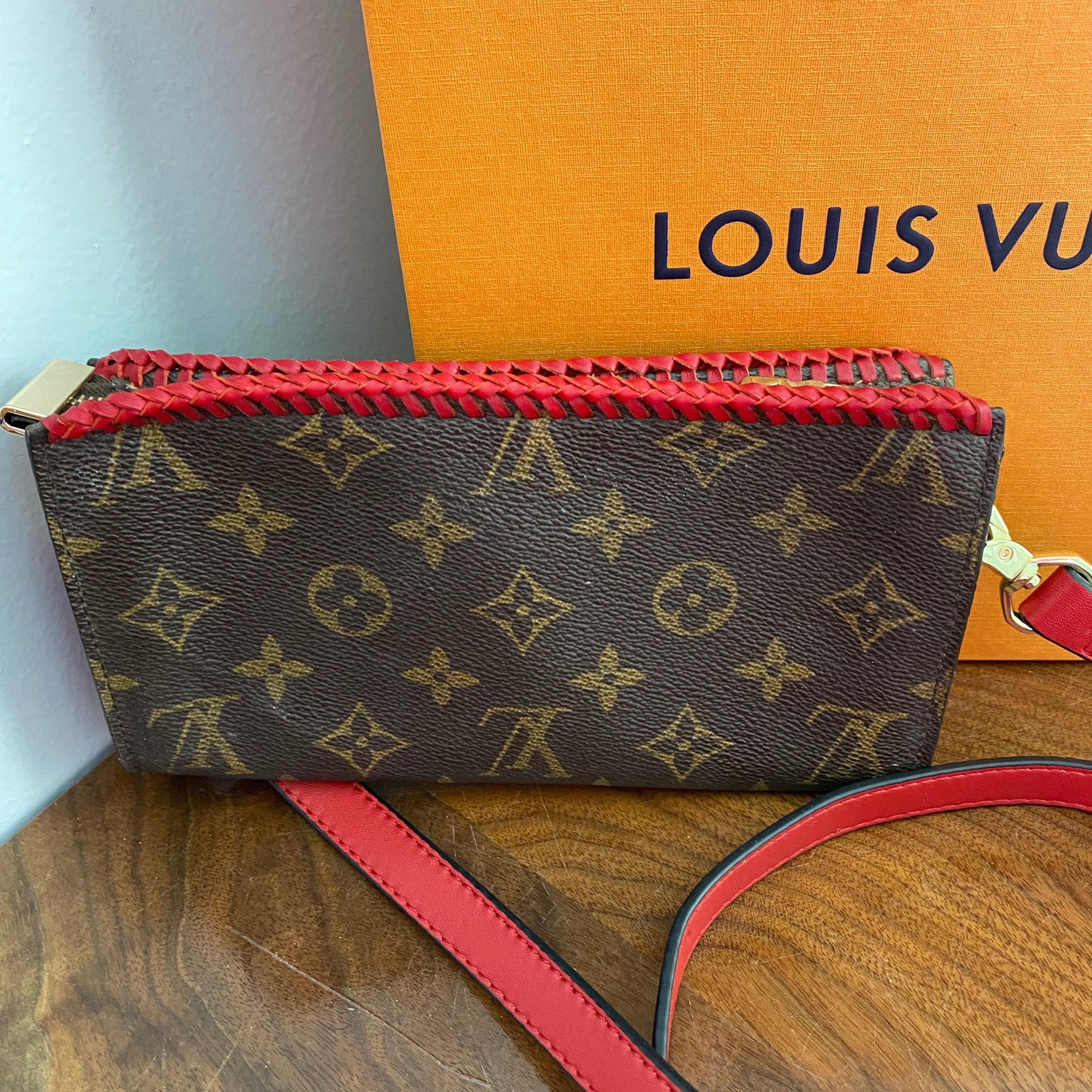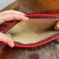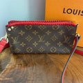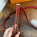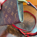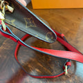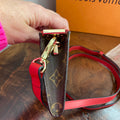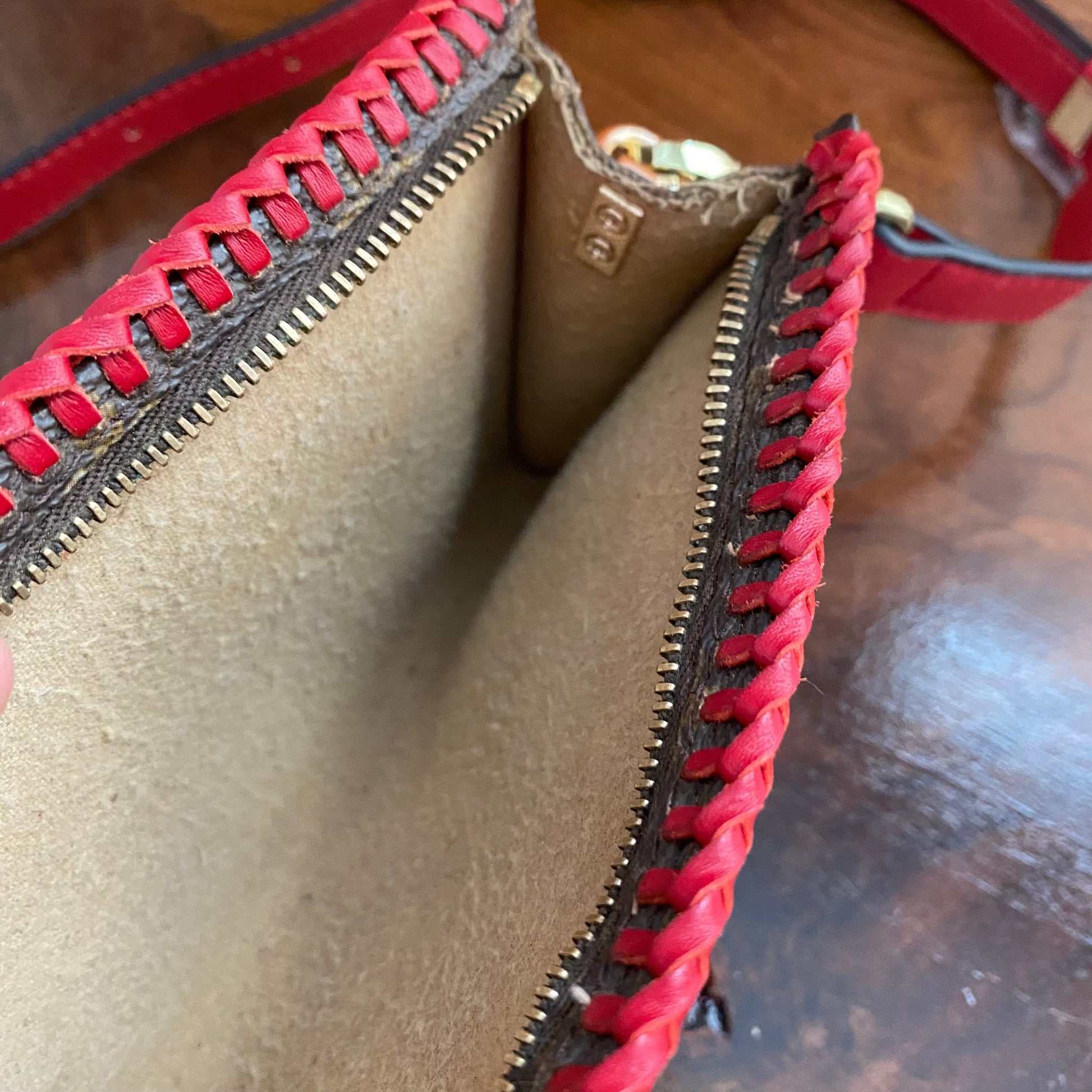 This bag's Monogram was in great shape so I hand braided a red leather lace on the top edges to give it a "Valentine" flair. The inside was a VERY sticky Vuittonite, so I had to scrub it all out, leaving a clean flannel-like interior. The leather zipper pull at the end was missing, so I shortened the overall zipper and added a flashy gold end to it. I added some blingy crystals to the front to give it a cute flair. I re-coated the edges with an edge coat so they look brand new! I finished by adding some tiny gold D-rings to the sides and a fun red leather adjustable strap (37-47") to make this a cute crossbody. If you'd prefer the gold strap with the red heart (similar to this), I can swap it out, just add a note during checkout!