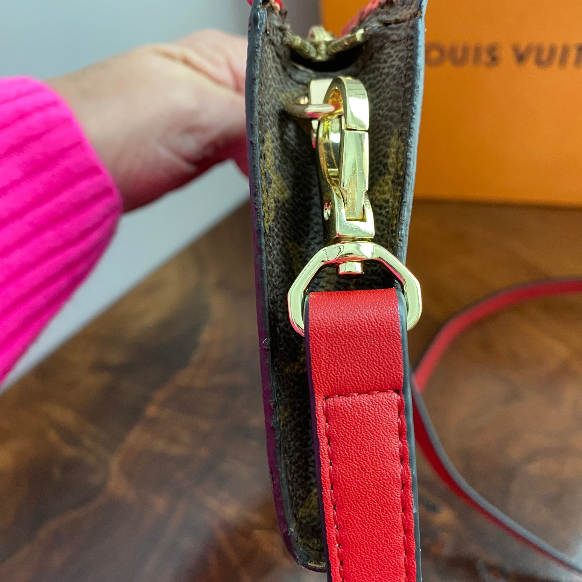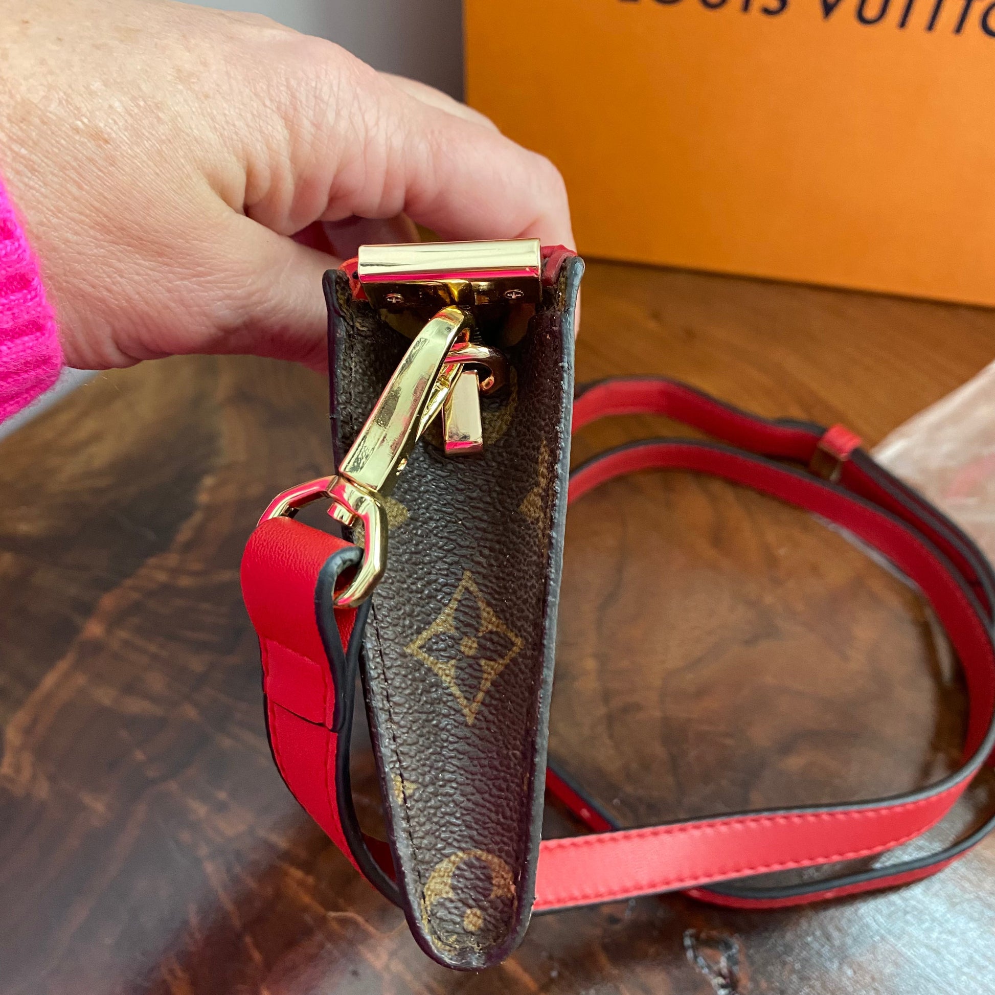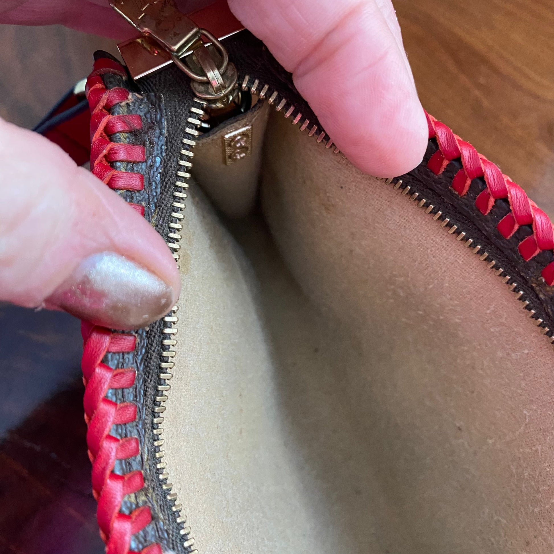 This bag's Monogram was in great shape so I hand braided a red leather lace on the top edges to give it a "Valentine" flair. The inside was a VERY sticky Vuittonite, so I had to scrub it all out, leaving a clean flannel-like interior. The leather zipper pull at the end was missing, so I shortened the overall zipper and added a flashy gold end to it. I added some blingy crystals to the front to give it a cute flair. I re-coated the edges with an edge coat so they look brand new! I finished by adding some tiny gold D-rings to the sides and a fun red leather adjustable strap (37-47") to make this a cute crossbody. If you'd prefer the gold strap with the red heart (similar to this), I can swap it out, just add a note during checkout!