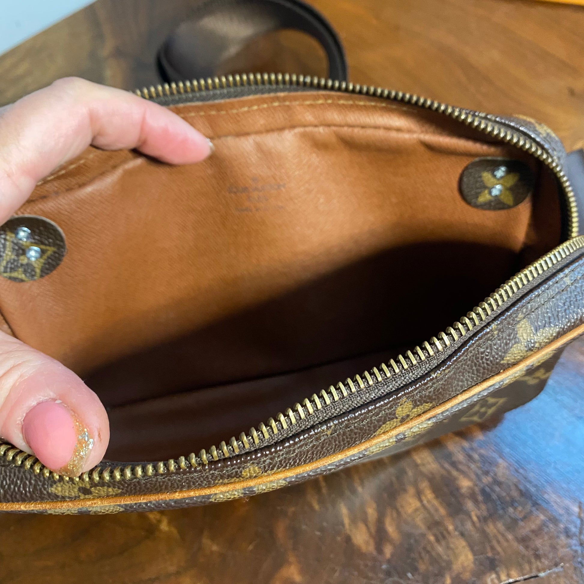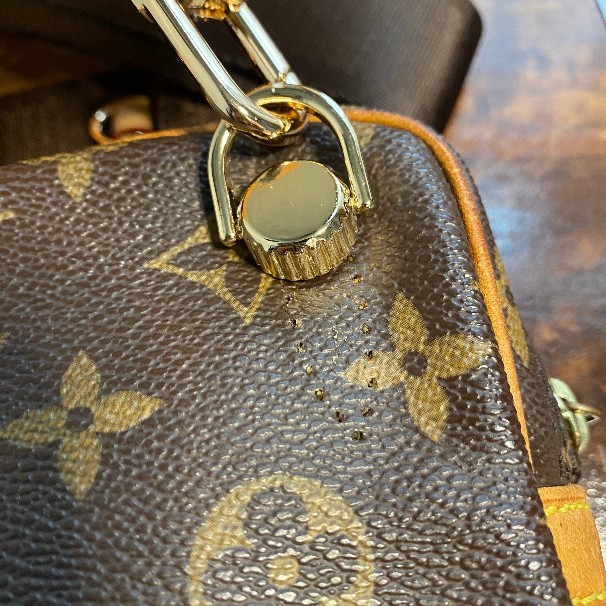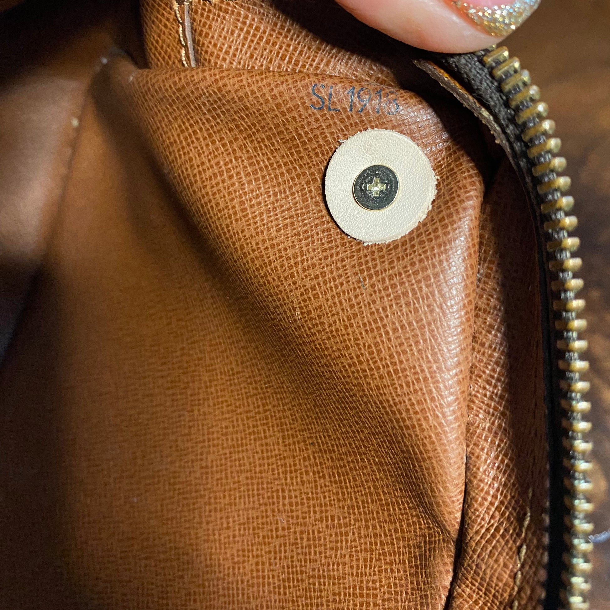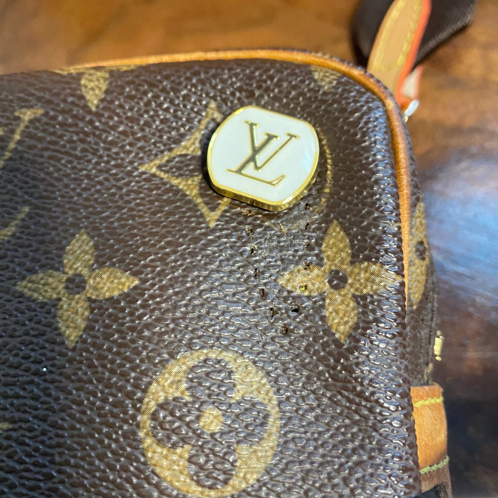 This bag's Monogram is clean and is in good shape. This bag typically has the strap holders on either side of the bag, but the strap was missing, so I removed the holders, leaving tiny sew holes (see pics!!). On the front I've covered that up with aPrestige Totes button. The back contains the new D-rings to hold the adjustable canvas strap. The zipper has been cleaned and polished and works great. The inside is clean leather. I love how she turned out!!!